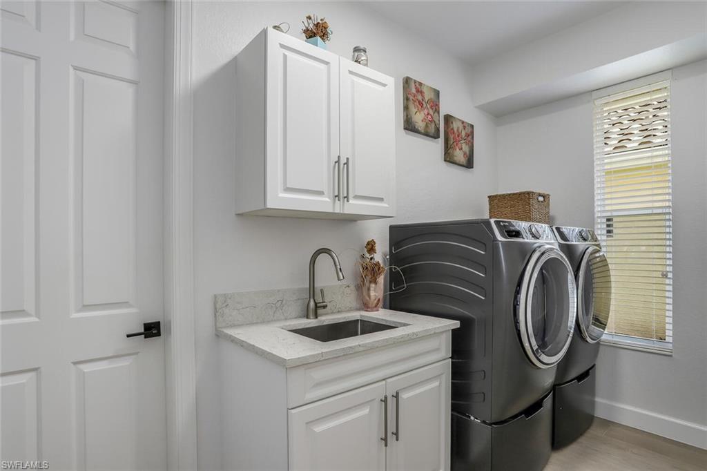 Stunning completely remodeled 4Br/3Ba modern home. Meticulously maintained, endless upgrades throughout. All New: Porcelain tile wood floors throughout the entire home, baseboards, freshly painted walls/ceilings, interior/exterior doors, ceiling fans, Lutron LED + dimmer switches, 12 new shut off valves throughout home, AC serviced w/ sensors replaced controlled by Ecobee Smart Thermostat Premium including all new vent covers. Kitchen offers: Level 5 Quartzite counter tops & backsplash, shaker style cabinetry w/ undermount LED lighting, stainless Thermador appliances w/ Pro Handles, Kinetico's K5 drinking water station w/VOC Guard Reverse Osmosis System that connects to the refrigerator. Great room: Pocketing doors to lanai w/ sun shade, Entertainment wall w/ Italian Porcelain Tile in bronze oxidized metal w/ extended bench wrapped in porcelain tile, 84-inch Built-in Linear Electric Fireplace w/custom fluted wood wall panels on the side in Walnut, home theatre w/ Sony BRAVIA-XR 83` TV w/ custom 10K Red Atom 6'5 surround sound speakers built in ceiling and Sonos Arc BAR w/ Sonos Amp and Apple TV. All 3 baths have been completely remodeled: Master retreat offers: tray ceiling, separate door to lanai, His/Her walk-in closets, European floating vanities, 61` free standing soaking tub, walk-in shower w/ bench seat, glass wall & waterfall shower, bidet & sconce lighting. Pocketing door separates the main area to the 3 guest bedrooms for privacy. Guest Bdr's 1 & 2 have a hallway bath, 3rd bedroom en-suite offers large windows, walk-in closet, entry door to pool/lanai area. Both guest bath upgrades: Porcelain floor to ceiling shower walls & floors, Woodbridge soft close toilets, European floating vanities w/new plumbing, glass sink backsplash, mirrors & vanity lights, Moen Brushed Nickel bathroom fixtures, matte black towel racks & fixtures, ceiling LED light. Upgraded laundry room: Cabinetry, bench seat w/ wall shiplap and hooks, laundry sink w/ Marble top, GE Diamon Smart front load washer/dryer. Lanai offer: Large paver lanai, heated pool w/ water feature, electric awning overlooking preserve. Other features: Freshly painted 2 Full car garage plus golf cart space w/ Epoxy flooring, Roof 2019, Exterior painted in 2021, New pool pump 2024, ADT security system.