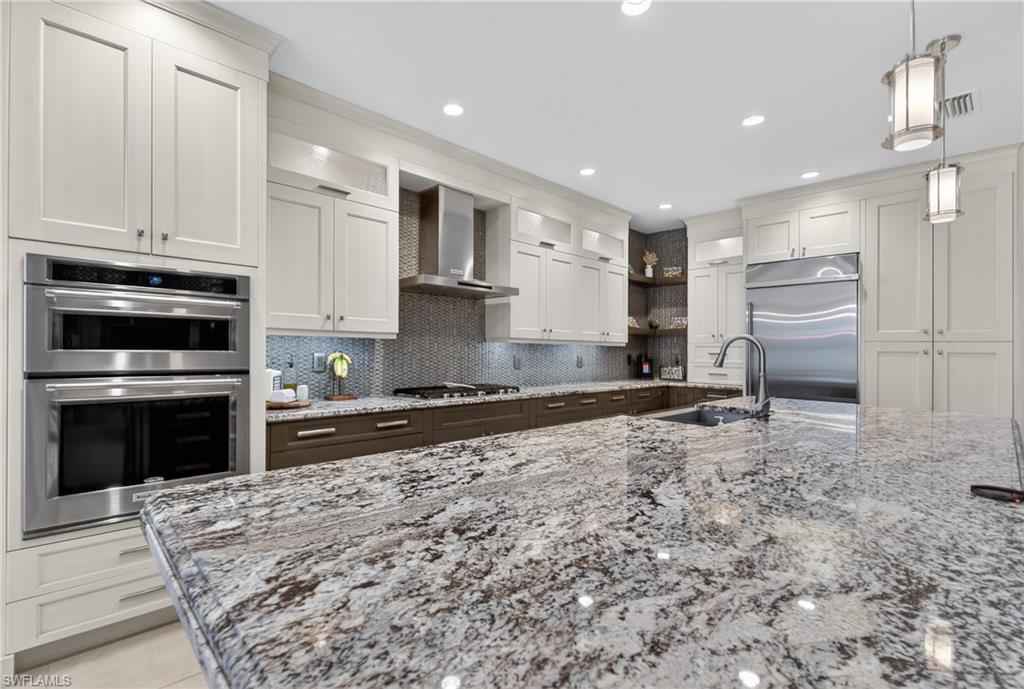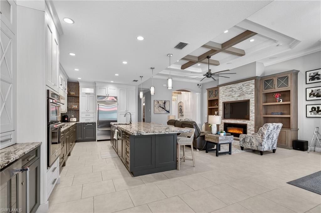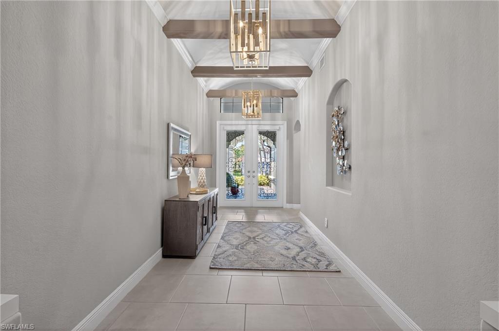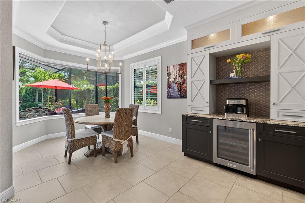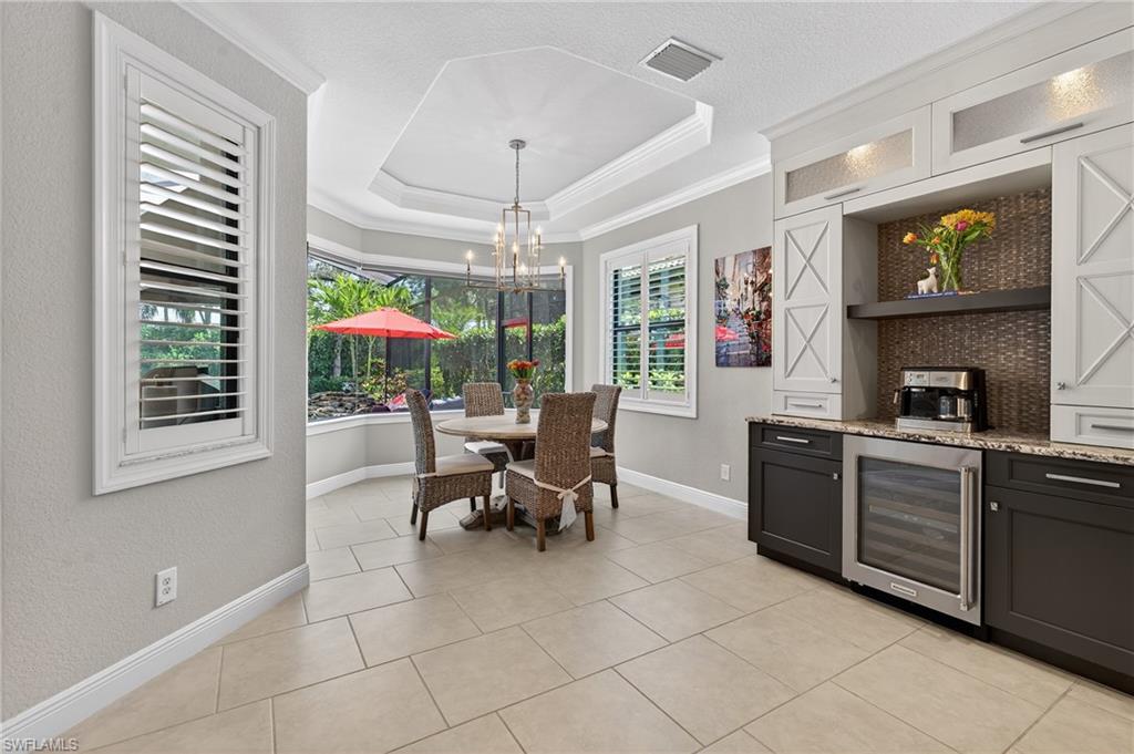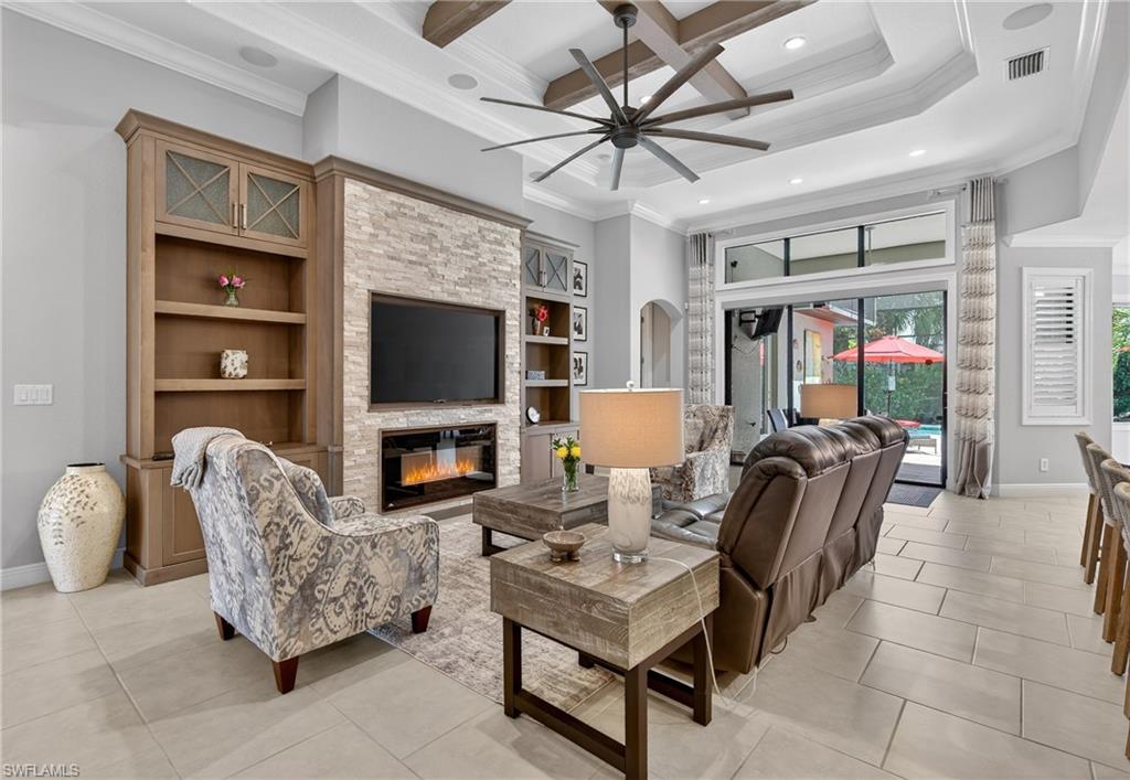 Welcome to 10102 Palazzo Dr, a beautifully customized and turnkey furnished residence in the exclusive gated community of Palazzo at Naples.Custom built and thoughtfully expanded beyond the standard Serino model, this 3-bedroom, 2.5-bath home offers 2,522 square feet of upgraded living space, with all four corners extended an additional four feet and a rare extended 3-car garage.Being offered fully furnished, this home allows for an effortless transitionu2014simply bring your personal belongings and begin enjoying the Naples lifestyle immediately.From the moment you enter through the doors, the craftsmanship is evident. Custom wood ceiling beams, designer lighting, coffered ceilings, and crown molding create architectural depth and character throughout. The great room is anchored by a built-in feature wall with electric fireplace, offering both warmth and refined style ideal for everyday living and entertaining.The chefu2019s kitchen blends elegance and performance with double-thick granite countertops, an oversized island, gas cooktop, built-in wall oven and microwave, wine refrigerator, custom cabinetry, and designer backsplash. Natural gas service adds convenience and long-term value.The primary suite serves as a private retreat with his and hers walk-in closets, tray ceilings, and a spa-inspired bathroom featuring a freestanding soaking tub, upgraded shower, dual vanities, and curated finishes.Outdoors, enjoy your own resort-style setting. The hot tub and heated pool with waterfall and sun shelf are complemented by a custom outdoor kitchen with Alfresco grill, a spacious covered lanai, and lush privacy landscaping, creating seamless indoor-outdoor living.Additional highlights include impact-resistant windows and doors, Sonos whole-home audio, central vacuum, generator transfer switch, and approximately $30,000 in custom garage cabinetry.Palazzo at Naples is an intimate gated enclave with low quarterly HOA fees and a prime North Naples location minutes from I-75, Mercato, Waterside Shops, top-rated dining, and optional golf and pickleball memberships at nearby Quail Creek and Longshore Lake.A rare opportunity to own a thoughtfully upgraded, move-in-ready home in one of North Naplesu2019 most desirable boutique communities.