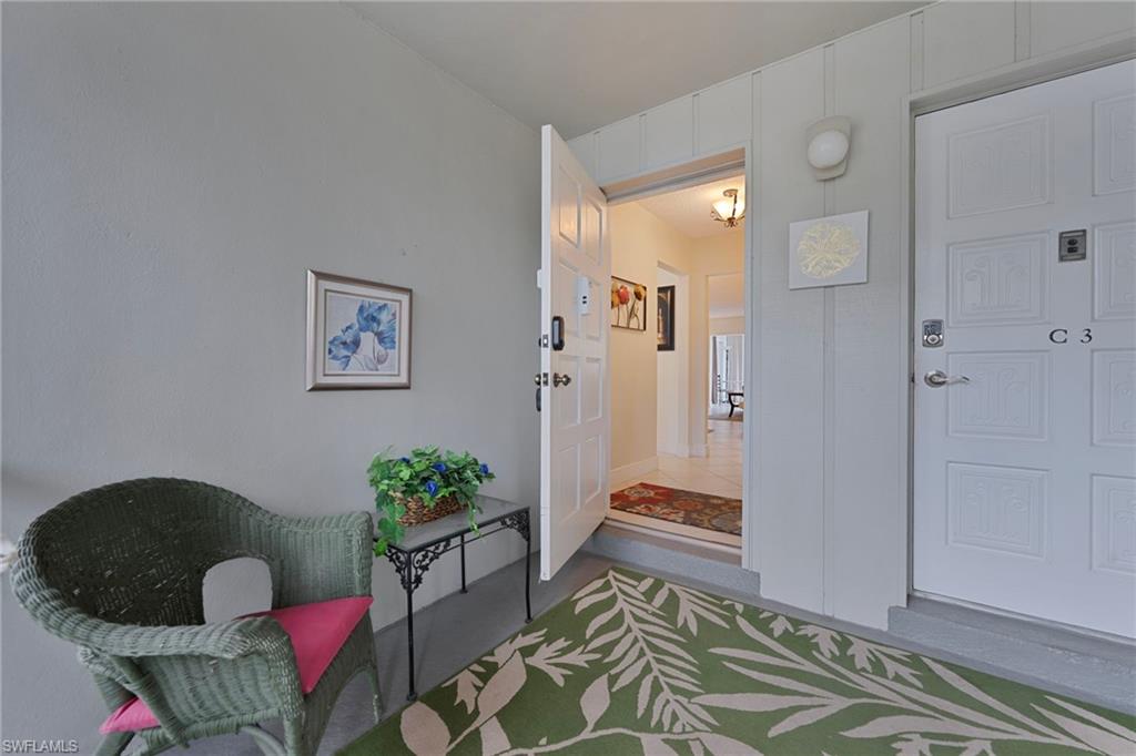 Enjoy easy Southwest Florida living in this first-floor, 2-bedroom, 2-bath end-unit residence, offered turnkey furnished, in the Montego Manor community within Palm River. Offering approximately 1,269 square feet, the split-bedroom floor plan provides privacy and comfortable living space. The light-filled interior features a spacious great room, a versatile Florida room, and a patio with direct access to the landscaped grounds and community pool, creating an ideal indoor-outdoor living experience. The eat-in kitchen offers ample cabinetry, while the primary suite includes dual sinks and a walk-in shower, with a well-positioned guest bedroom and bath. Additional features include in-residence laundry, a detached carport, and guest parking. Montego Manor is a non-gated 55+ community with a community pool and included cable, water, sewer, lawn care, and building insurance. An excellent option for a move-in-ready vacation property or income-producing investment, conveniently located west of I-75 near shopping, dining, and North Naples beaches.