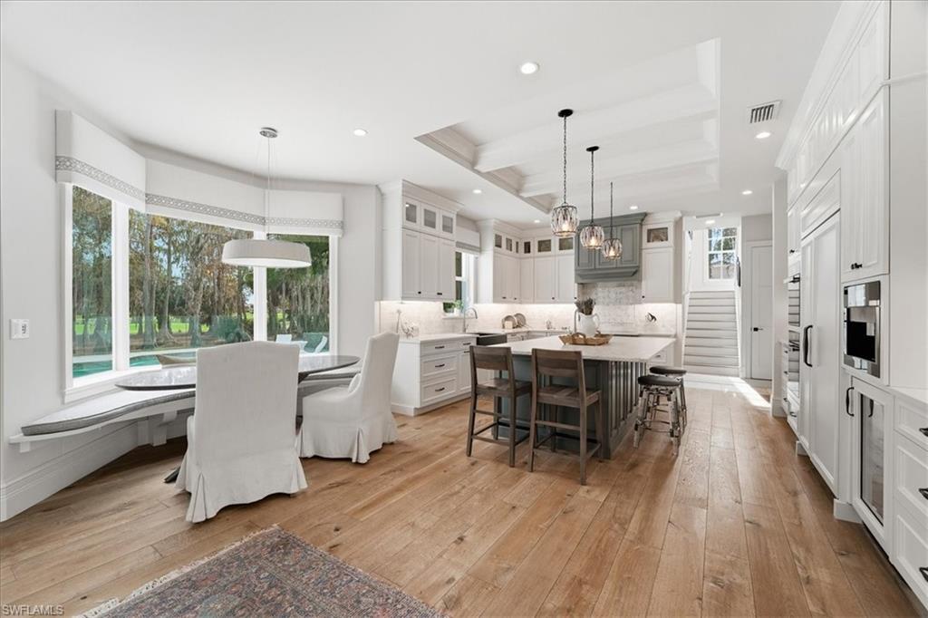 Welcome to 12888 Pond Apple Drive West, a stunning 4-bedroom plus den, 4.5-bath residence that combines timeless architecture with refined interiors, all set within a lush and private oasis. The stately exterior, featuring manicured landscaping, mature palms, and a paver circular driveway, makes an unforgettable first impression. Inside, light-filled living spaces boast soaring ceilings, intricate millwork, and dramatic coffered ceiling designs, exuding elegance and sophistication. The main living area is centered around a striking stone fireplace with custom built-ins, creating a warm yet polished focal point for both everyday living and entertaining. Wide-plank wood flooring flows seamlessly through the main living areas, enhancing the homeu2019s inviting coastal charm. The gourmet kitchen is a chefu2019s dream, offering custom cabinetry, a spacious center island with seating, premium appliances, and designer lighting. Its open-concept design effortlessly connects to the living and dining areas, making it perfect for hosting gatherings of any size. Expansive windows and sliding glass doors flood the home with natural light and provide serene views of the outdoors. Designed for both comfort and versatility, the home also features an upstairs family room, ideal for additional living or recreational space. Step outside to your private outdoor retreat, where a resort-style pool and spa create the ultimate setting for relaxation and entertaining in true Southwest Florida style. Located in the prestigious Quail Creek community, this home offers access to a gated golf lifestyle with 36 holes of golf, which are set to undergo a complete renovation by 2027. Additionally, estate homes in the community will be updated within the next 24 months, further enhancing the neighborhoodu2019s appeal. Just minutes from world-class shopping, dining, beaches, and top-rated schools, this residence delivers the perfect balance of luxury, privacy, and convenience.