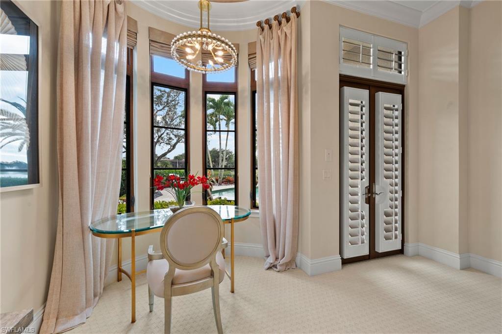 Artfully decorated and designed spaces enhance this McGarvey Domani residence showcases exceptional quality, elegance, and generous scale. Offering over 3,500 square feet of thoughtfully designed living space, the home is ideal for both everyday comfort and effortless entertaining.Custom-designed interiors highlight the open-concept floor plan, while the second levelu2014accessible by elevatoru2014features two en suite bedrooms, a loft, and a private balcony with stunning southern views of the golf course and water. The upgraded kitchen is a chefu2019s delight, complete with elegant white cabinetry, gorgeous quartzite countertops, and designer lighting. Kitchen appliances are all recently updated.The first-floor primary suite offers a tranquil retreat with a sitting area, complemented by a formal dining room and a private den that complete the homeu2019s well-planned layout. Step outside to the sun-drenched lanai featuring retractable screens, an outdoor kitchen, saltwater pool, private pool bath, and picturesque golf course viewsu2014perfect for year-round enjoyment.La Caille HOA enhances the lifestyle with weekly pool maintenance, professional landscaping, and a host of additional amenities, allowing for truly carefree living.