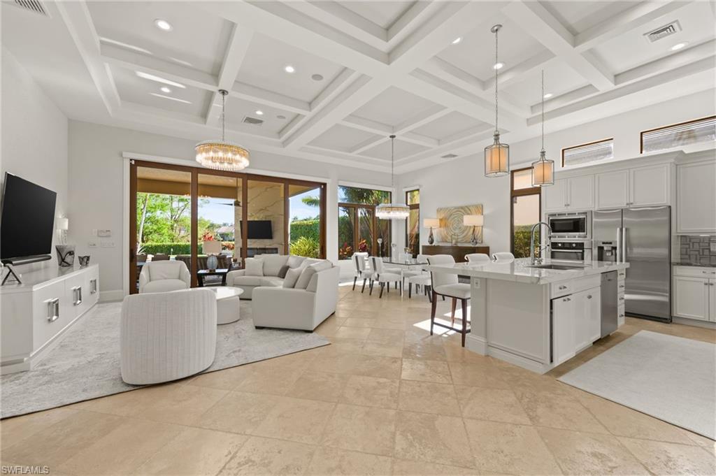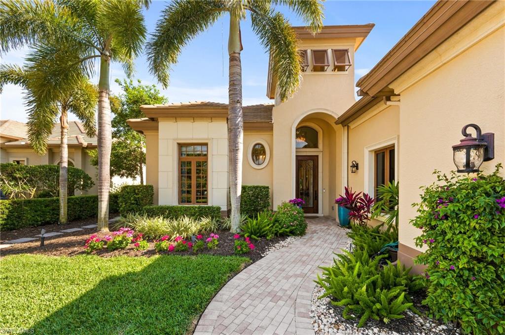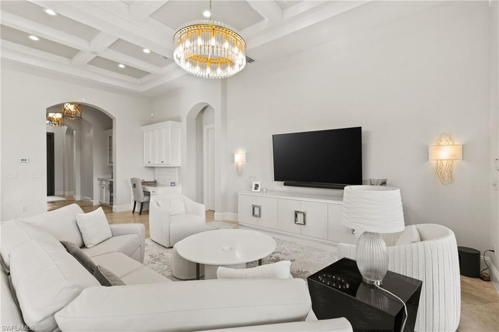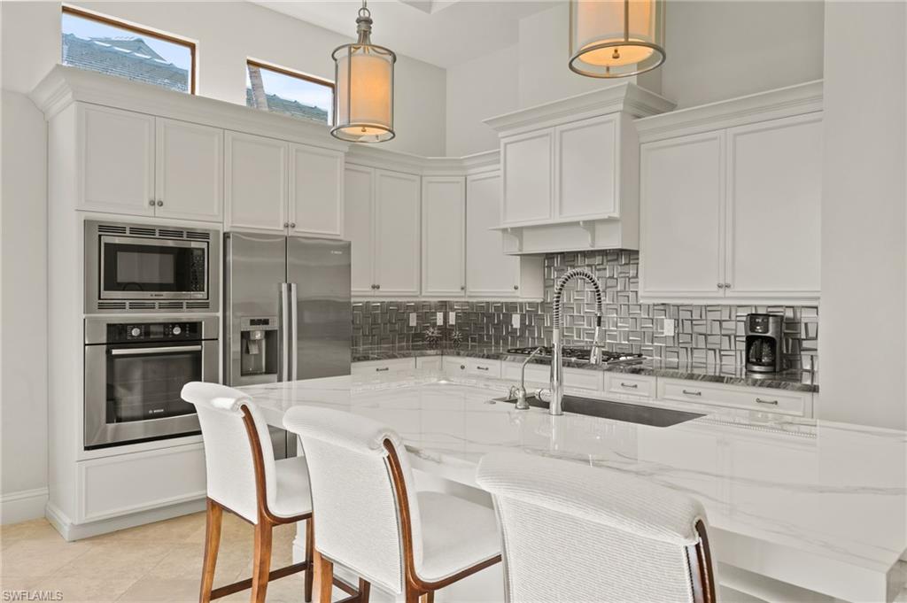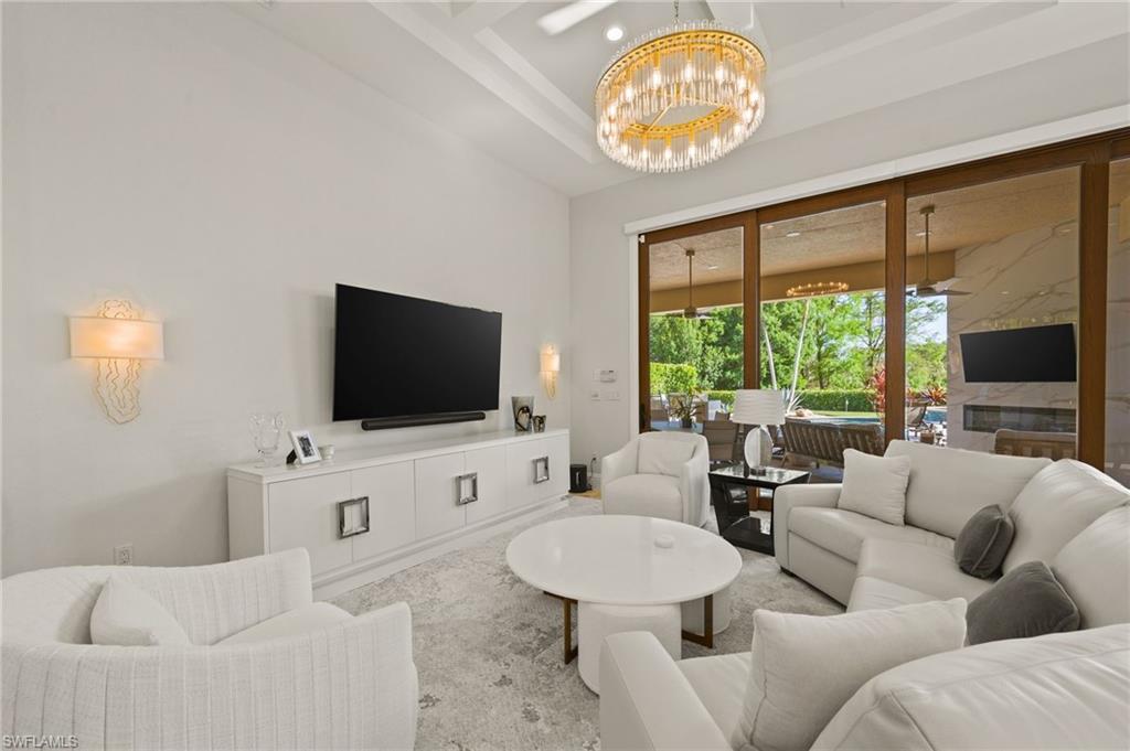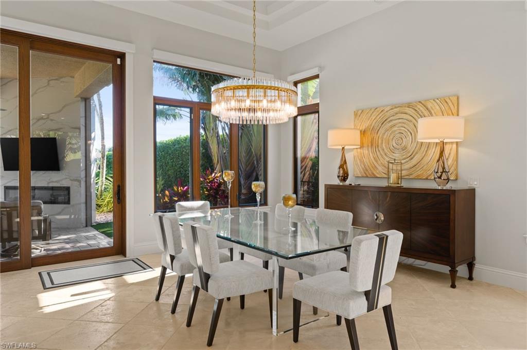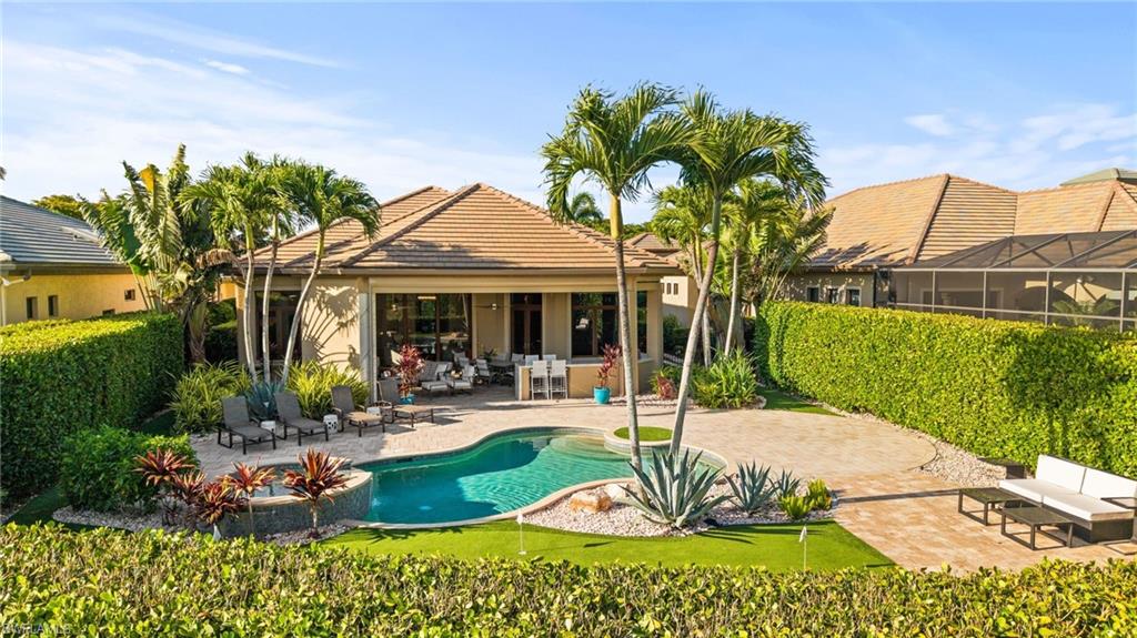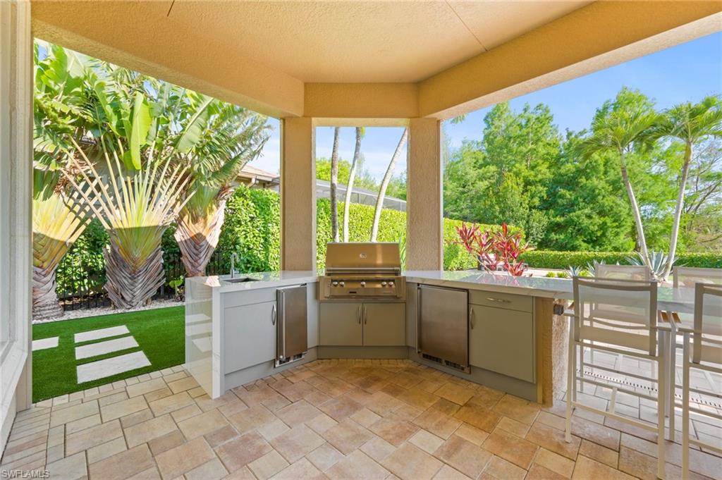 Step into this beautifully updated residence where classic architecture meets modern sophistication. Thoughtfully redesigned by Clive Daniels, this home blends Florida charm with contemporary flair. The open floor plan lends itself to entertaining with a bright and airy great room highlighted by a glamorous TV wall and opening to the gourmet kitchen with white cabinetry, stainless-steel appliances and a reverse osmosis system. The adjacent dining area offers spectacular outdoor views and features Clive Daniel custom-designed furniture and new chandelier lighting. As you tour the home, you will find that every detail has been curated with updated, upgraded elements to elevate the SWFL living experience such as spa-inspired bathrooms, room-darkening shades, stylish wallpaper, new window treatments and lighting. The emphasis is on living spaces for entertaining or simply a quiet retreat. Of course, the highlight of every Florida home is the outdoor space, and this home exceeds anyoneu2019s wish list. Completely re-imagined by Clive Daniels is the new outdoor kitchen featuring a porcelain island and feature wall, new gas fireplace, television and outdoor furniture arranged to accommodate both dining and relaxation. New retractable screens and a new putting green add to this fun-filled space where you can drink in the water, golf and perfect southwest sunset views!
