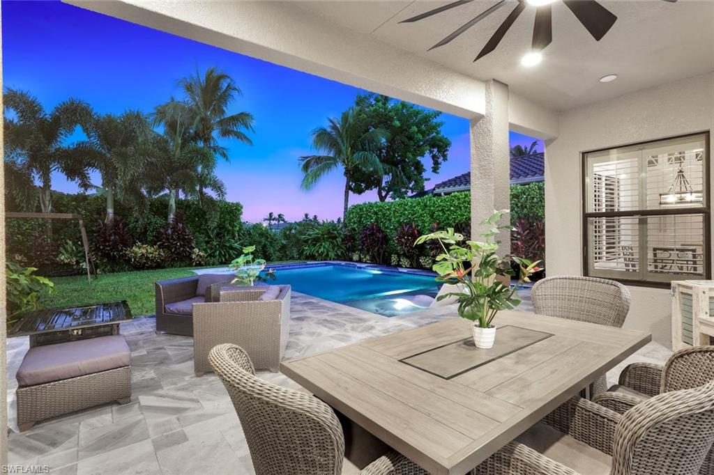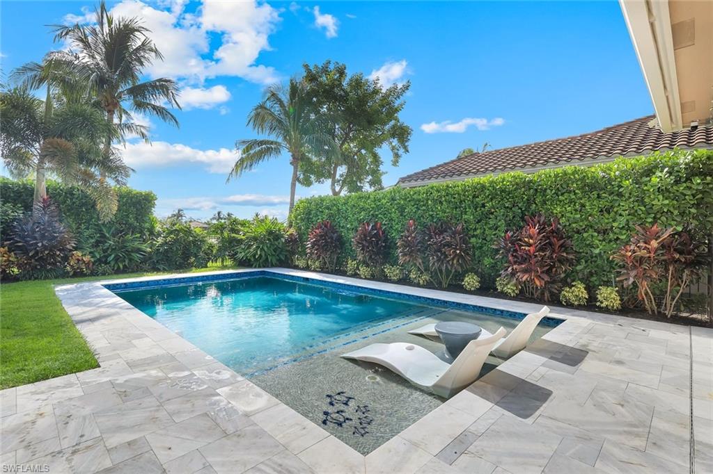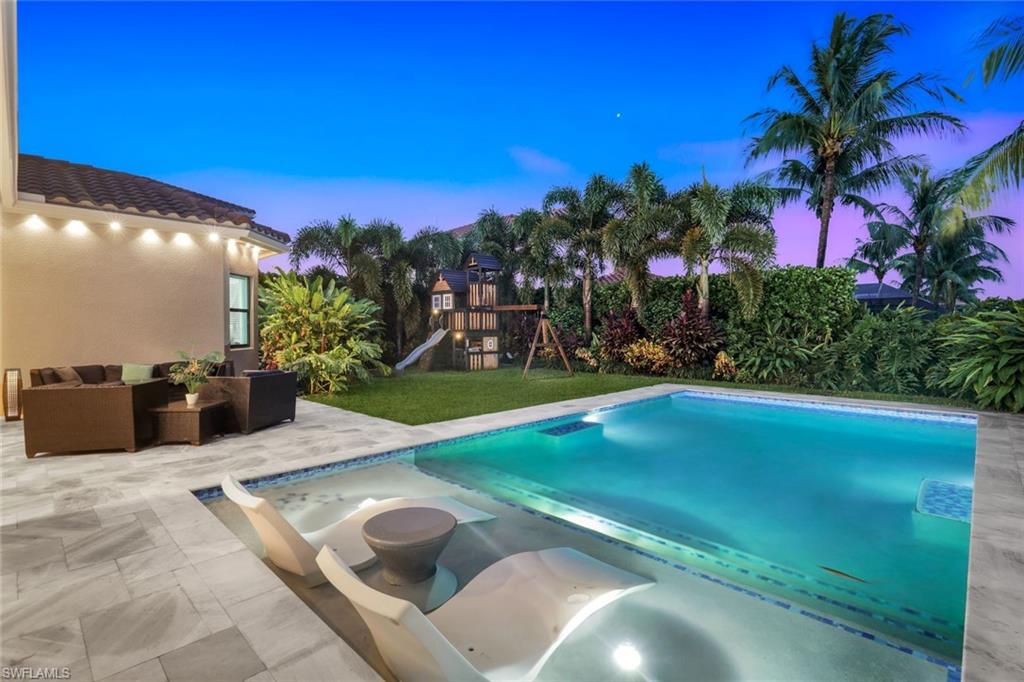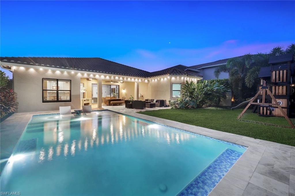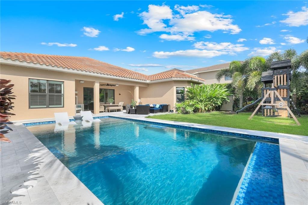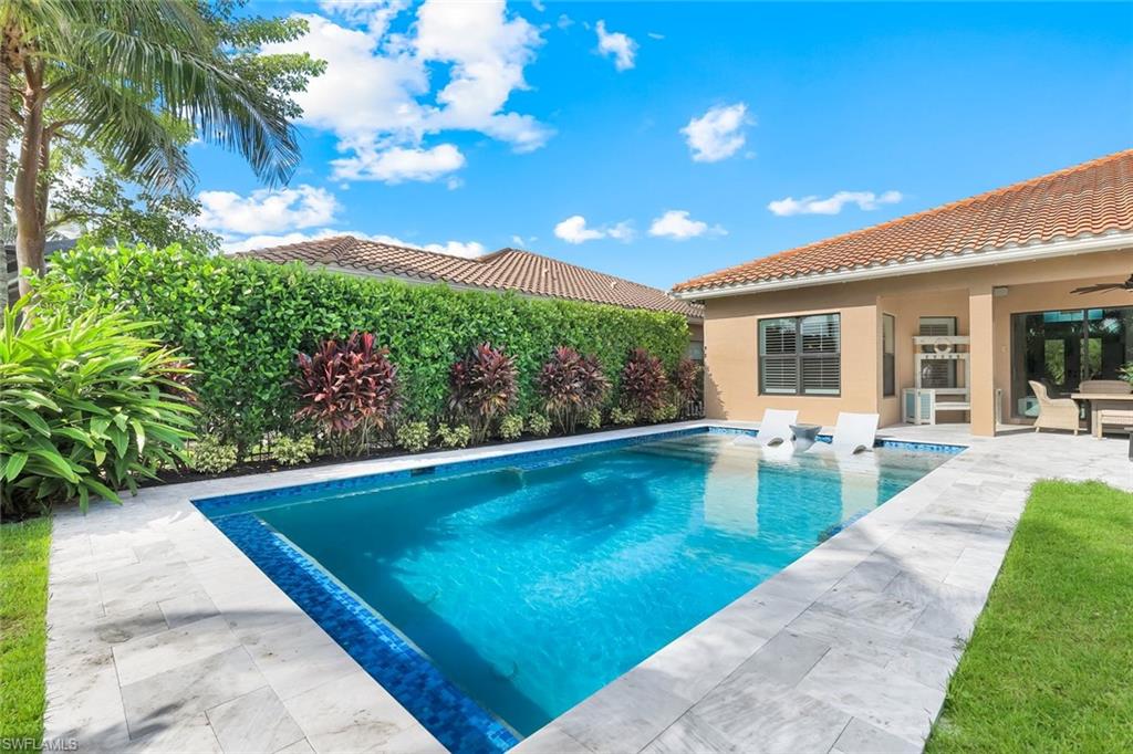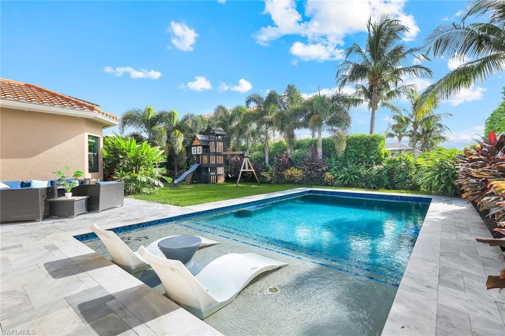 Escape the ordinary and discover your own private oasis. This updated Riverstone home offers 2,609 sq. ft. of beautifully refreshed living space and a backyard designed for both relaxation and playu2014perfect for enjoying the vibrant Naples lifestyle. Step inside and be greeted by a soaring 14-foot foyer that opens to a bright and inviting great room, complete with a custom built-in, shiplap accents and a dramatic double trey ceiling with color-changing uplighting. Entertain with ease in the remodeled gourmet kitchen featuring granite counters, floor-to-ceiling shaker cabinetry with glass accents and lighting, pull-outs, pot drawers, a vented hood, tile backsplash, and a central island. A Samsung Bespoke refrigerator, newer appliances, and a casual dining nook complete the chefu2019s dream space. The spacious primary suite is a true retreat, offering room for a sitting area, two custom walk-in closets, and a stunning updated bath with frameless glass shower, rain head and jets, a liner drain, and re-tiled tub surround. Thereu2019s room for everyone with three additional bedrooms, with versatility to use one as a den, office, or hobby room, plus two guest baths. Fine finishes include built-in closets throughout, LVP flooring, plantation shutters, tall baseboards and crown molding. A finished laundry room with 2024 LG washer/dryer, cabinets, and sink add both function and style. Peace of mind comes with a new A/C system (2024) with UV light and Iflow cleaning system. Out back, discover your own outdoor oasis. A custom, extra-large heated saltwater pool (2022) with sandblasted marble paver lanai anchors a private, fully fenced, landscaped setting. Relax or dine under the covered lanai, enjoy music through outdoor speakers, and let evenings glow with permanent LED soffit lighting. A fenced yard with lush landscaping and playset makes it as practical as it is fun. Located in Riverstone, a social, vacation-inspired community zoned for `A` rated schools. Recreation area includes a fitness center, social hall, resort & lap pools, spa, 5 Har-Tru tennis courts, basketball & pickleball court, tot lot & activities coordinator. Why wait for a vacation to feel tranquility when you can experience paradise every day?