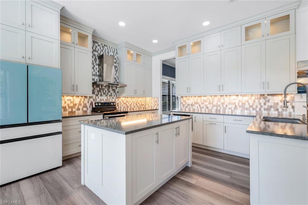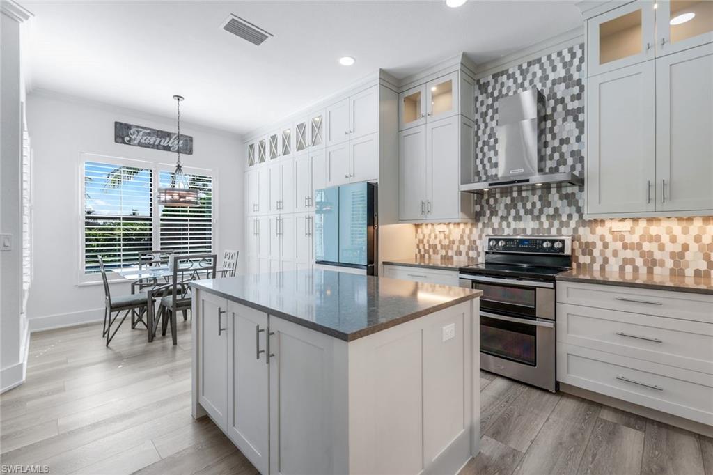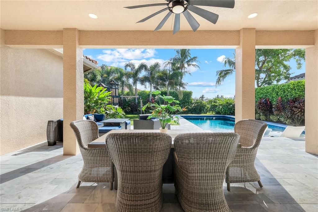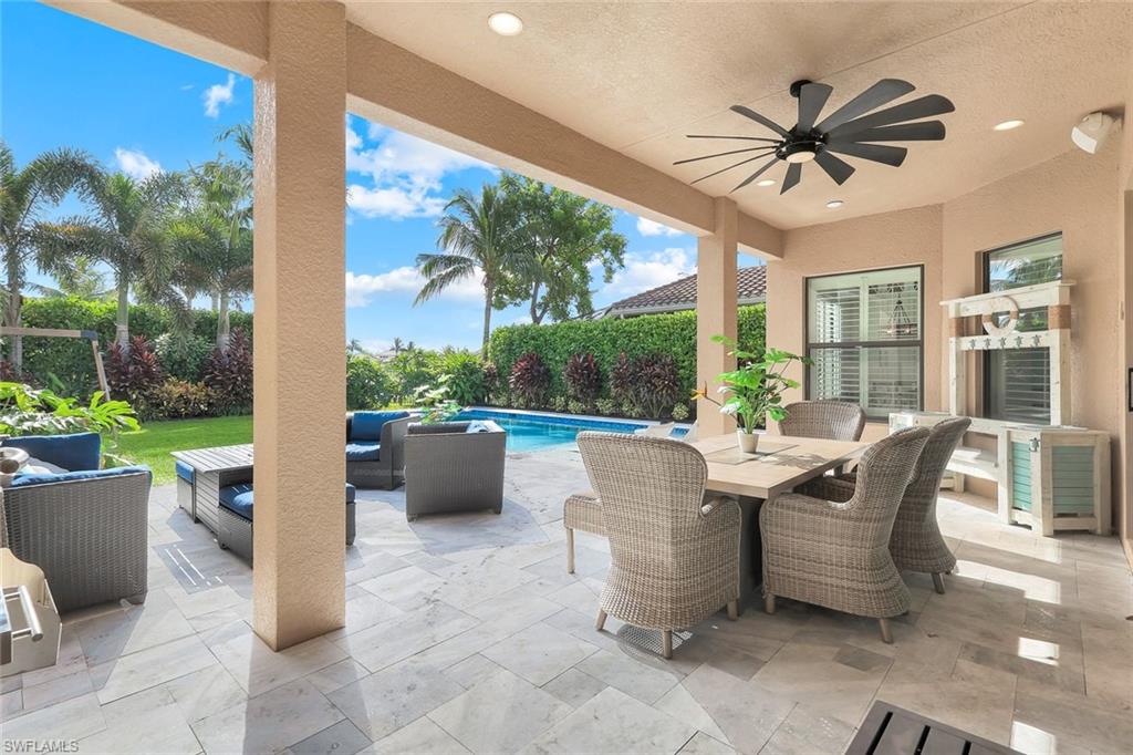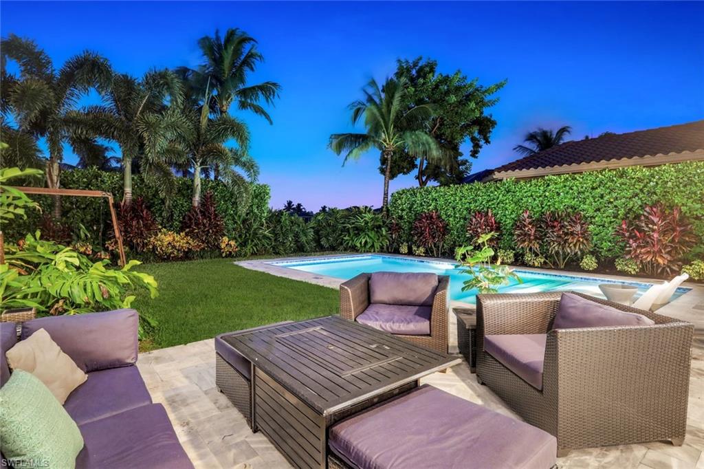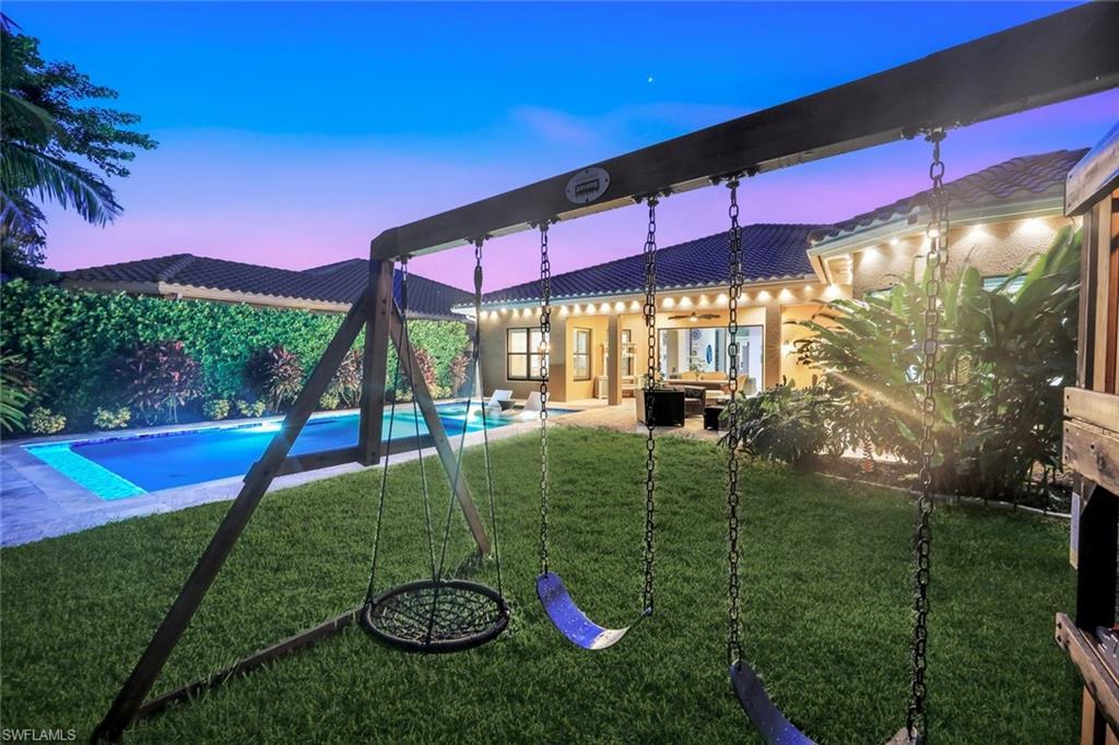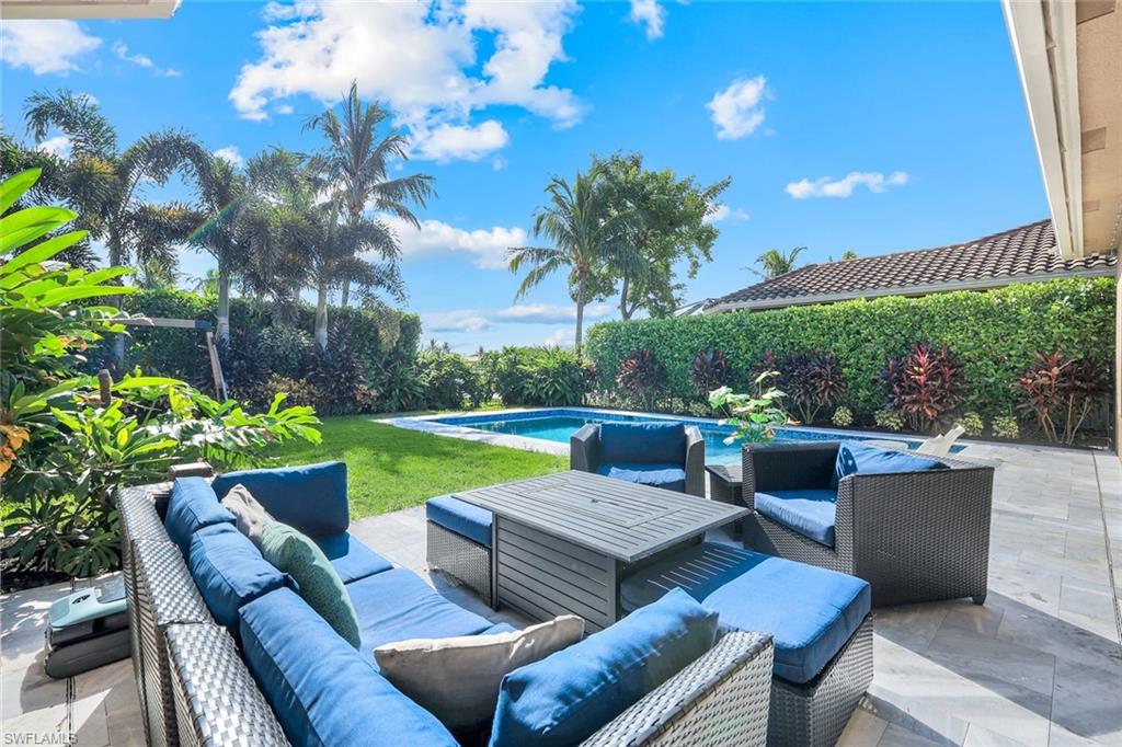 Escape the ordinary and discover your own private oasis. This updated Riverstone home offers 2,609 sq. ft. of beautifully refreshed living space and a backyard designed for both relaxation and playu2014perfect for enjoying the vibrant Naples lifestyle. Step inside and be greeted by a soaring 14-foot foyer that opens to a bright and inviting great room, complete with a custom built-in, shiplap accents and a dramatic double trey ceiling with color-changing uplighting. Entertain with ease in the remodeled gourmet kitchen featuring granite counters, floor-to-ceiling shaker cabinetry with glass accents and lighting, pull-outs, pot drawers, a vented hood, tile backsplash, and a central island. A Samsung Bespoke refrigerator, newer appliances, and a casual dining nook complete the chefu2019s dream space. The spacious primary suite is a true retreat, offering room for a sitting area, two custom walk-in closets, and a stunning updated bath with frameless glass shower, rain head and jets, a liner drain, and re-tiled tub surround. Thereu2019s room for everyone with three additional bedrooms, with versatility to use one as a den, office, or hobby room, plus two guest baths. Fine finishes include built-in closets throughout, LVP flooring, plantation shutters, tall baseboards and crown molding. A finished laundry room with 2024 LG washer/dryer, cabinets, and sink add both function and style. Peace of mind comes with a new A/C system (2024) with UV light and Iflow cleaning system. Out back, discover your own outdoor oasis. A custom, extra-large heated saltwater pool (2022) with sandblasted marble paver lanai anchors a private, fully fenced, landscaped setting. Relax or dine under the covered lanai, enjoy music through outdoor speakers, and let evenings glow with permanent LED soffit lighting. A fenced yard with lush landscaping and playset makes it as practical as it is fun. Located in Riverstone, a social, vacation-inspired community zoned for `A` rated schools. Recreation area includes a fitness center, social hall, resort & lap pools, spa, 5 Har-Tru tennis courts, basketball & pickleball court, tot lot & activities coordinator. Why wait for a vacation to feel tranquility when you can experience paradise every day?