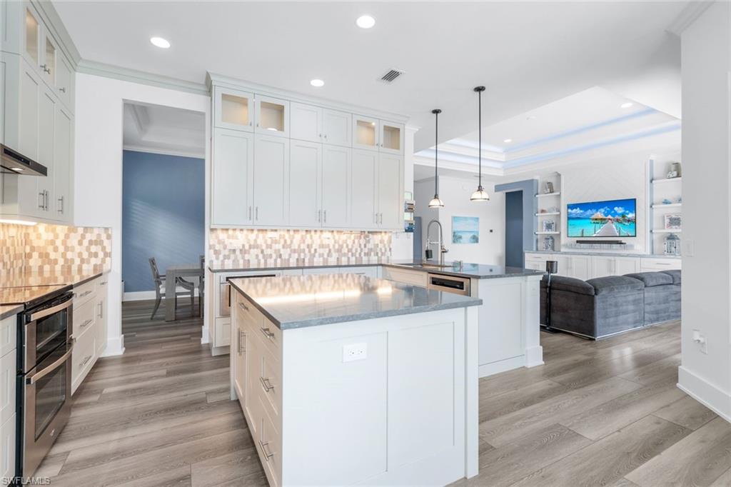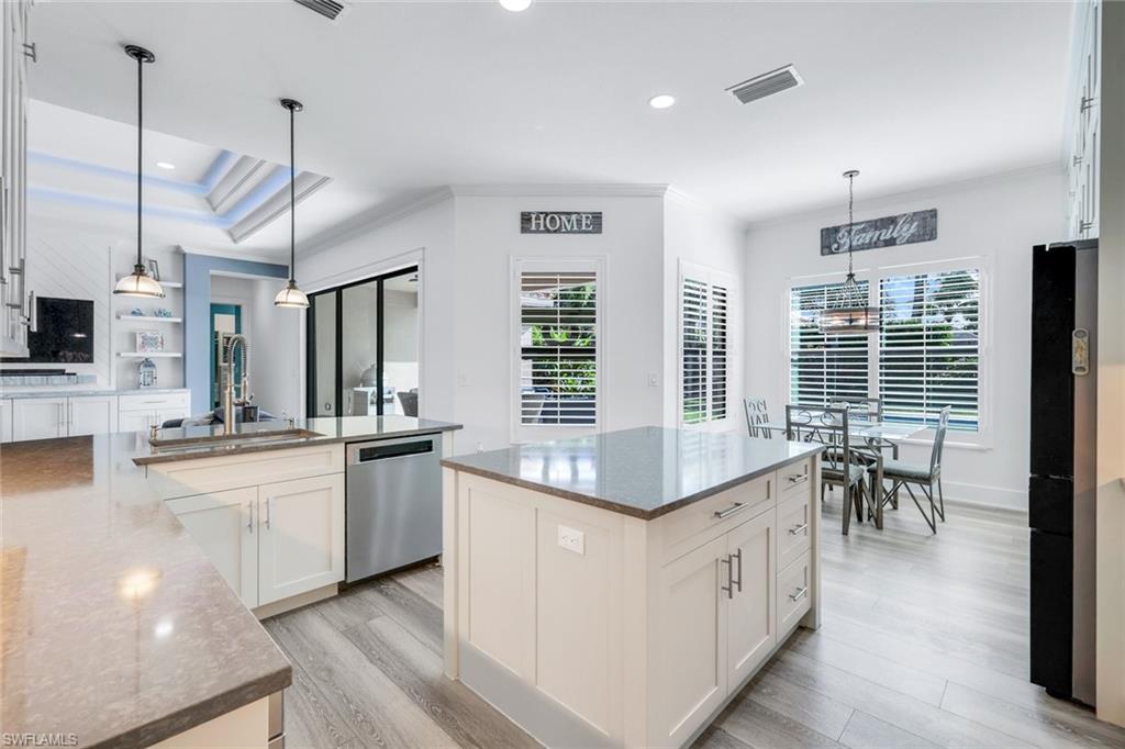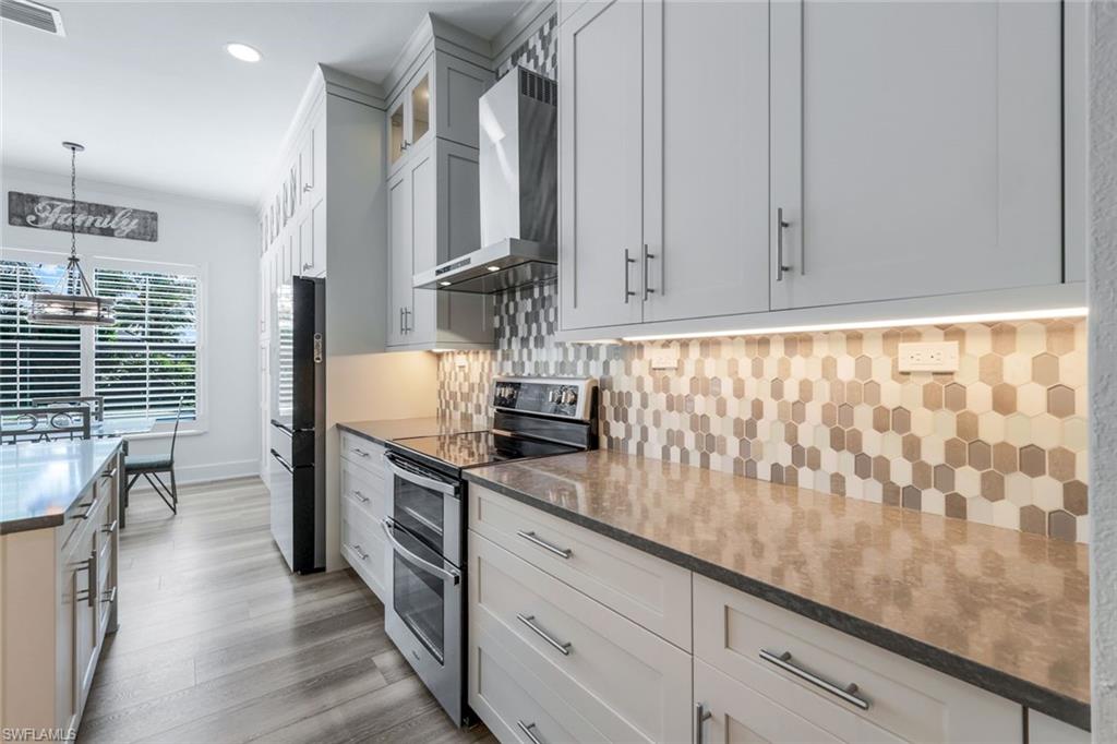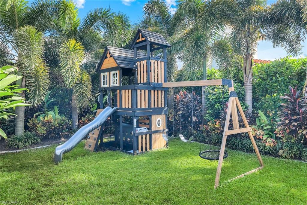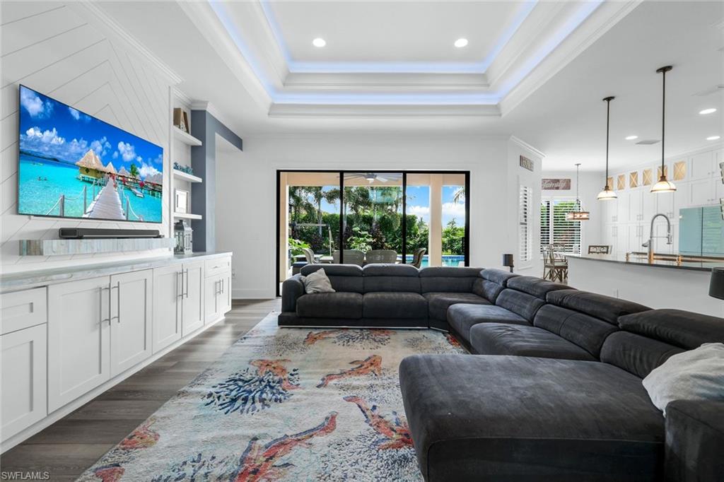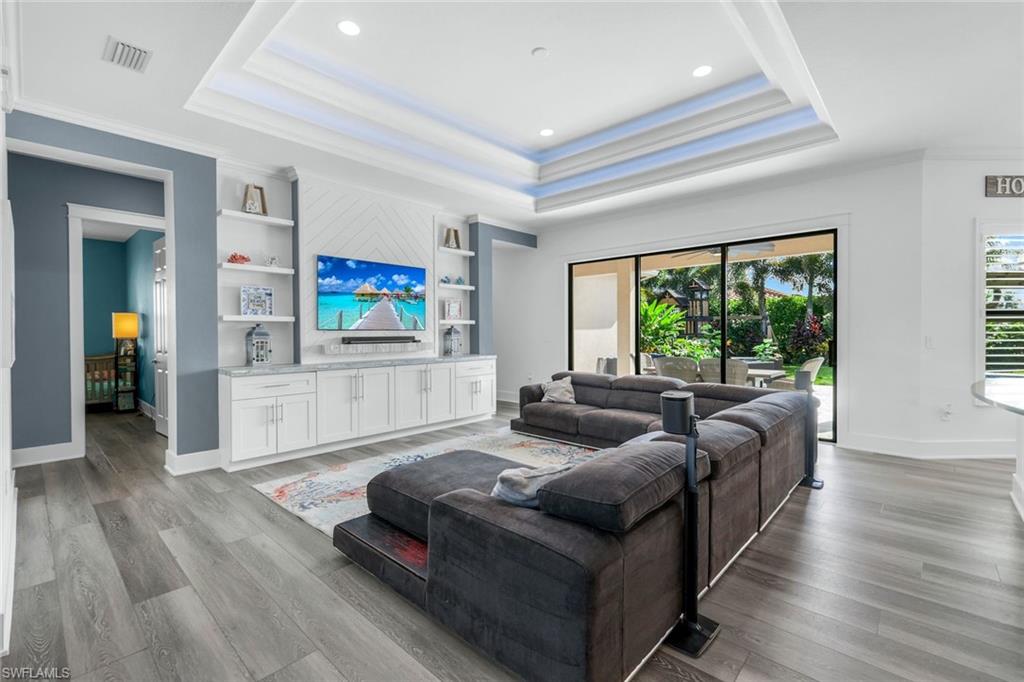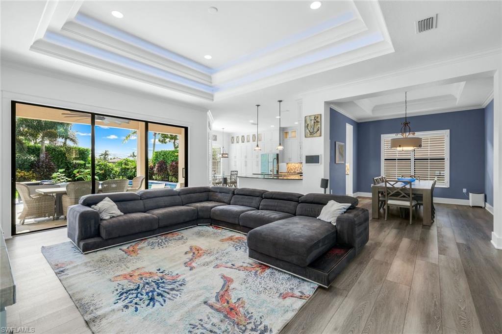 Escape the ordinary and discover your own private oasis. This updated Riverstone home offers 2,609 sq. ft. of beautifully refreshed living space and a backyard designed for both relaxation and playu2014perfect for enjoying the vibrant Naples lifestyle. Step inside and be greeted by a soaring 14-foot foyer that opens to a bright and inviting great room, complete with a custom built-in, shiplap accents and a dramatic double trey ceiling with color-changing uplighting. Entertain with ease in the remodeled gourmet kitchen featuring granite counters, floor-to-ceiling shaker cabinetry with glass accents and lighting, pull-outs, pot drawers, a vented hood, tile backsplash, and a central island. A Samsung Bespoke refrigerator, newer appliances, and a casual dining nook complete the chefu2019s dream space. The spacious primary suite is a true retreat, offering room for a sitting area, two custom walk-in closets, and a stunning updated bath with frameless glass shower, rain head and jets, a liner drain, and re-tiled tub surround. Thereu2019s room for everyone with three additional bedrooms, with versatility to use one as a den, office, or hobby room, plus two guest baths. Fine finishes include built-in closets throughout, LVP flooring, plantation shutters, tall baseboards and crown molding. A finished laundry room with 2024 LG washer/dryer, cabinets, and sink add both function and style. Peace of mind comes with a new A/C system (2024) with UV light and Iflow cleaning system. Out back, discover your own outdoor oasis. A custom, extra-large heated saltwater pool (2022) with sandblasted marble paver lanai anchors a private, fully fenced, landscaped setting. Relax or dine under the covered lanai, enjoy music through outdoor speakers, and let evenings glow with permanent LED soffit lighting. A fenced yard with lush landscaping and playset makes it as practical as it is fun. Located in Riverstone, a social, vacation-inspired community zoned for `A` rated schools. Recreation area includes a fitness center, social hall, resort & lap pools, spa, 5 Har-Tru tennis courts, basketball & pickleball court, tot lot & activities coordinator. Why wait for a vacation to feel tranquility when you can experience paradise every day?