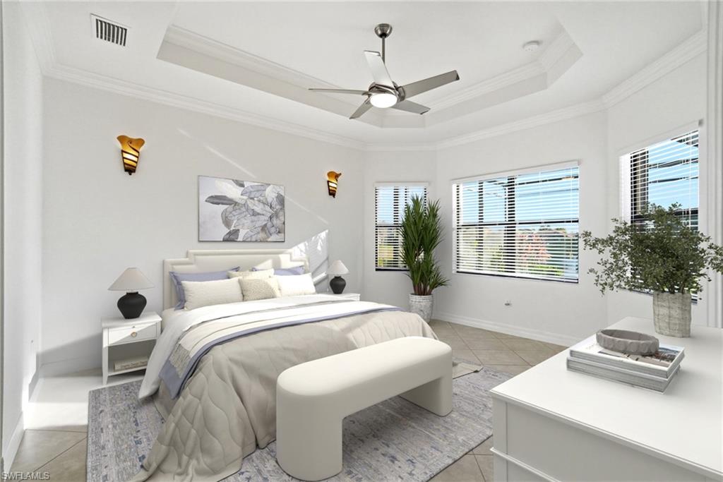 Southern lake views and expansive living space define this thoughtfully maintained Tribeca residence in Riverstone. Offering over 2,200 square feet with 3 bedrooms plus a den, the layout is designed for both everyday comfort and sophisticated entertaining. A standout feature of the home is the extended, screened lanai, which captures desirable Southern exposure and peaceful water viewsu2014an ideal setting for morning coffee or sunset relaxation. The open-concept interior connects seamlessly to the outdoors, filling the home with natural light throughout the day. Tile flooring runs through the entire home, complemented by double crown molding for a polished, finished look. The kitchen features recessed lighting, a newer refrigerator, and overlooks the dining area and living room. French doors open to a dedicated den, providing a flexible space well-suited for a home office. Privately positioned, the primary suite enjoys serene lake views, a tray ceiling, two walk-in closets, and a spacious bath with dual vanities, a soaking tub, and a separate shower. Notable improvements include a 2023 AC, a motorized storm screen on the lanai, accordion storm shutters, and added garage wall shelving for practical storage. Located within Riverstone u2014 one of North Naplesu2019 most sought-after gated communities u2014 residents enjoy a staffed entry, grand clubhouse, resort-style pool & spa, lap pool, fitness center, tennis courts, pickleball, basketball, and a community playground. Dining, shopping, Gulf beaches, Mercato, Waterside Shops, top-rated schools, and RSW Airport are all easily accessible, while the community itself remains comfortably tucked away. With a peaceful lakefront backdrop and generous living space, this home presents an exceptional opportunity to enjoy the Riverstone lifestyle.