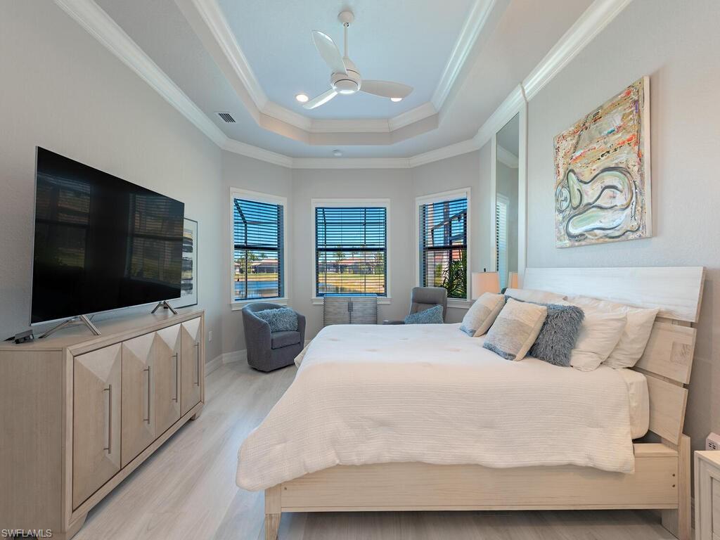 Paradise awaits in this beautifully updated Chandon floor plan, perfectly suited as a Naples winter retreat or an effortless full-time residence where everyday living feels like a vacation. From the moment you open the front door, the tranquil lake view sets the tone, drawing your eye through the home and out to the inviting lanai beyond. Designed to embrace the Naples outdoor lifestyle, the screened lanai offers the ideal setting for relaxed afternoons and effortless entertainingu2014dine alfresco under covered seating, unwind in the spa as the sun sets over the water, or cool off in the sparkling pool after a day spent enjoying the Florida sunshine. Inside, a bright, open-concept layout allows the home to live and entertain seamlessly. The great room flows into formal & casual dining areas and a light-filled kitchen, creating a welcoming space where guests can mingle comfortably. The chef-inspired kitchen serves as both a stylish focal point and gathering place, featuring new quartz counters and backsplash, a distinctive curved island, Alabaster Maple cabinetry, a new single-bowl granite composite sink, new Kohler faucet, stainless steel appliances, and ambient lighting that enhances the homeu2019s warm, coastal feel. A thoughtfully designed split-bedroom layout provides privacy for owners and guests alike. The primary suite is a serene retreat with calming lake views, custom floor-to-ceiling framed mirrors, two walk-in closetsu2014one with custom built-insu2014and an ensuite bath that evokes a private spa. Guest bedrooms are comfortably tucked away, while all baths retain their classic Alabaster Maple cabinetry and framed mirrors, they are now complemented by refreshed quartz countertops and modern rectangular sinks. A versatile den with glass French doors and custom built-in offers the perfect space for a home office, reading room, or optional guest area. Additional features include 18-inch tile laid on the diagonal, Berry Alloc laminate flooring in the bedrooms, crown molding, window treatments, Minka ceiling fans, Nelson pendant lighting, landscape lighting, newer HVAC (2023) and a finished laundry room with upper cabinetry and a utility sink for added convenience. Located in Riverstone, a vibrant, vacation-inspired community for all ages in North Naples, just minutes from I-75 and zoned for A-rated schools. Residents enjoy a fitness center, social hall, resort-style pool, lap pool, spa, five lighted tennis courts, outdoor basketball and pickleball, a full indoor basketball court, tot lot, childrenu2019s water play area, game room, and an activities coordinator; making it easy to meet new friends. This home and community deliver relaxed sophistication, effortless indoor-outdoor living, and the unmistakable feeling that youu2019re exactly where youu2019re meant to be.