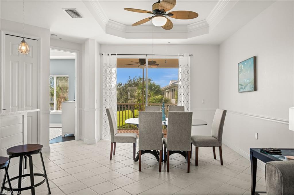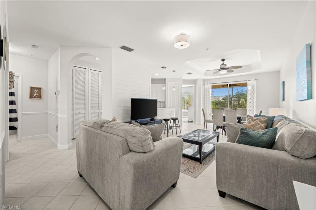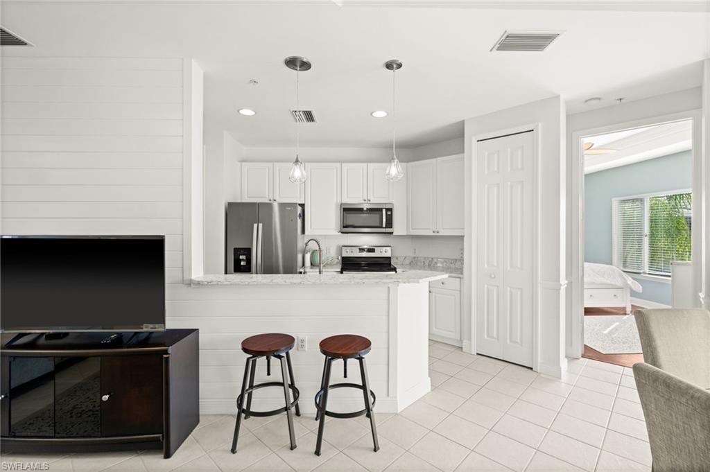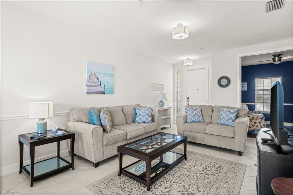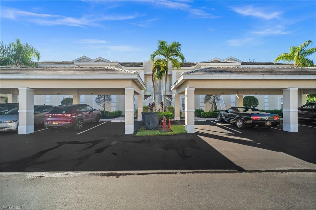 Welcome to Sweetwater Bay in Sterling Oaks, a gated, resort-style community ideally located in North Naples. This spacious second-floor condo offers 2 bedrooms and a den, 2 bathrooms, and 1,297 square feet for an open and welcoming layout. Great for entertaining friends and family, the kitchen features quartz countertops, newer stainless-steel appliances, and bar seating. Enjoy the minimal upkeep of tile and laminate flooring throughout. The den with French doors offers flexible use as a home office or guest space, while the private screened lanai with southwestern exposure is the perfect place to unwind and take in the beautiful Southwest Florida sunsets. The primary suite includes a walk-in closet and an en-suite bath with walk-in shower. Brand new A/C (Oct 2025) and dishwasher. Additional conveniences include laundry within the unit, a private storage closet off the lanai, and an assigned covered carport space. Experience the best of Naples living at Sterling Oaks, where amenities include a Jr. Olympic-sized pool and spa, cabana bar for poolside dining and drinks, fitness center with sauna and locker rooms, clubhouse with restaurant and bar, bocce, pickleball, children's play area, and scenic walking paths. Optional tennis membership provides access to 12 Har-Tru courts, USTA programs, clinics, and competitive play. All this just minutes from world-class beaches, shopping, and dining. Whether you're looking for a seasonal retreat or full-time residence, you've found home in Sweetwater Bay. Paradise awaits!
