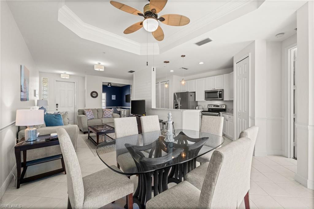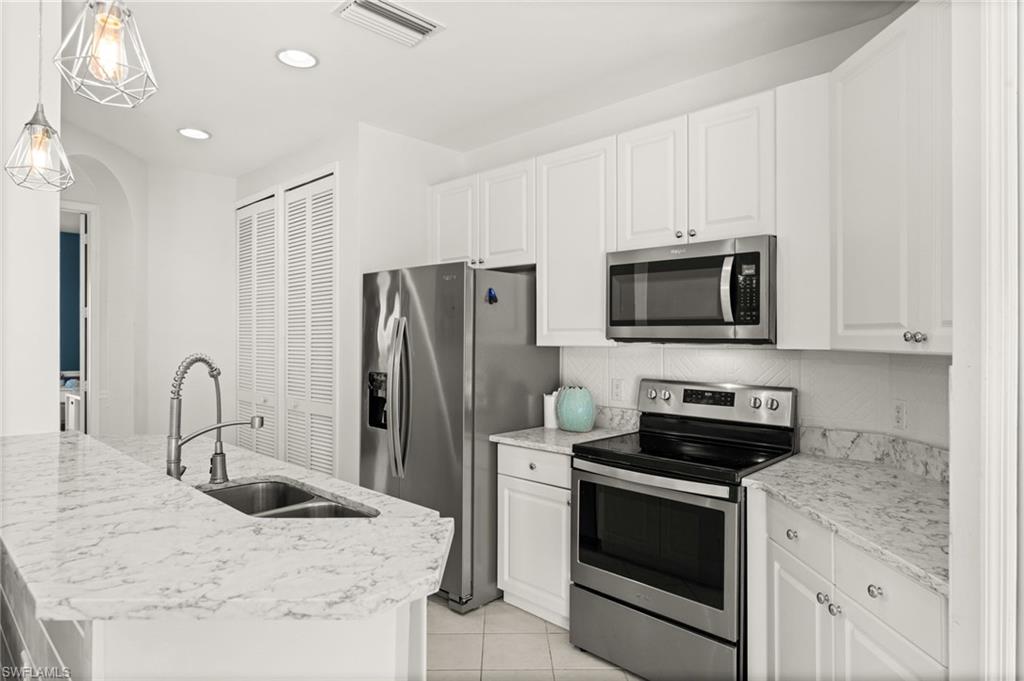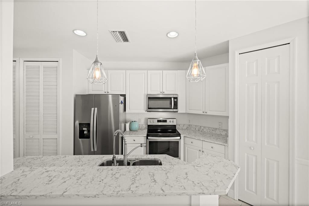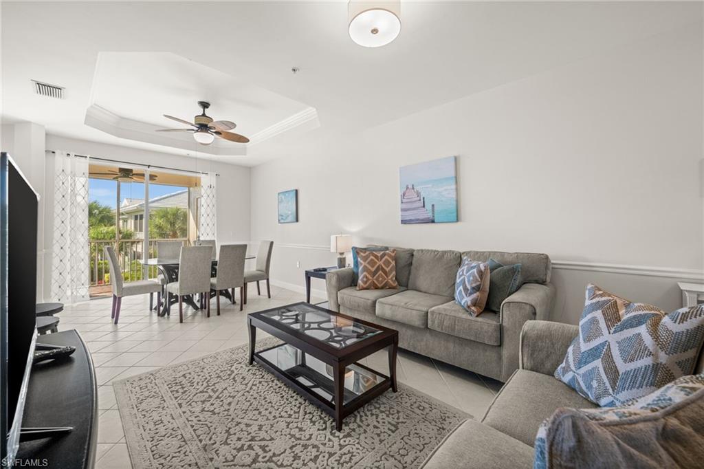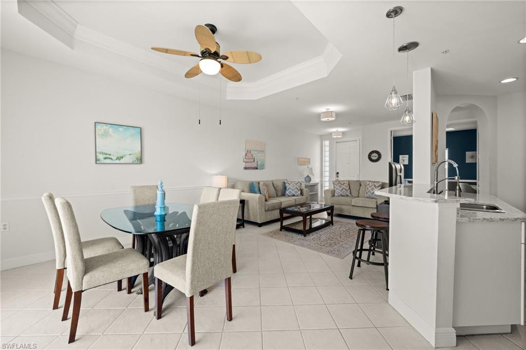 Welcome to Sweetwater Bay in Sterling Oaks, a gated, resort-style community ideally located in North Naples. This spacious second-floor condo offers 2 bedrooms and a den, 2 bathrooms, and 1,297 square feet for an open and welcoming layout. Great for entertaining friends and family, the kitchen features quartz countertops, newer stainless-steel appliances, and bar seating. Enjoy the minimal upkeep of tile and laminate flooring throughout. The den with French doors offers flexible use as a home office or guest space, while the private screened lanai with southwestern exposure is the perfect place to unwind and take in the beautiful Southwest Florida sunsets. The primary suite includes a walk-in closet and an en-suite bath with walk-in shower. Brand new A/C (Oct 2025) and dishwasher. Additional conveniences include laundry within the unit, a private storage closet off the lanai, and an assigned covered carport space. Experience the best of Naples living at Sterling Oaks, where amenities include a Jr. Olympic-sized pool and spa, cabana bar for poolside dining and drinks, fitness center with sauna and locker rooms, clubhouse with restaurant and bar, bocce, pickleball, children's play area, and scenic walking paths. Optional tennis membership provides access to 12 Har-Tru courts, USTA programs, clinics, and competitive play. All this just minutes from world-class beaches, shopping, and dining. Whether you're looking for a seasonal retreat or full-time residence, you've found home in Sweetwater Bay. Paradise awaits!