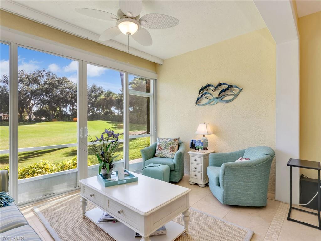 Welcome to this inviting first floor condo in the Carrington neighborhood of Stonebridge, offering comfortable living with one of the best views in the community. This 2 bedroom, 2 bathroom home overlooks the 14th hole green, giving you a front row seat to peaceful golf course scenery. The property is offered turnkey, making it easy to move right in and start enjoying the Stonebridge lifestyle. Inside, the layout feels open and welcoming, with plenty of natural light and an easy flow from the main living area to the kitchen and lanai. The home features plantation shutters throughout, adding a clean, classic touch and enhancing both privacy and style. The updated kitchen features modern finishes, good storage, and a bright breakfast nook. The primary bedroom is spacious and features a tray ceiling for added character. The attached primary bath includes dual sinks and a walk-in shower, offering both comfort and convenience. A guest bedroom and full guest bath provide a private space for visitors. One of the highlights of this home is the impact glassed lanai, which lets you enjoy the gorgeous golf course view in comfort throughout the year. Whether youu2019re relaxing in the afternoon or enjoying evening breezes, this space truly elevates the home. The building also received a new roof in 2019, the unit has a new AC system in 2023 and water heater in 2020 providing added peace of mind. Living in Stonebridge means enjoying a highly sought after country club lifestyle with amenities that include an 18-hole championship golf course, tennis, a fitness center, dining options, and an active social scene. All of this just minutes from Naplesu2019 beaches, shopping, and restaurants.