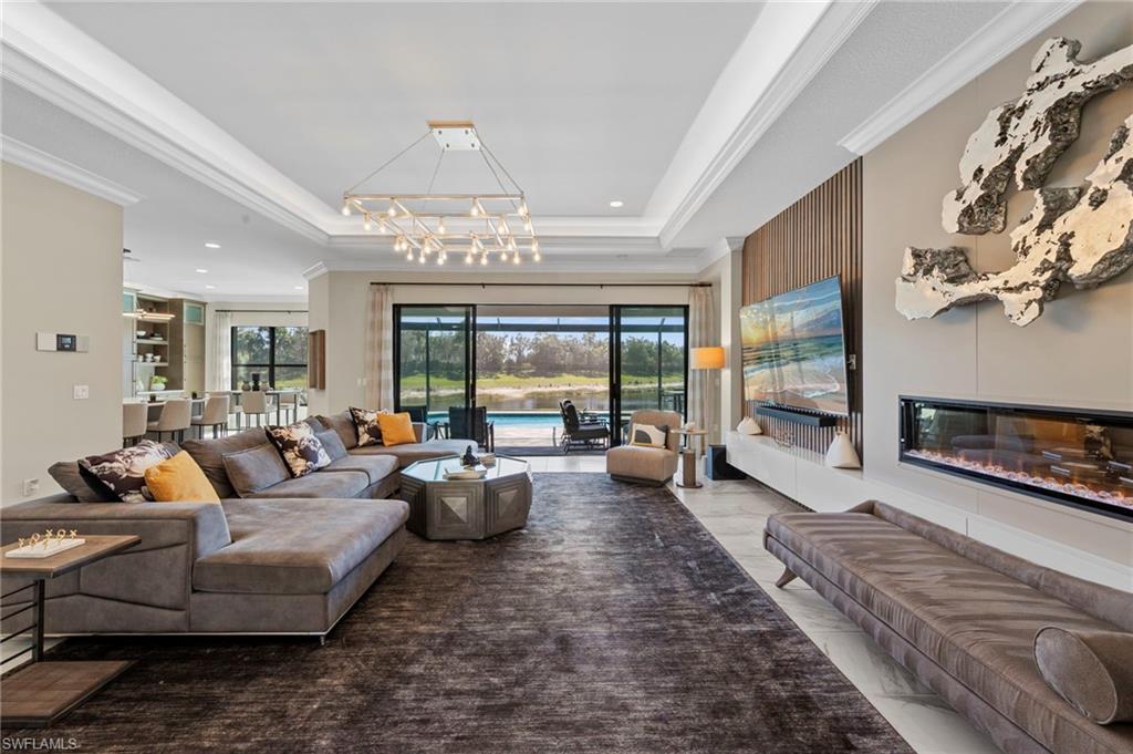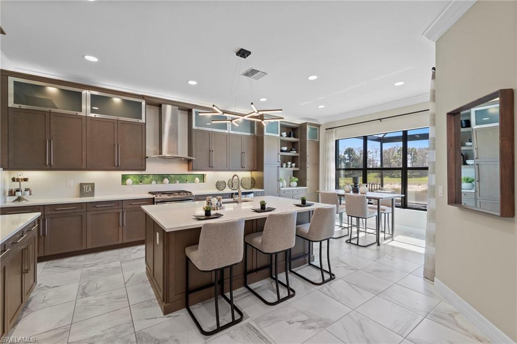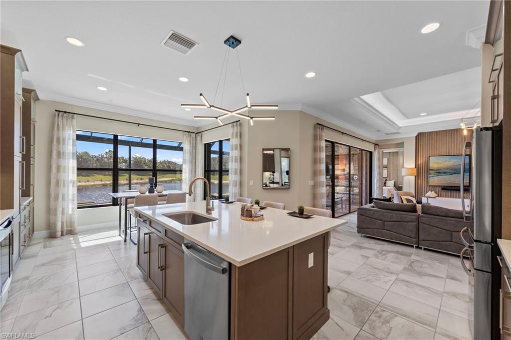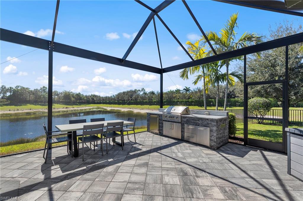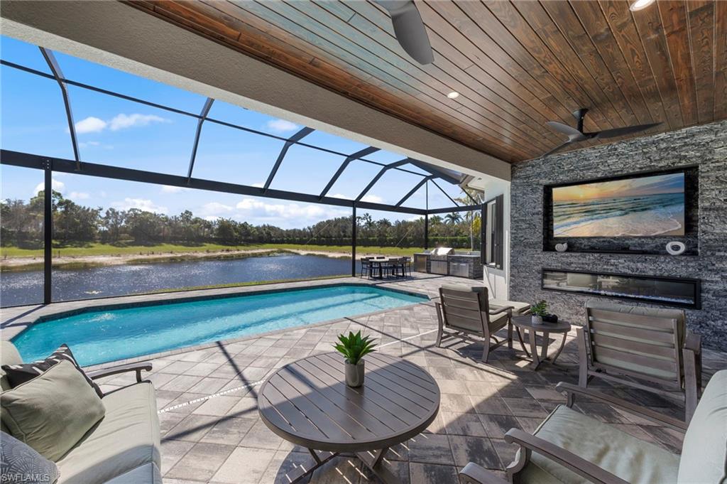 Positioned on a private cul-de-sac within Stonecreek, this former GL Homes Bellagio model showcases premium finishes, exceptional craftsmanship, and one of the most desirable settings in the community. Set on an oversized pie-shaped pie-shaped lot with highly sought-after southern exposure, the home captures long, tranquil lake views and all-day natural light across its expansive outdoor living spaces. Offering 3 bedrooms plus a den and 3 full baths, this residence lives like new and is being offered turnkey for a seamless move-in experience. Custom woodwork and designer detailing elevate the interior, creating a refined yet comfortable atmosphere throughout. The kitchen is thoughtfully designed with abundant cabinetry, a gas range, and a layout that flows effortlessly into the main living and dining areas, ideal for both everyday living and entertaining. The den features custom built-ins, providing a polished and functional workspace. The primary suite is a private retreat with sweeping lake views, custom trim accents, dual walk-in closets with built-in organizers, and a spacious ensuite bath complete with dual sinks, a soaking tub, and a separate walk-in shower. Outdoor living is equally impressive. The expansive lanai overlooks the private lake and features a heated saltwater pool, a sutoma wood-paneled ceiling, built-in fireplace with a stone accent wall, and a custom gas grillu2014creating a true extension of the home designed for year-round enjoyment. Accordion shutters throughout provide added peace of mind. Beyond the home itself, Stonecreek delivers a resort-style lifestyle centered around its 13,676-square-foot clubhouse and 6.25-acre recreation complex. Residents enjoy a social hall with catering kitchen, indoor sports court, card and game rooms, media room, multi-purpose fitness spaces, and a fully equipped fitness center. Multiple aquatic amenities include a resort-style pool, lap pool, whirlpool spa, and splash park. Sports enthusiasts appreciate the Har-Tru tennis courts, pickleball courts, basketball, and beach volleyball, while outdoor gathering spaces such as the tiki bar, fire pit, and lake overlook pavilion create the perfect setting for socializing. A full-time lifestyle director curates events and activities year-round, and miles of sidewalks wind throughout the beautifully landscaped community. This is a rare opportunity to own a former model home on a premier lot while enjoying one of Naplesu2019 most amenity-rich gated communities.