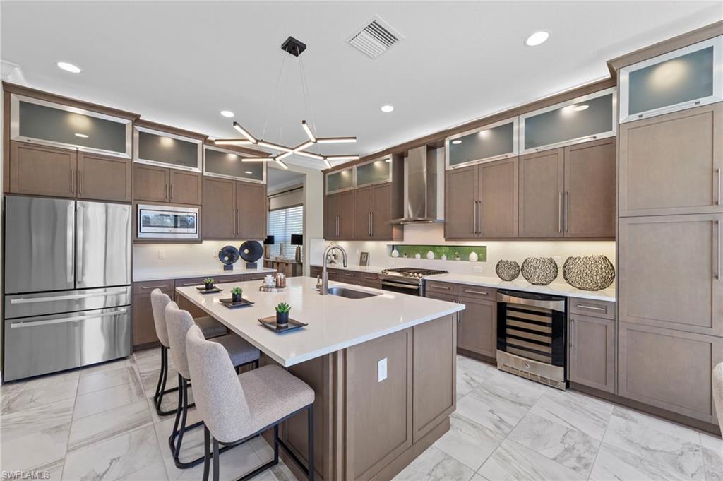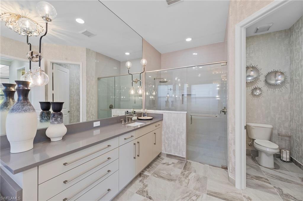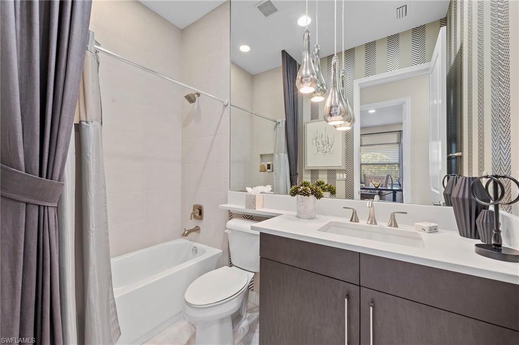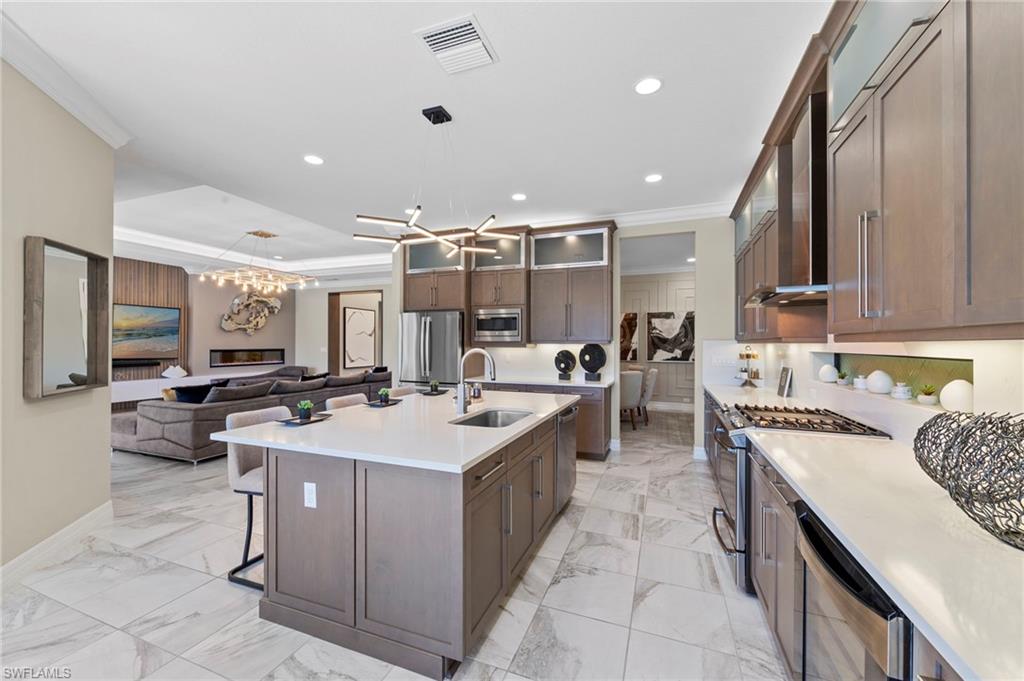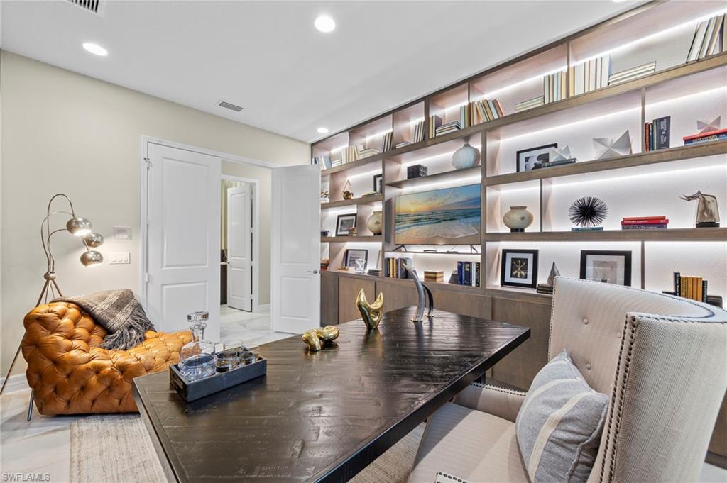 Positioned on a private cul-de-sac within Stonecreek, this former GL Homes Bellagio model showcases premium finishes, exceptional craftsmanship, and one of the most desirable settings in the community. Set on an oversized pie-shaped pie-shaped lot with highly sought-after southern exposure, the home captures long, tranquil lake views and all-day natural light across its expansive outdoor living spaces. Offering 3 bedrooms plus a den and 3 full baths, this residence lives like new and is being offered turnkey for a seamless move-in experience. Custom woodwork and designer detailing elevate the interior, creating a refined yet comfortable atmosphere throughout. The kitchen is thoughtfully designed with abundant cabinetry, a gas range, and a layout that flows effortlessly into the main living and dining areas, ideal for both everyday living and entertaining. The den features custom built-ins, providing a polished and functional workspace. The primary suite is a private retreat with sweeping lake views, custom trim accents, dual walk-in closets with built-in organizers, and a spacious ensuite bath complete with dual sinks, a soaking tub, and a separate walk-in shower. Outdoor living is equally impressive. The expansive lanai overlooks the private lake and features a heated saltwater pool, a sutoma wood-paneled ceiling, built-in fireplace with a stone accent wall, and a custom gas grillu2014creating a true extension of the home designed for year-round enjoyment. Accordion shutters throughout provide added peace of mind. Beyond the home itself, Stonecreek delivers a resort-style lifestyle centered around its 13,676-square-foot clubhouse and 6.25-acre recreation complex. Residents enjoy a social hall with catering kitchen, indoor sports court, card and game rooms, media room, multi-purpose fitness spaces, and a fully equipped fitness center. Multiple aquatic amenities include a resort-style pool, lap pool, whirlpool spa, and splash park. Sports enthusiasts appreciate the Har-Tru tennis courts, pickleball courts, basketball, and beach volleyball, while outdoor gathering spaces such as the tiki bar, fire pit, and lake overlook pavilion create the perfect setting for socializing. A full-time lifestyle director curates events and activities year-round, and miles of sidewalks wind throughout the beautifully landscaped community. This is a rare opportunity to own a former model home on a premier lot while enjoying one of Naplesu2019 most amenity-rich gated communities.