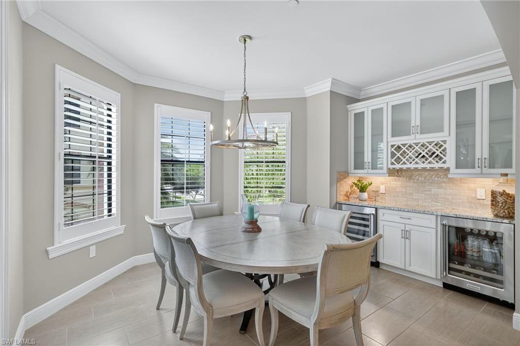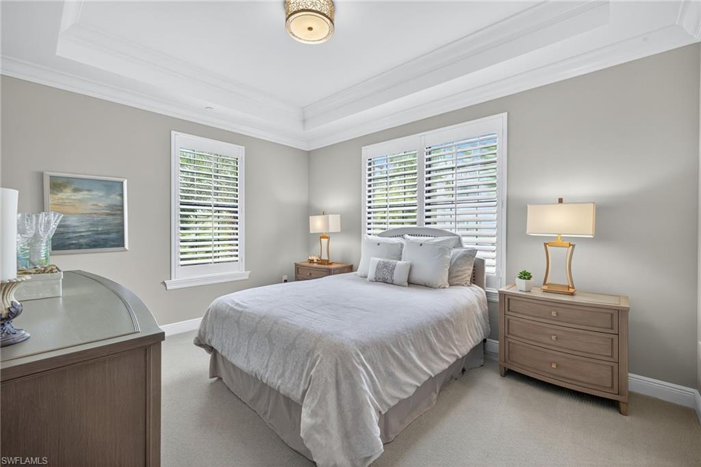 IMMEDIATE GOLF MEMBERSHIP AVAILABLE AT CLOSING! Skip the waitlist and start enjoying the award winning Greg Norman/Pete Dye designed course at TALIS PARK! This captivating TURNKEY condominium features a GOLF COURSE VIEW overlooking holes #4, #3 and #2 and the sparkling lake, a timeless primary suite with hardwood floors in the bedroom and in the custom closet, dual sinks, a bathtub and separate large shower. The captivating great room is impeccably decorated in a neutral decor which blends seamlessly with the soft white cabinetry in the chef inspired kitchen. A natural gas cooktop is a bonus as is the built in bar with both a wine and beverage refrigerator. Two ensuite guest rooms, a den/office with warm hardwood floors/private screened balcony and a lovely powder room combine for a condominium that lives like a true home with 2950 SF of air conditioned living space! The 700 SF wraparound screened loggia can be accessed from the corner sliding doors in the great room, the kitchen or the primary bedroom creating a perfect place to bring the outdoors inside while entertaining a group, dining al fresco or enjoying your morning coffee! An additional storage room in the garage is fitted with a dehumidifier. Two deeded garage parking places are also included in this graceful `lock and leave` residence. Carrara residents and their guests have the use of the private pool on the street and the grill area. In addition to the spectacular golf course, Talis Park residents enjoy the award winning clubhouse (formal and informal dining), Fiona's casual dining with a pizza oven, the Casa Cortese at the practice range with an outdoor bar and indoor golf simulator, fitness center, spa, bocce, pickleball, tennis, two dog parks, a large community pool, playground and peaceful walking/running paths. The expansive social calendar is sure to impress with something for everyone. Located between Olde Naples and RSW Airport, it's a premier locale. Shopping, dining and beaches are also in close proximity.