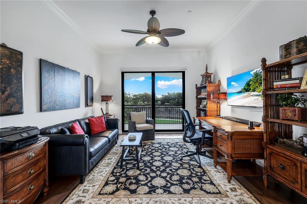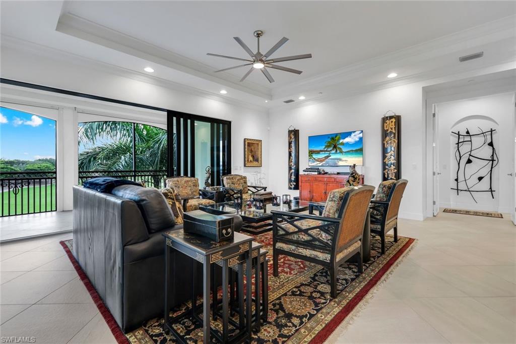 TOP FLOOR PENTHOUSE WITH PRIVATE VIEWS OF THE FIRST HOLE AND TWO WATERFALLS AND PRIVACY! Carrara is the ONLY neighborhood with itu2019s own community pool and spa!!Step into this exclusive penthouse overlooking the first hole and cascading waterfalls in the Carrara enclave of Talis Park, where timeless design and refined upgrades create a sense of private serenity. Soaring ceilings, tile flooring throughout, designer lighting, and zero-corner sliders set the tone for seamless indoor-outdoor living, filling the home with light and calm.As you enter the open-concept living and dining areas, you are immediately greeted by sweeping golf and water views that frame each moment in peaceful elegance, providing both intimacy and space for entertaining. From here, you flow into the chef-inspired kitchen, where crisp white cabinetry, gas cooking, a Miele dishwasher, custom pull-out storage, and generous counter space meet convenience, complemented by a Kinnectico water system with reverse osmosis and instant hot water dispenser.The kitchen opens to a sunlit eat-in nook surrounded by windows, perfect for casual meals or morning coffee. Built into the nook, a custom wine and beverage center offers generous storage for bottles, sleek countertops, and lighted upper cabinetry for display and organizationu2014blending style and practicality for entertaining or everyday enjoyment.Continuing through, the expansive wraparound lanaiu2014freshly painted and offering multiple seating areasu2014feels like an extension of the home itself, blurring the line between indoors and out. Remote-controlled electric roll-down hurricane shutters ensure effortless protection while preserving the stunning panorama.As you move into the primary suite, the space unfolds as a private haven, featuring dual sinks, soaking tub, separate shower, Toto toilet seat, remote-controlled blackout shade, and a custom California Closet. Each guest suite offers relaxing comfort, ample storage, and thoughtful design, ideal for vacation living or enjoying Southwest Florida, while a versatile den provides flexibility as a home office, library, or media space, maintaining the homeu2019s sense of ease and refinement.Every detail enhances daily living, from electric blinds, trash chute, a self-cleaning tankless water heater, and private elevator access with secure video entry. A large storage room, with a dehumidifier, adds convenience, while an IFLO system ensures additional peace of mind.As you step back and take in the full panorama, you realize this isnu2019t just a homeu2014this penthouse is your private sanctuary in the heart of Naples, complete with access to Carrarau2019s private resort-style pool and sundeck, along with Talis Parku2019s world-class amenities: championship golf, tennis, pickleball, bocce, spa services, fitness, and multiple dining venues. Perfectly situated just minutes from beaches, shopping, and fine dining, every moment here feels deliberately calm, effortless, and luxurious.