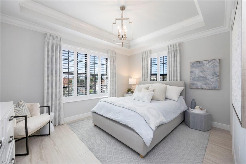 Experience refined living in this exquisitely decorated penthouse residence, where sophisticated design meets serene golf course and water views. Thoughtfully curated with elegant finishes and painted in soft, tranquil tones throughout, the home creates an atmosphere of calm, comfort, and understated luxury from the moment you enter.At the heart of the home is a beautifully designed chefu2019s kitchen, featuring elegant all-white cabinetry, high-end appliances, and stunning lighting fixtures that add warmth and style. The kitchen flows seamlessly into the open living and dining areas, creating a bright and inviting space perfect for entertaining or enjoying everyday living while taking in the spectacular views. Just off the main living space is a private den with French doors, offering the perfect retreat for a home office, reading room, or quiet lounge. The den also features its own private balcony, providing a peaceful place to relax and enjoy the fresh air.Designed for both relaxation and entertaining, the extraordinary wraparound terrace spans two sides of the residence, offering expansive outdoor living with sweeping views of lush fairways, manicured greens, and shimmering water. This impressive space is ideal for morning coffee, sunset gatherings, or simply enjoying the peaceful beauty of the surroundings.The primary suite is a private sanctuary, highlighted by a beautifully crafted decorative shiplap feature wall that adds warmth and architectural interest. The spa-inspired primary bath features dual bowl sinks, a large soaking tub, an oversized walk-in shower, and a spacious walk-in closet designed for both comfort and elegance.Two additional generously sized guest suites, each with their own beautifully appointed private bathrooms, provide exceptional comfort and privacy for family and guests alike.Located within a highly exclusive golf community, residents enjoy access to an impressive array of resort-style amenities including championship golf, tennis courts, pickleball, swimming pools, basketball courts, a full-service spa, and an on-site restaurantu2014creating a lifestyle that feels like a year-round resort.With its professionally decorated interiors, expansive outdoor living spaces, and breathtaking golf and water views, this exceptional penthouse offers a rare opportunity to experience luxury, tranquility, and resort-style living in one of the communityu2019s most desirable settings