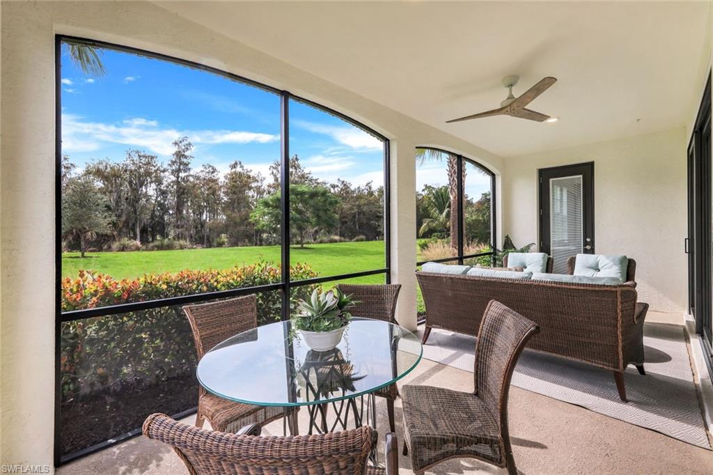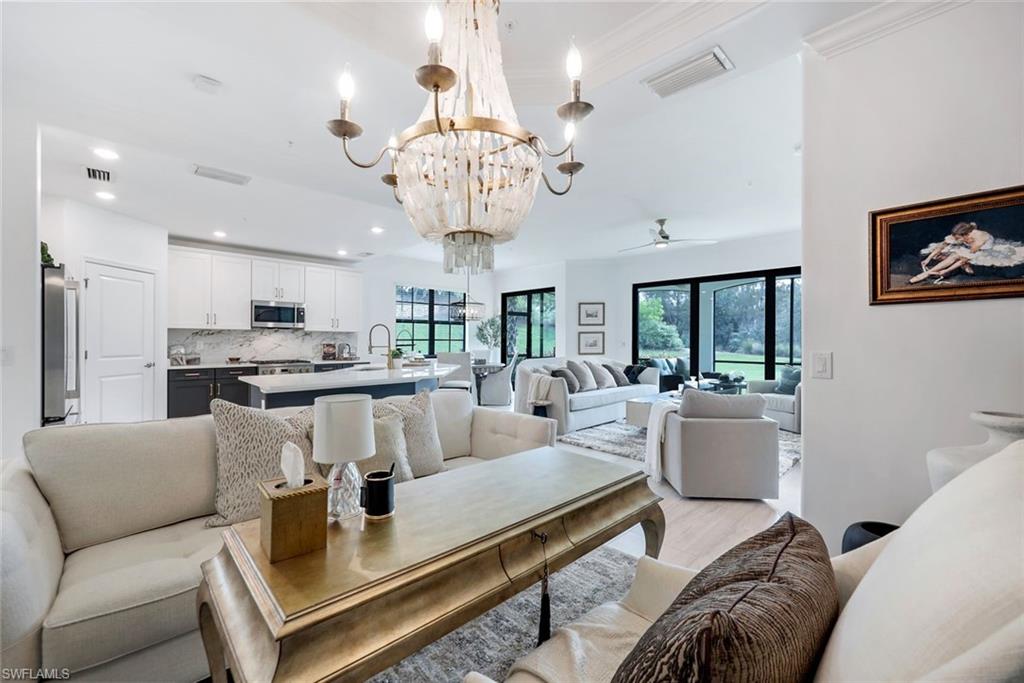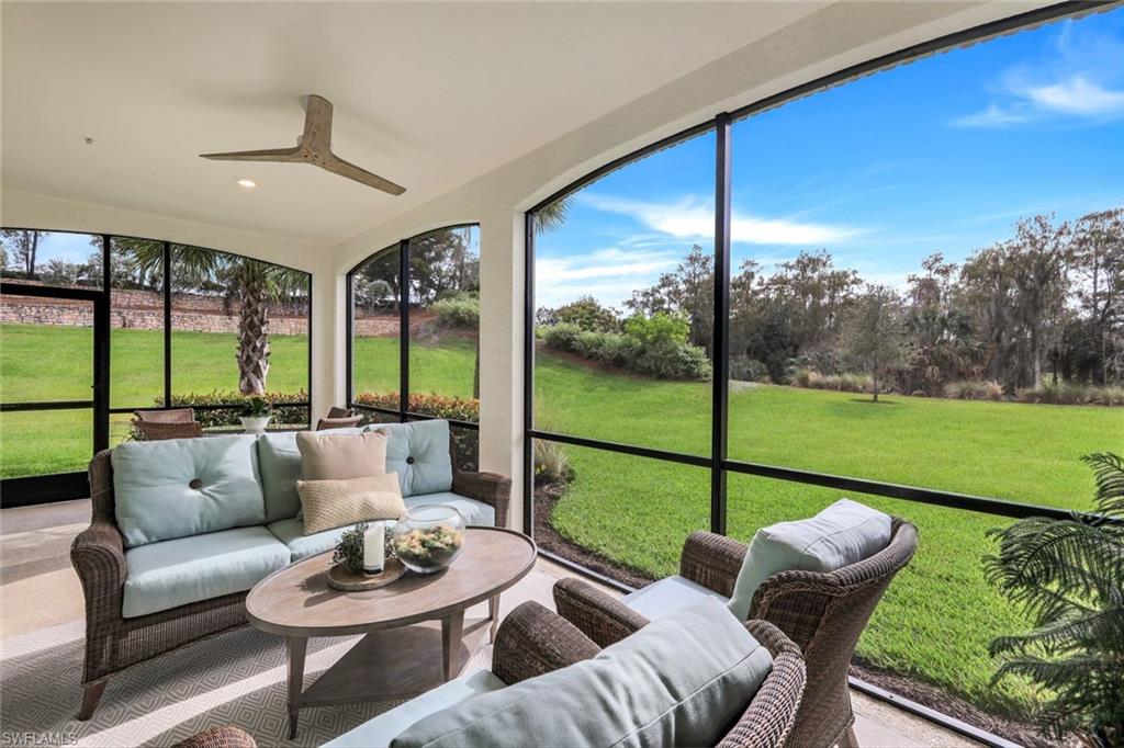 Occupied Feb, March, Apr 2026. Available May 2026 $7,000 per month off-season. Turn-key first floor 2021 construction `Corsica Model` Coach Home from WCI (a Lennar Company). Three bedrooms plus two full baths elegant, modern, finishes and fixtures. Tile floors throughout, built out walk in closet and linen closet in the primary, double sinks custom marble backsplash accent wall and private access to the lanai. Enjoy views of the preserve, landscaped berm, and extended grassy area from the screened in lanai. Private end unit attached 2 car garage located at the end of a cul-de-sac. Close proximity to the Sports Complex (lap pool, Bocce ball and lighted Tennis & Pickleball Courts near the south entry gate). The `Vyne House` Clubhouse was (voted Clubhouse of the year 2016 by Golf Inc. Magazine!) It offers Core Fitness Center & Esprit Spa plus Fionau2019s Market Cafu00e9! The golf course was designed by Greg Norman and Pete Dye and is ranked by Golf Digest as one of Florida's top 20. SPORTS MEMBERSHIP transfer available with limited golf during season and unlimited golf off season! Play golf and dine at 20+ reciprocal clubs from May-Sept.
