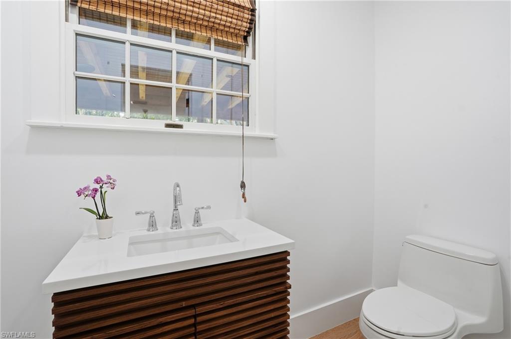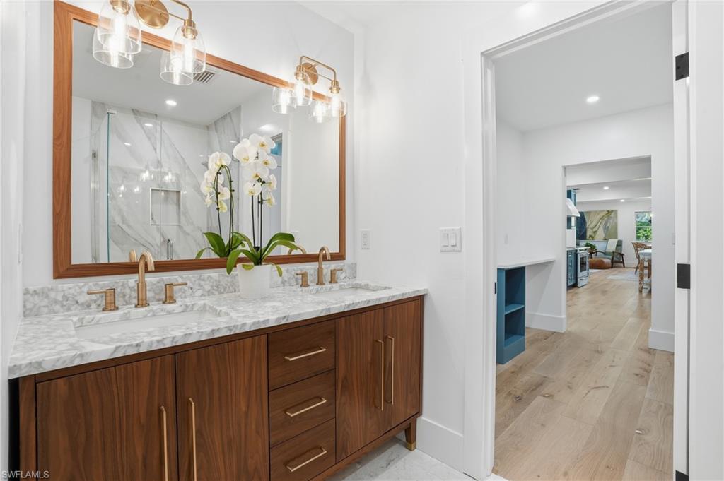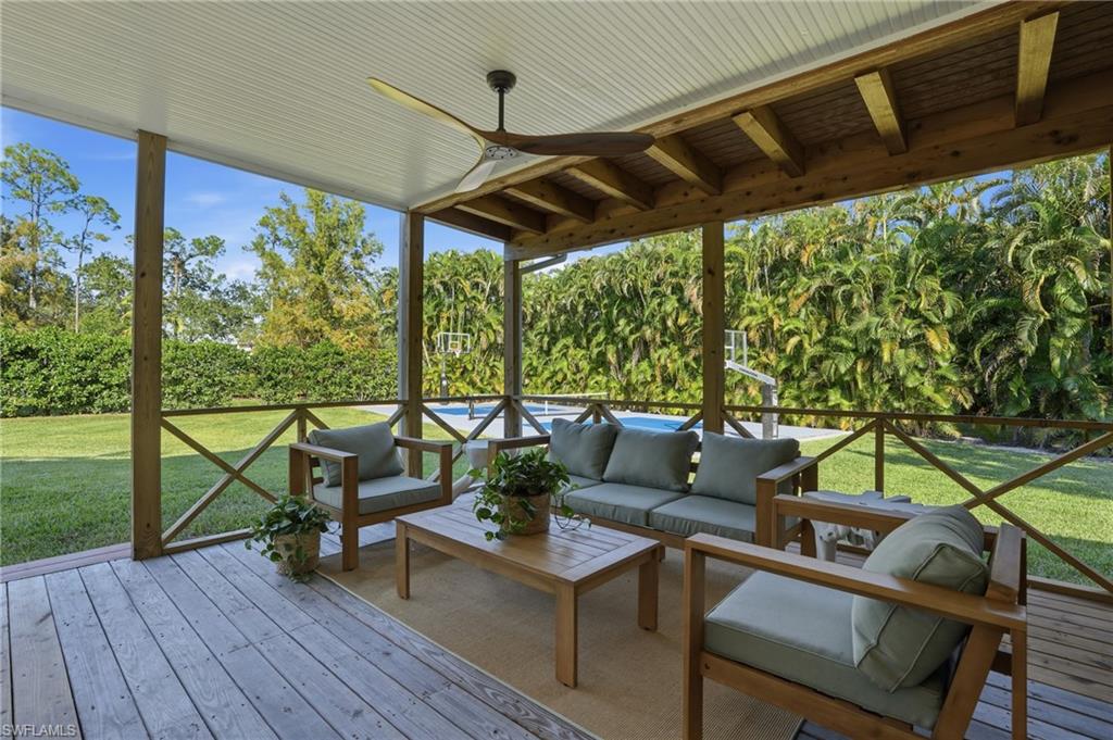 Beautifully renovated and set on an oversized 0.52-acre cul-de-sac lot with your very own private pickleball/basketball court, this fully furnished two-story estate blends high-end finishes, generous indoor-outdoor living, and an unbeatable central location. Inside, the open layout is filled with natural light and anchored by a coastal-inspired kitchen with teal shaker cabinetry, brass hardware, white quartz countertops, a farmhouse sink, and a rustic center island. Wide-plank, white oak floors flow throughout the living and dining areas, creating a warm, cohesive feel.The flexible floor plan includes two primary suitesu2014one on each level. The first-floor suite offers a private exterior entrance ideal for guests or multigenerational living, while the upstairs suite enjoys a seating area and a balcony overlooking the peaceful, tropical yard.Outdoor living is a major highlight, with a full-length covered back porch, multiple seating and dining zones, and a hot tub overlooking the expansive backyard retreat. With its rare combination of privacy, location, and turnkey readiness, this home offers an exceptional lifestyle in one of Naplesu2019 most coveted neighborhoods.