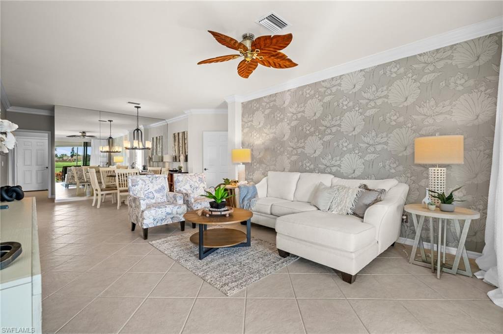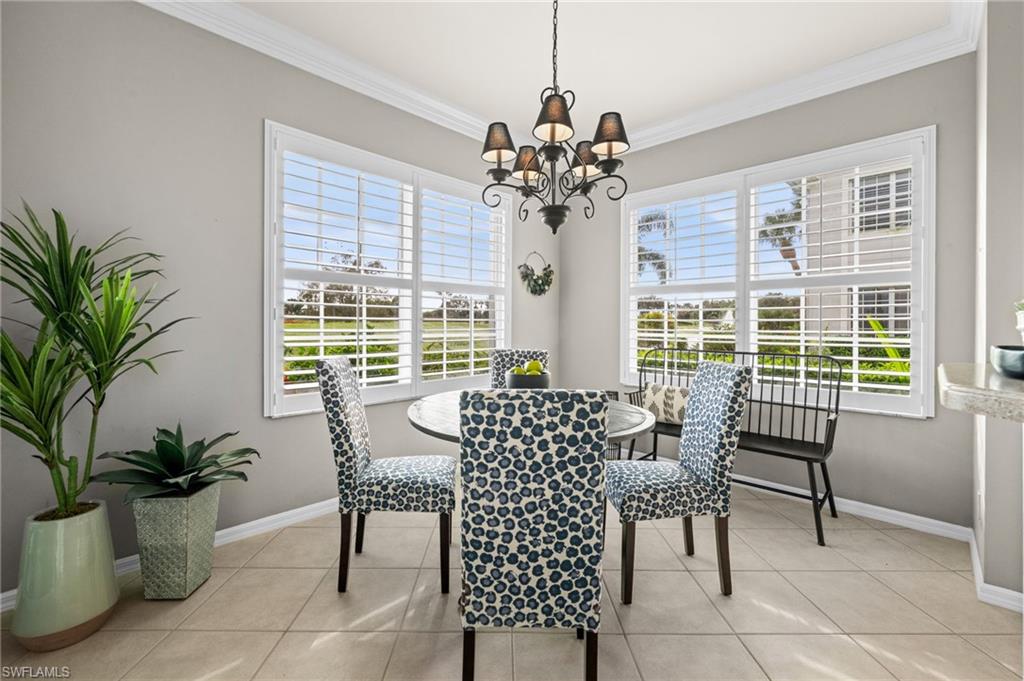 Nestled at the end of a quiet cul-de-sac with sweeping golf and lake views, this beautifully turnkey furnished 3-bed, 2-bath 2 car garage residence with coveted eastern sunrise exposure offers a light and airy retreat in The Strand, one of North Naplesu2019 best kept secrets that includes exceptional country club amenities for each resident. Take a peek at both lifestyle videos. From the kitchen, breakfast nook, dining area, living room, and primary suite, nearly every space enjoys a front-row vantage point overlooking the greens, filling the home with natural light and serene landscape vistas. Plantation shutters frame the windows, designer lighting enhances the ambiance, and a beautifully updated primary ensuite shines with dual walk-in closets and an ensuite bath with dual sinks, designer sconces, and a frameless glass shower door entry. The spacious kitchen flows effortlessly into the living and dining areas, creating a warm environment ideal for everyday living and entertaining. From your large lanai, experience front-row seats to the action on the golf course and the peaceful shimmer of the lake. A 2-car garage adds convenience and storage, completing this move-in-ready Naples escape. Residents enjoy a peaceful, gated community with access to a full-service country club offering activities for every lifestyle. A very active community; racquet-sport enthusiasts can take advantage of multiple tennis, Pickleball, and Bocce courts, plus a croquet lawn. The Strand also features a well-equipped Fitness Center with classes and personal training, a relaxing Spa, and a vibrant social calendar with clubs, events, and several dining venuesu2014including Tavern 59, The Grille, and more. Perfectly positioned in North Naples, mere minutes from the Gulfu2019s sugar-sand beaches and the premier shopping, dining, and entertainment of Mercato. Whether youu2019re seeking an active golf and racquet lifestyle, vibrant social amenities, or the peaceful elegance of a home with stunning fairway and lake views, this residence at The Strand offers the perfect blend of comfort, beauty, and community. Separate memberships, not mandatory for Golfers providing 27 holes of championship golf.