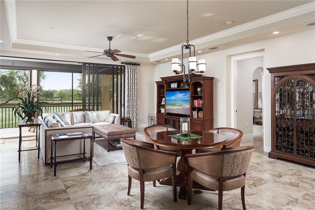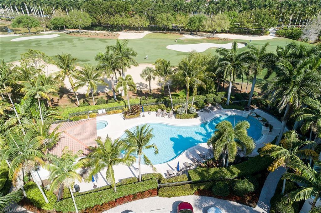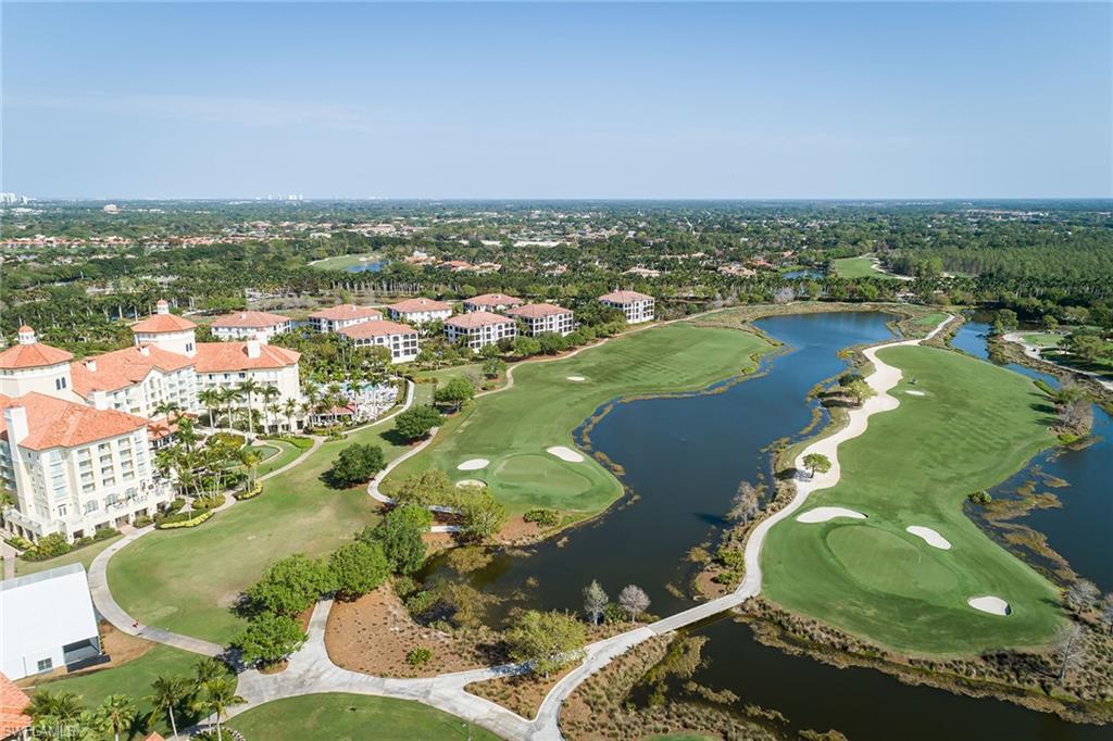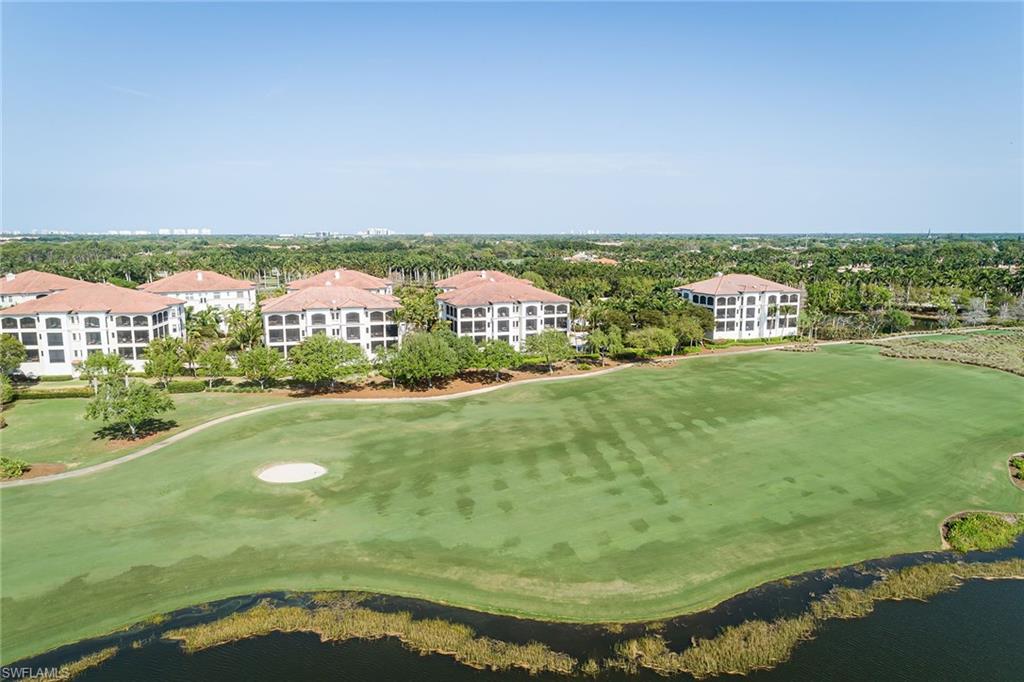Immediate golf membership availability. Enjoy stunning panoramic golf course and lake views of the signature 18th hole from this beautiful three-bedroom, three-bath home with an open floor plan and huge wraparound screened loggia with pocketing sliders and Storm Smart screens. The designer kitchen features new quartzite countertops, a five-burner gas stove, wall oven and stainless steel appliances with sophisticated decor. Wake up to serene lake and golf course views from your primary suite with sliding glass doors to the lanai. Designed to live like a single-family home, this residence offers the privacy and comfort of a house while embracing the ease of luxury condominium living. Not only does this home offer effortless luxury, but it also provides peace of mind in a non-flood zone. Adding to the convenience, the property includes two ground-level parking garage spaces and a private storage room. Club memberships are available but optional at Tiburon. As a member, you will enjoy 36 holes of championship golf with exceptional amenities including concierge services, fitness center, spa, a water park with slides and lazy river at the Ritz-Carlton Golf Resort, and beach transport to Vanderbilt Beach. Centrally located just over two miles from shops and restaurants of Mercato and four miles to the glistening waters of the gulf.
