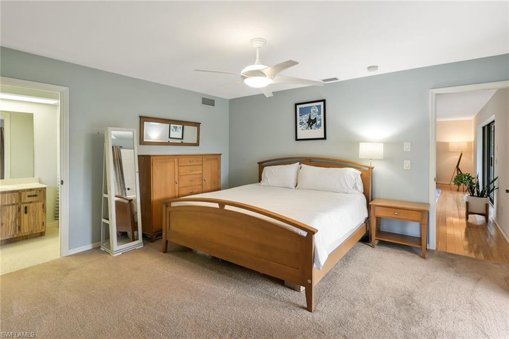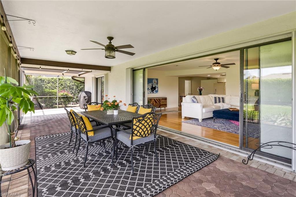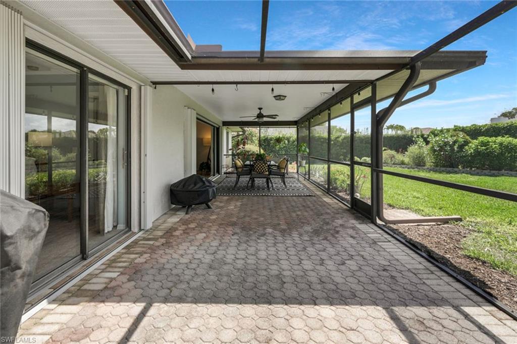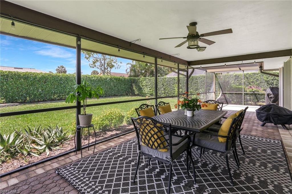 An exceptional opportunity within the desired Victoria Park community of North Naples, this spacious three-bedroom, two-bath residence blends convenience and effortless Florida living. Privately on a quiet interior street with a southern exposure, the home showcases over 2,000 square feet of interior space designed for comfort and enjoyment. A double-door front entry introduces a light-filled, thoughtfully curated interior where living areas flow seamlessly throughout multiple living spaces, creating an ideal setting for family gatherings and entertaining. The split-bedroom floor plan enhances privacy, with a primary suite offering convenient direct access to the screen-enclosed lanai for easy indoor-outdoor lifestyle. At the heart of the home, the kitchen features generous storage, an oversized pantry, and a charming breakfast nook, while the separate formal dining space sets the stage for memorable hosting. The living room sliding glass doors invite natural light to pour in, framing picturesque garden views and enhancing the homeu2019s tranquil ambiance. The screened lanai is a private sanctuary, overlooking lush, manicured landscaping, offering a peaceful backdrop for morning coffee or sunset unwinding. Additional enhancements include updated windows, a beautifully renovated guest bath, and a spacious laundry room with custom storage and folding space, plus manual and accordion storm shutters for peace of mind. The homeu2019s striking curb appeal is defined by a paver driveway, expansive front lawn and two-car garage. Victoria Park residents enjoy an array of lifestyle amenities, including a resort-style pool, tennis and basketball courts, and a scenic fishing pier. Positioned within an A-rated school district and just moments from upscale shopping, fine dining and the white sand beaches, this residence embodies the best of North Naples living.