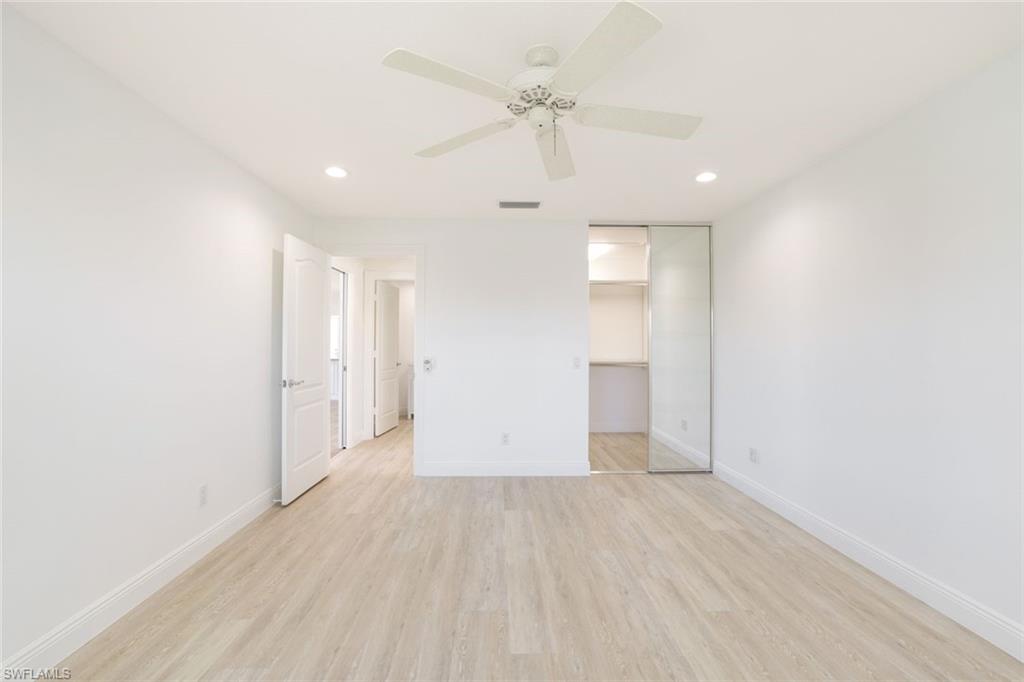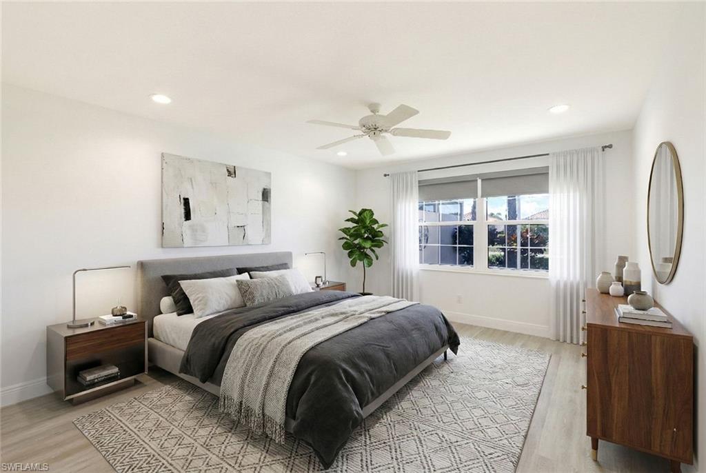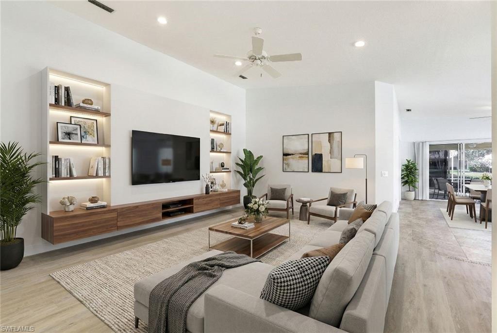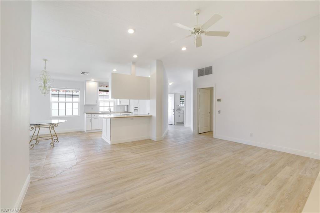 Beautifully refreshed Capri Villa nestled in a quiet area of the community. Western exposure on the canal for spectacular nightly sunsets. February 2026 completed gorgeous new floors, updated kitchen cabinets, 2 large bedrooms w/updated closets and lighting, walk-in closets. Freshly painted throughout. Updated laundry cabinets, counters and sink. Dimmable lighting throughout. This model includes an open den, 2 bathrooms and a 2-car garage. Impact windows throughout. A glassed-in lanai with heating and cooling. Motorized awnings covering entire lanai area. The home is wired for and has a special outdoor outlet for a generator enabling use of lighting and multiple large appliance usage. (Generator is also for sale.) Village Walk is just 5 miles from Vanderbilt Beach and 4 miles to the shopping and dining gem - Mercato! HOA fees cover landscaping, cable and internet service, and full use of amenities - including tennis, pickleball, bocce ball, gym with lap pool, 2 heated resort pools, on-site restaurant, miles of paved and lighted walkways around lakes, and over canals with charming Venetian style bridges.