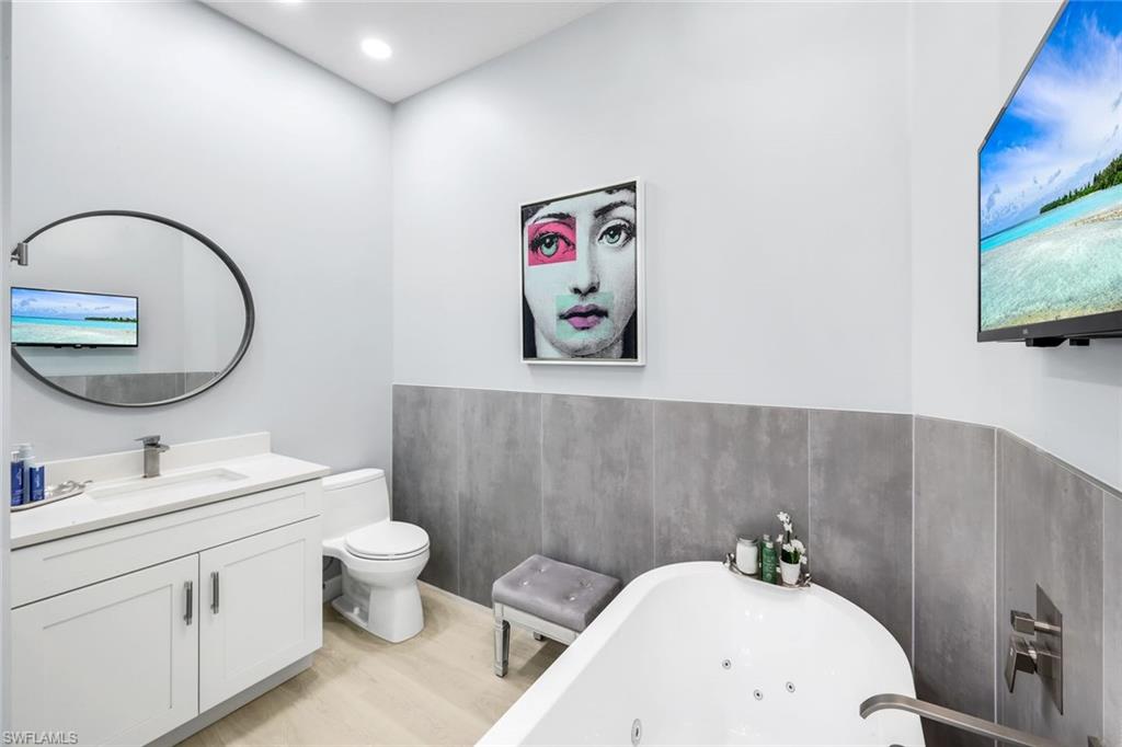 Welcome to this beautiful, completely RENOVATED 4-bedroom, 3-bathroom POOL home on a premium LAKE-FRONT lot with western-exposure! Located in a gated community just off Vanderbilt Beach Rd. in North Naples, yet tucked away on a peaceful street, the home has been tastefully REDESIGNED with a coastal flair. The heart of the house ~ open-concept kitchen, dining + living area is bright and airy thanks to abundant natural light and 12ft ceilings. The impressive WATERFALL ISLAND captures the attention, with white quartz countertop and white cabinets on both sides for added storage, surrounded by brand new kitchen cabinets, backsplash, quartz countertops, stainless steel appliances, including a dual oven and wine cooler, and multiple glass sliding doors opening to a lovely pool patio. The outdoor area is perfect for those memorable al fresco dinners with a view or family barbecue nights. The primary suite is a dream-come-true offering floor to ceiling glass sliding doors with those sparkling pool/lake views, multiple closets, including walk-in, and an updated modern bathroom with two sinks, custom cabinets, Jacuzzi bubble bath and separate shower. Additional HIGHLIGHTS include: TWO SHOWERS with upgraded tile and glass doors, custom/designer lighting, built-in Murphy bed in one of the bedrooms (currently used as a den), custom window treatments with lifetime warranty, crown molding in ALL rooms, 2018 TILE ROOF, 2019 AC SYSTEM, new paver driveway, recently RESURFACED POOL and replaced pool area pavers, NEW SCREENS, freshly painted inside and outside, and much more. Village Walk community offers fabulous amenities that include 2 resort-style swimming pools, fully-equipped fitness center with lap pool, pickle ball and tennis courts, bocce courts, community clubhouse with active social calendar, Mediterranean restaurant and miles of scenic lake-side walking trails. With world-class shopping and dining, best beaches, boating, water activities, golf courses, 2 Ritz-Carlton hotels, event venues, art galleries and many more attractions only minutes away, this home truly offers the space, the style, serenity and prime LOCATION!