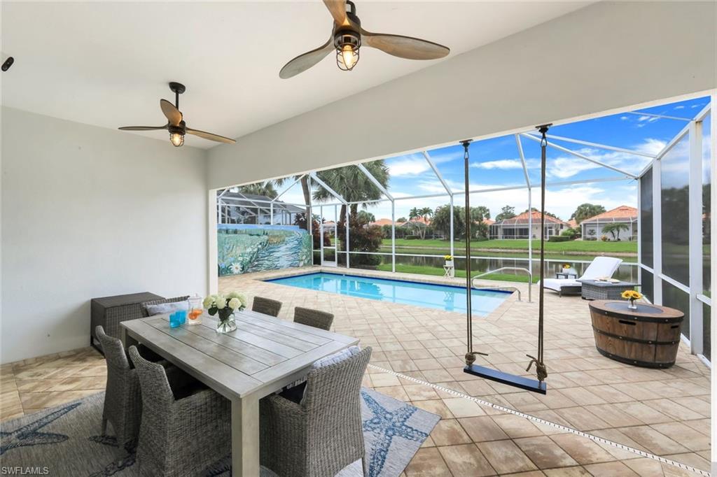 Wow! Move right in and watch breath-taking Naples sunsets from your private POOL patio overlooking the lake! Your guests may never want to leave this Divosta-built, 4-bedroom, 3-bathroom Oakmont residence on a premium LAKE-FRONT lot with WESTERN-exposure. Located in a gated community just off Vanderbilt Beach Rd. in North Naples, the home has been tastefully RENOVATED and REDESIGNED with a coastal flair. The heart of the house ~ kitchen/living/entertainment area is bright and airy thanks to abundant natural light and 12ft ceilings. The impressive island captures the attention, surrounded by stainless steel appliances, including a dual oven and wine cooler, and multiple glass sliding doors opening to a lovely pool patio. The outdoor area is perfect for those memorable al fresco dinners with a view or family barbecue nights. The primary suite is a dream-come-true offering floor to ceiling glass sliding doors with those sparkling pool/lake views, multiple closets, including walk-in, and an updated modern bathroom with dual sinks and a Jacuzzi bubble bath. Additional highlights include two modern showers with upgraded tile and glass doors, custom/designer lighting, built-in Murphy bed in one of the bedrooms (currently used as a den), custom window treatments with lifetime warranty, crown molding in all rooms, 2018 tile roof, 2019 AC system, paver driveway, recently resurfaced pool and much more. Village Walk community offers fabulous amenities that include 2 resort-style swimming pools, fully-equipped fitness center with lap pool, pickle ball and tennis courts, bocce courts, community clubhouse with active social calendar, Mediterranean restaurant and miles of scenic lake-side walking trails. With world-class shopping and dining, best beaches, boating, water activities, golf courses, 2 Ritz-Carlton hotels, event venues, art galleries and many more attractions only minutes away, this home truly offers the space, style, serenity and prime LOCATION!