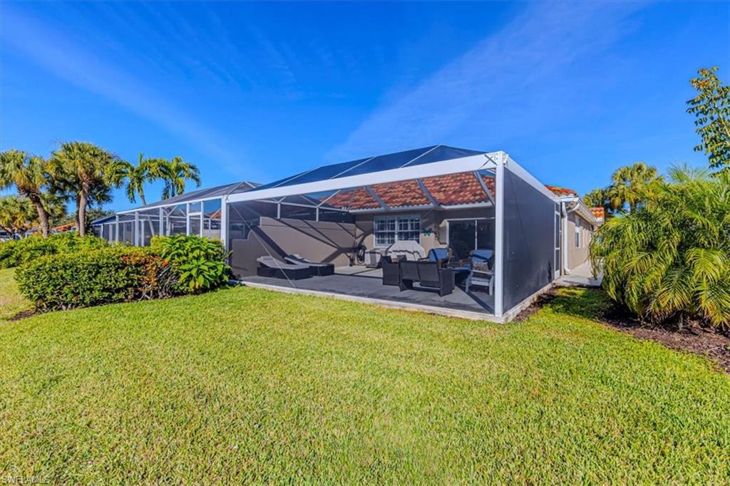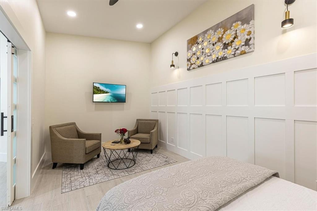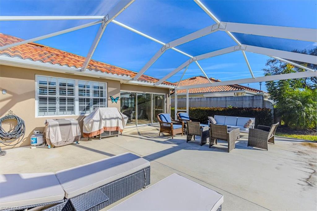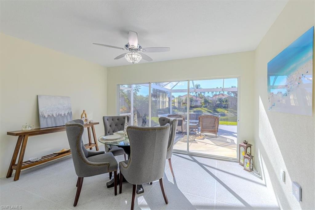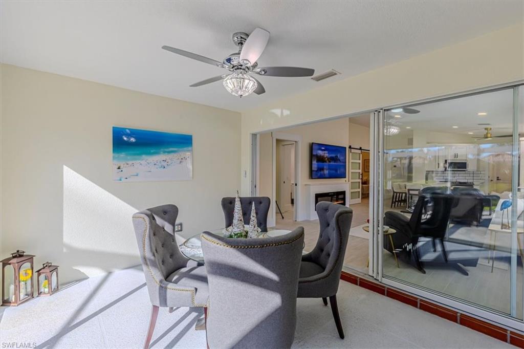 This remodeled/enhanced extended Capri Villa shows like a model home. It is truly move in ready, has been tastefully decorated and is being offered furnished. Just bring your personal belongings and settle right in.What is normally a two bedroom villa has been revised now with a large flex space currently used for guests offering a queen bed and sitting area with mounted TV . Additional upgrades in the home include: tile wood like floors , large 75 inch TV mounted over an electric fireplace in living area, quartz counter tops in both kitchen and baths, plantation shutters , newer Samsung appliances in the kitchen, beautiful bathrooms with the primary featuring a personal vanity area, and new LG top load Washer and Dryer, The A/C is approx. 5 years old, Hot Water Tank is approx, 2 years old, Newer Roof, and a newer frameless screened in Lanai perfect for entertaining To top that it has a desirable Southern exposure. Village Walk Community Town Center is perfect for enjoying a variety of amenities including, Fitness center, tennis courts, pickleball courts, bocce ball or you can cool off in either the resort pool or lap pool. For your convenience there is an on site hair salon,restaurant and travel agency.. Village Walk is located approx. 15 minutes to Vanderilt Beach, and close to shopping, restaurants, I-75 and less than 1 hour to RSW Airport.