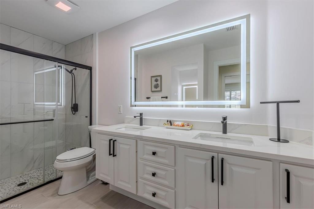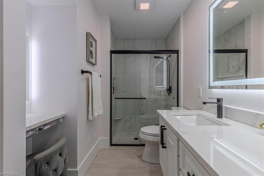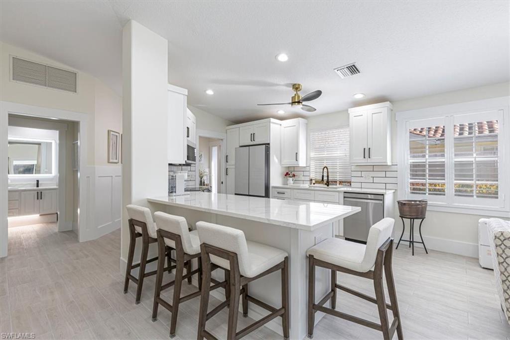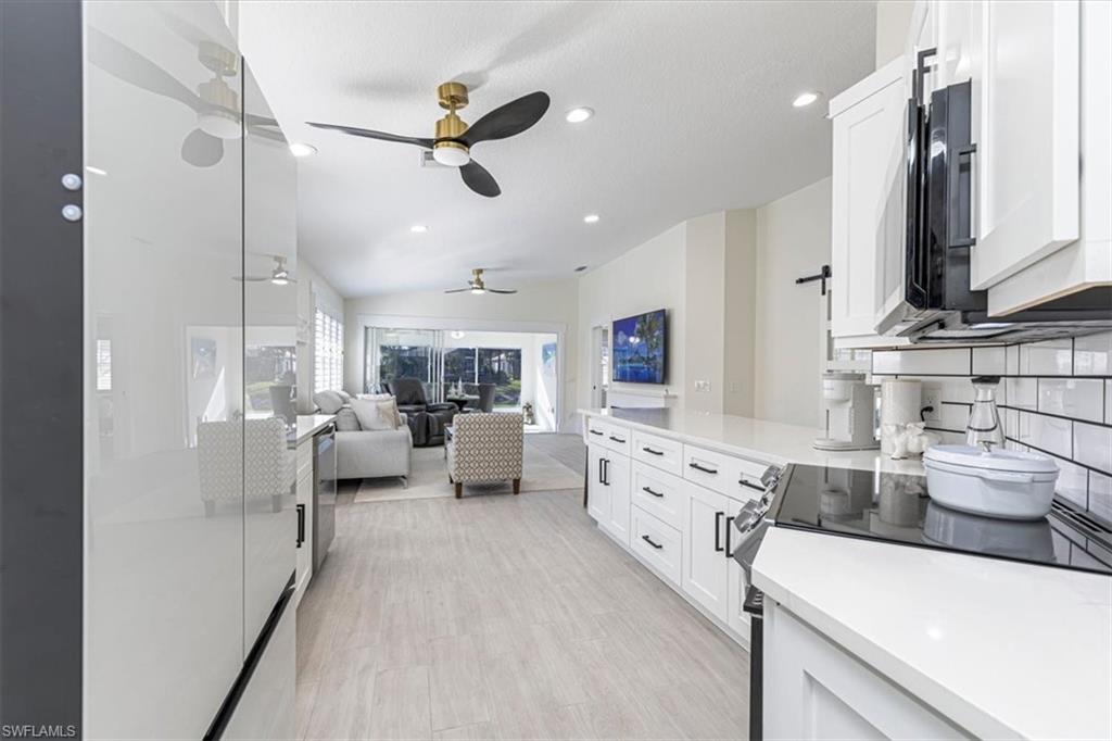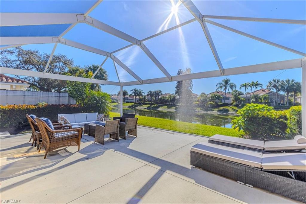 This remodeled/enhanced extended Capri Villa shows like a model home. It is truly move in ready, has been tastefully decorated and is being offered furnished. Just bring your personal belongings and settle right in.What is normally a two bedroom villa has been revised now with a large flex space currently used for guests offering a queen bed and sitting area with mounted TV . Additional upgrades in the home include: tile wood like floors , large 75 inch TV mounted over an electric fireplace in living area, quartz counter tops in both kitchen and baths, plantation shutters , newer Samsung appliances in the kitchen, beautiful bathrooms with the primary featuring a personal vanity area, and new LG top load Washer and Dryer, The A/C is approx. 5 years old, Hot Water Tank is approx, 2 years old, Newer Roof, and a newer frameless screened in Lanai perfect for entertaining To top that it has a desirable Southern exposure. Village Walk Community Town Center is perfect for enjoying a variety of amenities including, Fitness center, tennis courts, pickleball courts, bocce ball or you can cool off in either the resort pool or lap pool. For your convenience there is an on site hair salon,restaurant and travel agency.. Village Walk is located approx. 15 minutes to Vanderilt Beach, and close to shopping, restaurants, I-75 and less than 1 hour to RSW Airport.