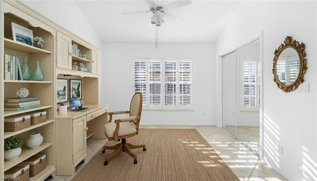 Truly one of the best values in The Vineyards. Nestled within the prestigious enclave of Vineyards Country Club in Naples, this exquisite second-floor coach home offers a masterclass in modern coastal elegance. From the moment you arrive at the attached single-car garage and step inside, the homeu2019s rich design language is on full display, beginning with a striking staircase featuring wood-grain treads and crisp white risers. As you ascend, a thoughtfully placed skylight bathes the entryway in natural light, setting a bright and airy tone that carries throughout the entire residence. The heart of the home has been completely transformed through a comprehensive kitchen remodel, where a wall was removed to create a seamless, open-concept flow into the main living areas. This chefu2019s sanctuary is appointed with premium quartz countertops, a tumbled tile backsplash, and sleek stainless steel appliances, all accented by contemporary gold fixtures and hardware. The space is illuminated by an abundance of recessed lighting and framed by elegant plantation shutters, while large-format tile flooring laid on the diagonal provides a sense of continuity and scale to the light-filled interior. The transition between indoor and outdoor living is flawlessly executed via the enclosed patio, which serves as a versatile sunroom that brings the lush Florida landscape inside. From this vantage point, you can enjoy serene views of the meticulously landscaped grounds and the nearby community pool. The primary suite serves as a true private retreat, boasting soaring vaulted ceilings and a spa-like bathroom remodeled to perfection. This sanctuary features a tabletop vanity with a custom mirror, dual sinks, and a walk-in shower enclosed by frameless glass and adorned with gold accents. A massive walk-in closet, brightened by a charming dormer window, ensures ample storage without sacrificing the homeu2019s signature luminosity. Completing this cohesive vision, both the guest bathroom and the powder room have been fully renovated with the same high-end finishes found throughout the home. Residents of the Vineyards enjoy access to a wealth of membership opportunities, including two championship golf courses and world-class amenities, making this property not just a home, but a gateway to the ultimate Naples lifestyle.