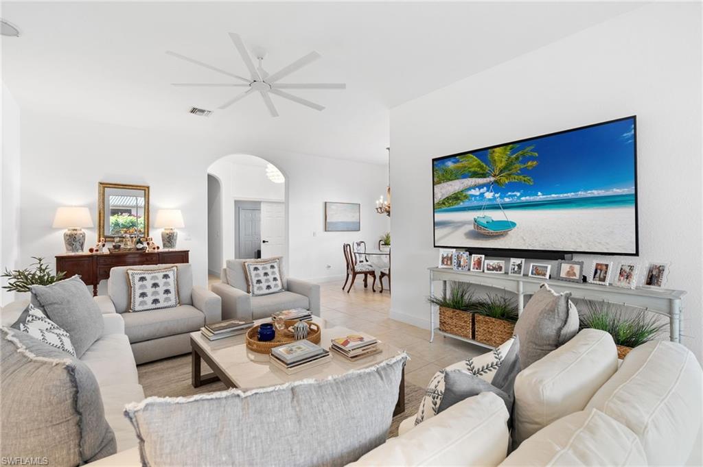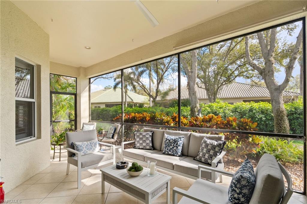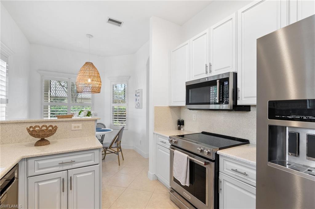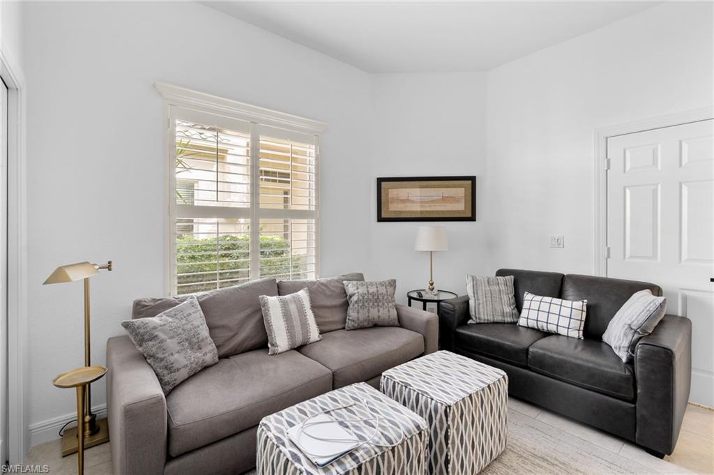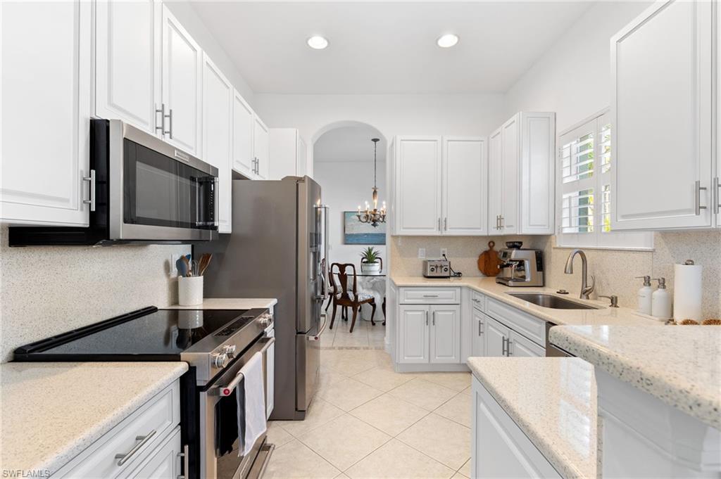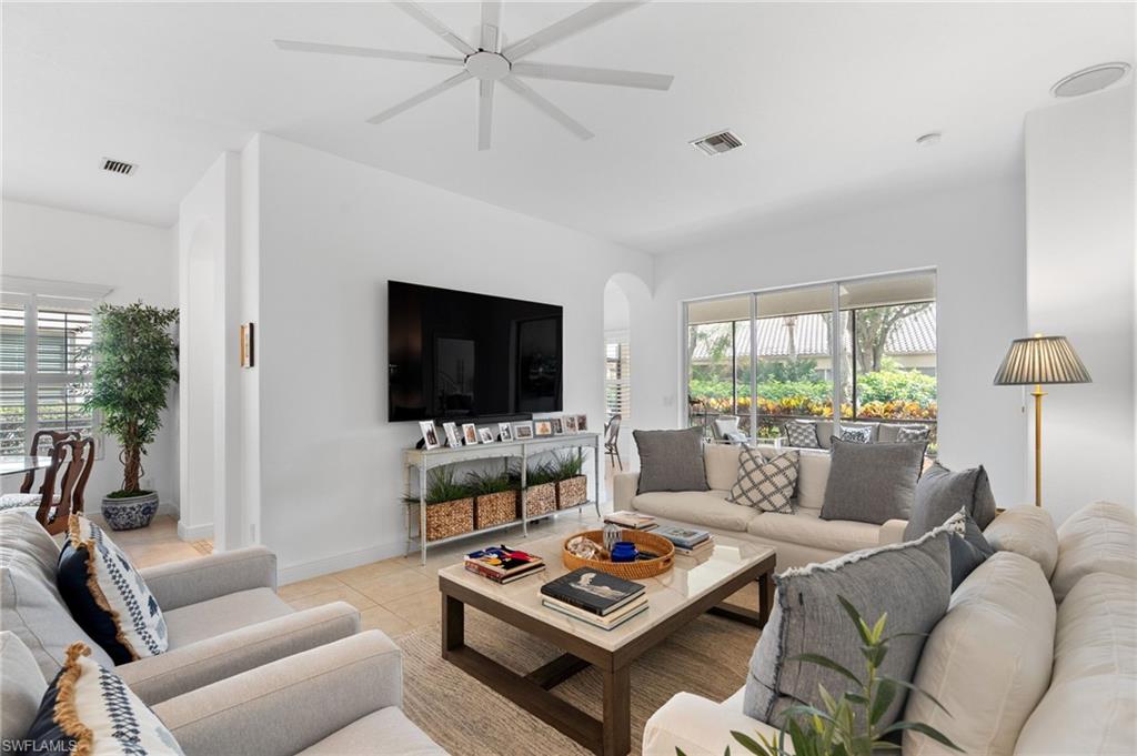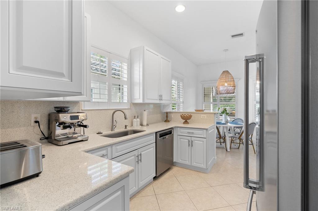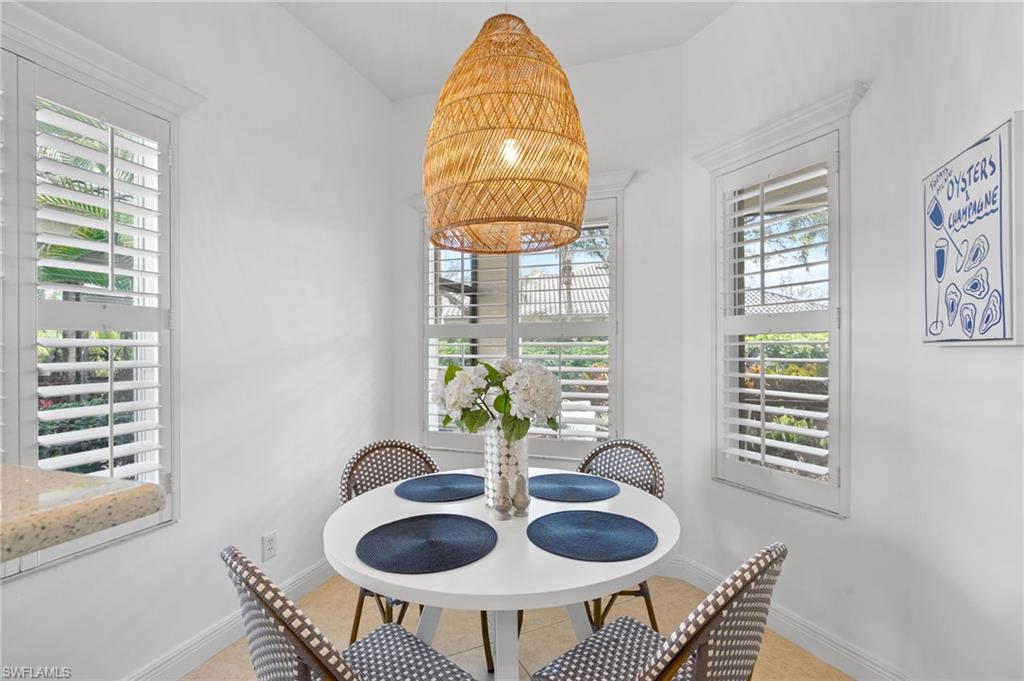 Welcome to this light-filled coastal contemporary villa in the charming community of Villa Vistana at The Vineyards. This inviting 4-bedroom, 2.5-bath residence features soaring 10-foot ceilings, plantation shutters throughout, and a thoughtfully arranged layout designed for comfortable living. The bright kitchen is beautifully appointed with quartz countertops and backsplash, Cornerstone cabinetry, a breakfast bar, and a separate breakfast nook for casual dining, while a formal dining room offers space for more traditional gatherings. Tile flooring runs throughout the main living areas, kitchen, and fourth bedroom/den, while the bedrooms feature warm engineered wood flooring. Designer light fixtures add a refined finishing touch. Walls of windows fill the home with natural light and open to a tiled, screened lanai overlooking lush, mature landscapingu2014an inviting spot for morning coffee or evening relaxation. Additional highlights include generously sized bedrooms and a spacious two-car garage. Ideally located behind the gates of The Vineyards and just minutes from Mercato, premier shopping and dining, and the sun-drenched Gulf beaches, this Villa Vistana home offers a wonderful combination of comfort, style, and location.