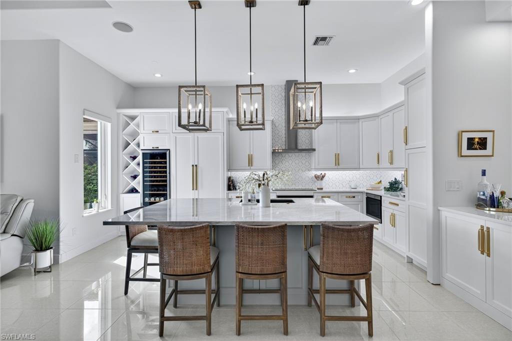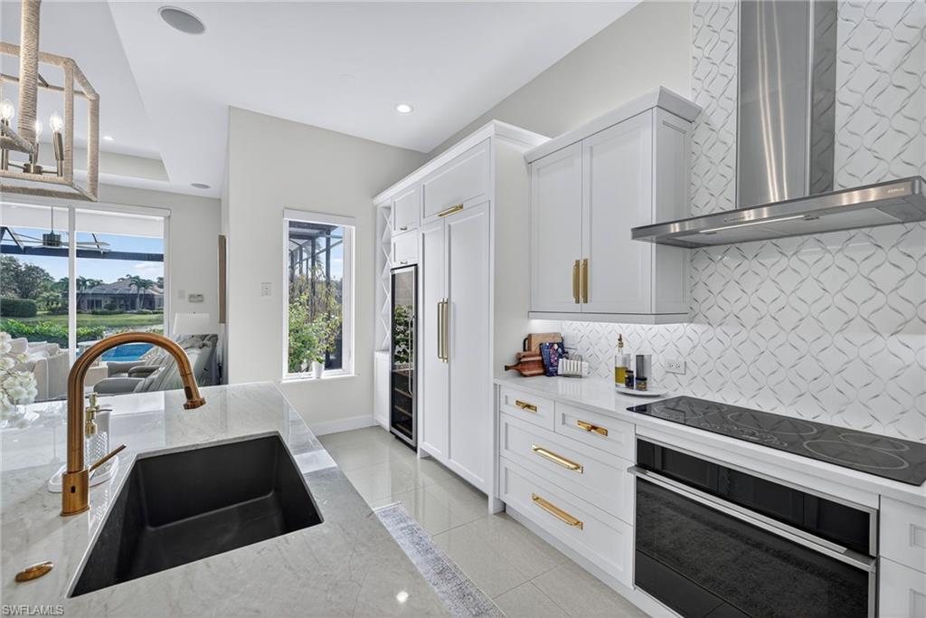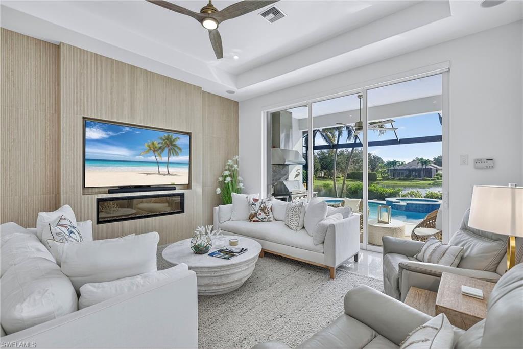 room floor plan showcases a custom feature wall with a Dimplex electric fireplace and flows seamlessly into the stunning chefu2019s kitchen featuring quartzite countertops, a panel-ready refrigerator, wine cooler, and newer stainless steel appliances. Step outside to the private outdoor kitchen with a professional-grade grill and refrigeration, surrounded by new travertine lanai pavers and refinished pool waterline tileu2014perfect for effortless outdoor living. Additional upgrades include newer A/C systems (2021), impact windows and doors, fresh interior and exterior paint, new landscaping, and a new roof scheduled for completion October 2025. Offered furnished for your convenience, this home combines sophisticated design with everyday comfort. Located in the gated Hammock Isles neighborhood of The Vineyards, with optional Vineyards Country Club membership, youu2019re minutes from Naplesu2019 world-class beaches, dining, and shopping. This home offers the perfect blend of luxury, lifestyle, and location.