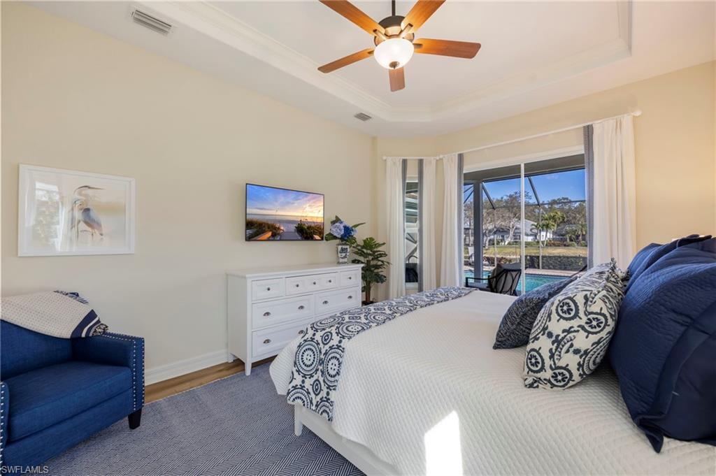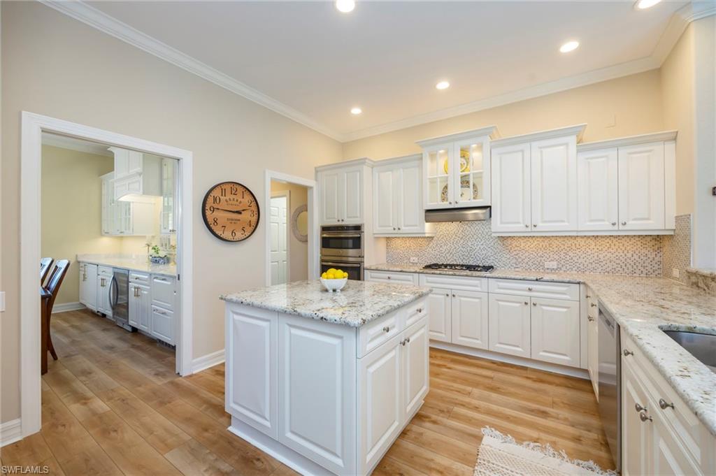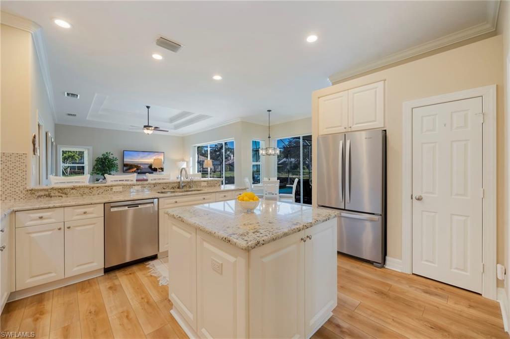 This pristine lakefront residence is located in the Wedgewood enclave of The Vineyards and has been thoughtfully updated and designed to suit a wide range of lifestyles. Offering four bedrooms plus a versatile den or office and three full baths, the home is perfectly positioned on a tranquil lakefront lot with a picturesque water feature. A well-designed floor plan welcomes you with formal living and dining rooms that flow seamlessly into the heart of the home, where the kitchen, breakfast nook, and family room create an inviting space for everyday living and entertaining. The upgraded kitchen is appointed with a Bosch gas cooktop and dishwasher, GE Profile wall oven, convection microwave, and a Whirlpool refrigerator, all set against transitional white cabinetry and granite countertops. Sliding doors lead to the screened lanai, where peaceful lake views provide the ideal backdrop for outdoor relaxation. The spacious primary suite features two walk-in closets and a well-appointed bath with dual vanities, a walk-in shower, and linen storage. Three additional guest bedrooms are complemented by two guest baths, one of which also serves as a convenient pool bath. Recent upgrades include two newer air conditioning systems (2021), water heater (2022), tile roof (2021), epoxy floor and overhead storage in garage, whole-house generator with a 500-gallon propane tank, impact-resistant windows, gutters, and Storm Catcher screens on the lanai, offering both comfort and peace of mind. Membership at the prestigious Vineyards Country Club is optional and provides access to an exceptional lifestyle, including 36 holes of championship golf, 12 Har-Tru tennis courts, 8 pickleball courts, bocce, a world-class Wellness Center and Spa, a resort-style pool with food and beverage service, multiple dining venues, and more. The clubu2019s newly renovated North Course has earned national recognition from Golf Digest as one of the countryu2019s most significant recent golf course redesigns.