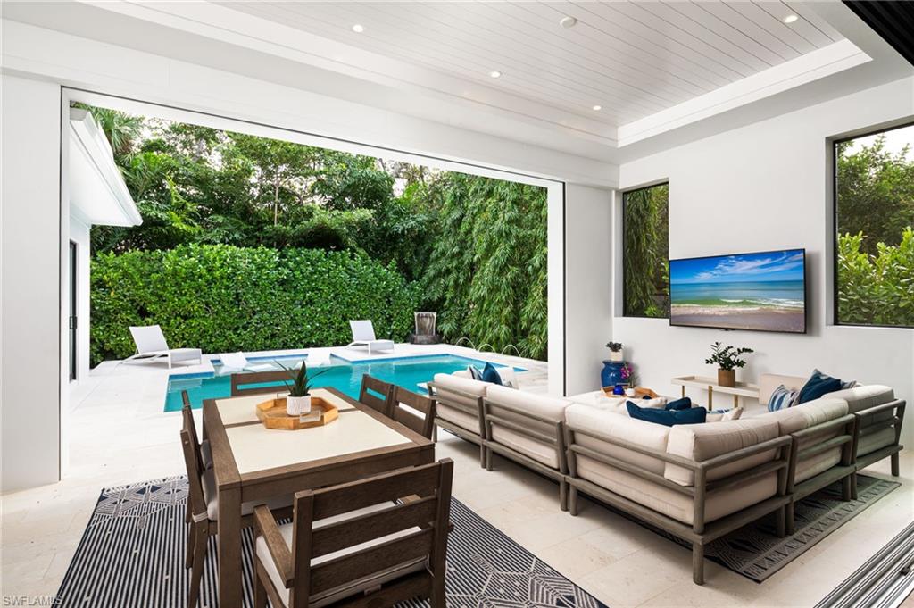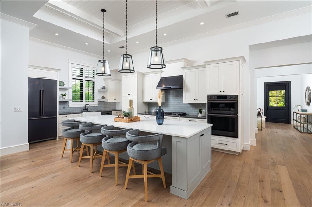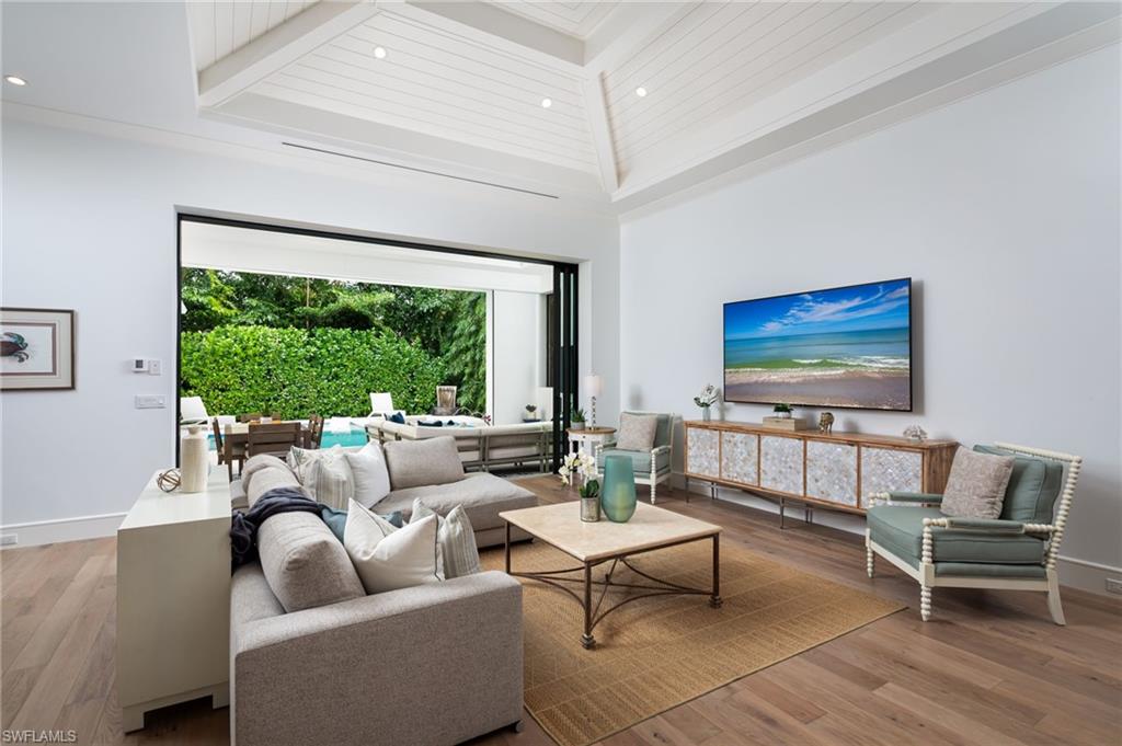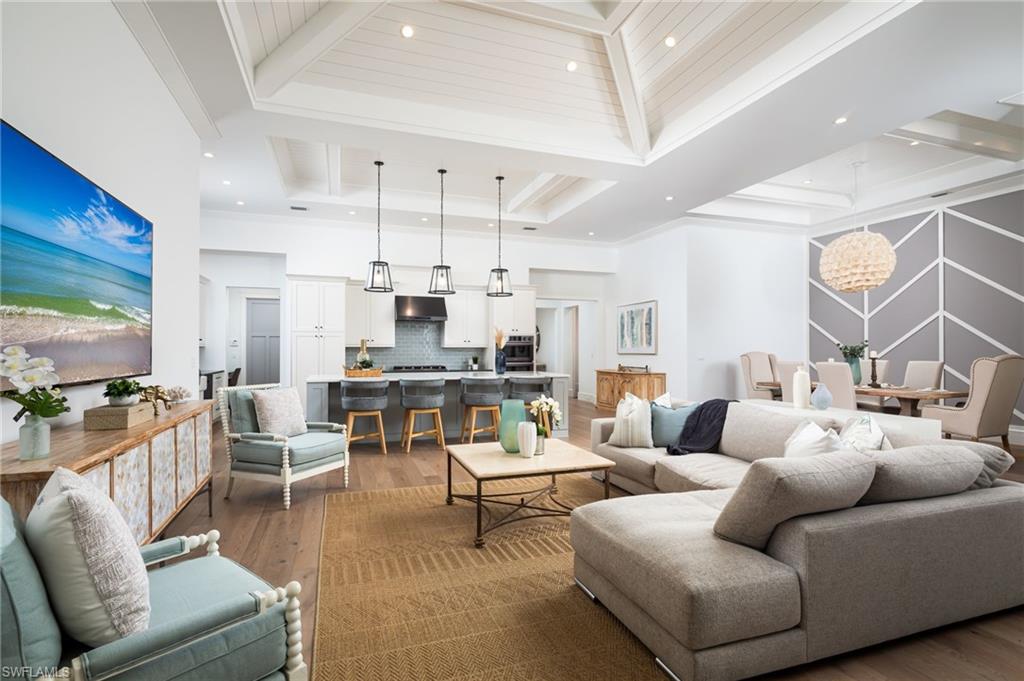 Thoughtfully designed by renowned architect Falconer Jones, this newer construction Lake Park home is just minutes to downtown Naples, with walkability to 5th Avenue and the beaches, offering modern coastal living with high-end finishes and seamless indoor-outdoor flow. The floor plan is ideal for entertaining and family gatherings, with wide-plank wood flooring throughout, designer tile, and curated finishes that give the home a clean, modern feel, while vaulted ceilings create volume and natural light across the main living spaces. The chefu2019s kitchen features custom KBC cabinetry, a large center island with pendant lighting, 36u201d gas cooktop, Samsung and Dacor appliances, and a wine cooleru2014designed for both everyday living and entertaining. The outdoor living space is a true highlight, featuring a south-facing gas-heated pool that enjoys sun all day, along with a water feature, covered lanai with roll-down screens, outdoor kitchen with gas grill, and outdoor showeru2014creating a private resort-style setting. Built with concrete block construction, PGT impact windows, and a standing seam metal roof for durability and peace of mind, along with an air-conditioned garage offering flexible use and added comfort. Located in the highly sought-after Lake Park neighborhood, just minutes to downtown Naples and 5th Avenue, in the heart of Olde Naples.