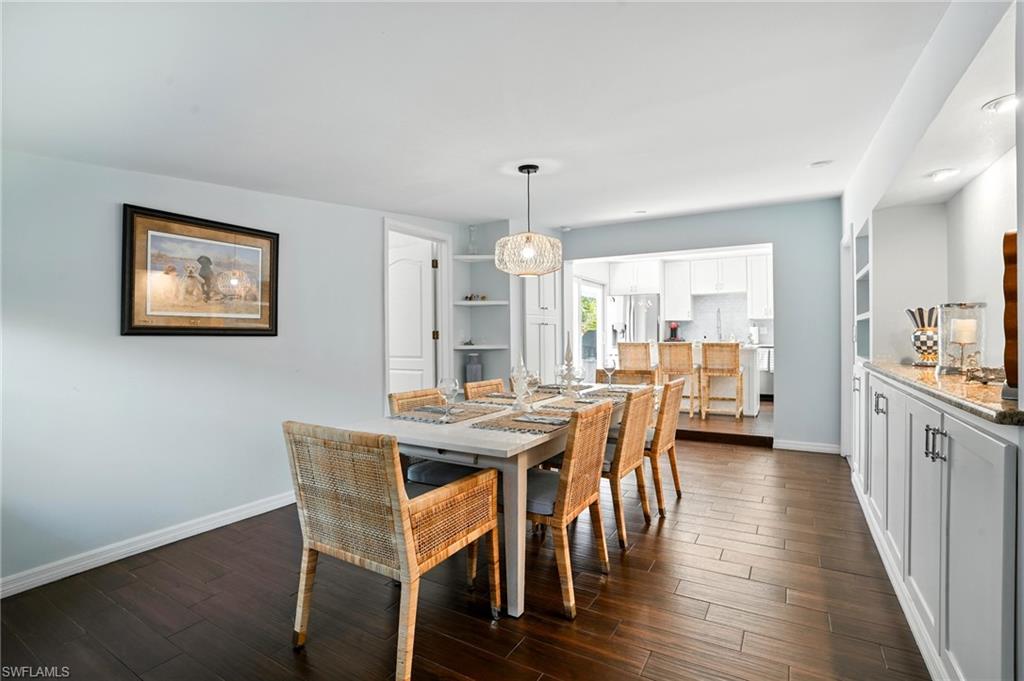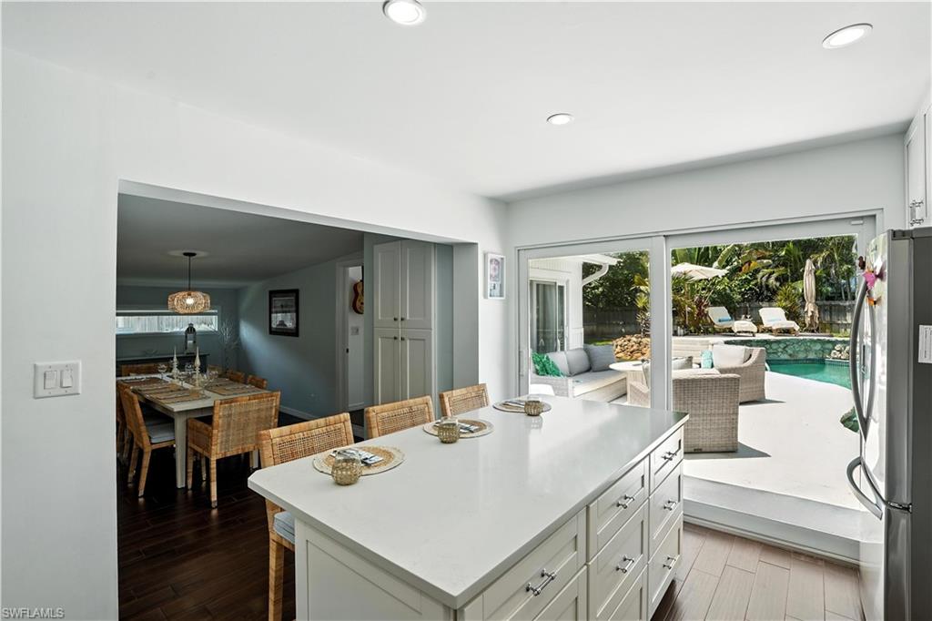 Welcome to this exquisitely updated 3-bedroom, 2-bath residence nestled within the highly sought-after community of Lakewood Park. Showcasing a refined blend of modern elegance and effortless comfort, this home has been thoughtfully curated with high-end finishes, enhancing it's original character while introducing a fresh, sophisticated feel throughout. Step inside to a light-filled, open-concept floor plan designed for both relaxed living and entertaining in mind. The beautifully appointed kitchen with a large island, quartz countertops and high end stainless steel appliances including a premium Electrolux rangeu2014perfect for the home chef who appreciates both performance and style. Spacious living areas flow seamlessly, the dining room is enhanced by custom built-in cabinetry, offering timeless elegance and functional appeal for hosting intimate dinners or lively gatherings.Outdoors, a private sanctuary awaits. The fully fenced backyard is a lush, tropical retreat, impeccably landscaped to create a sense of serenity and seclusion. Enjoy the ultimate in Florida living with a sparkling pool and spa, complemented by a retractable sunshade for effortless comfort while entertaining or relaxing on the back patio.Additional highlights include a mini-split system in the garage, providing a cool and comfortable space ideal for a home gym, workshop, or extra storage.Perfectly positioned in one of Naplesu2019 most convenient locations, just moments from premier shopping, fine dining, championship golf, and the pristine Gulf beaches, this exceptional property offers an unparalleled lifestyle defined by luxury, comfort, and coastal charm.