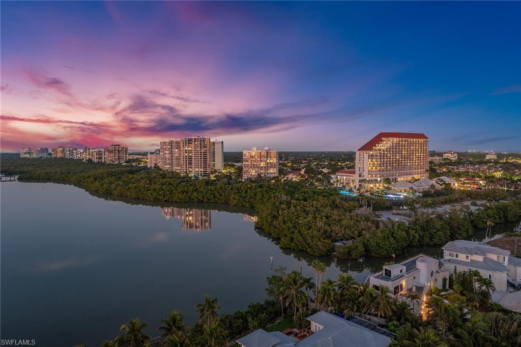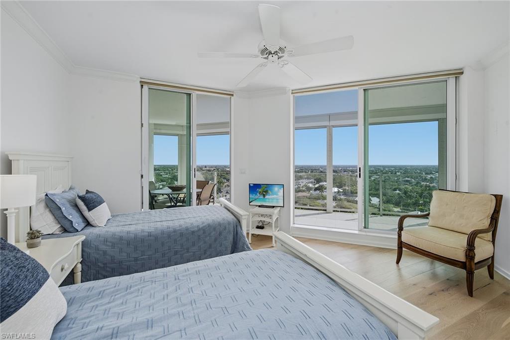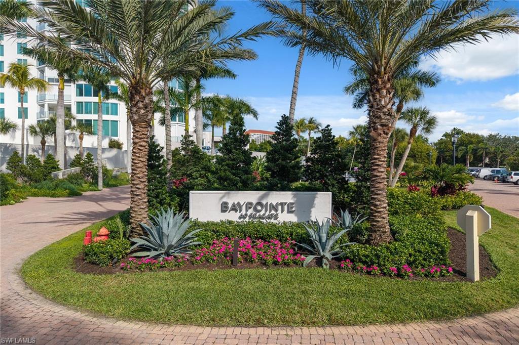 Experience breathtaking panoramic west-facing Gulf and Bay views, along with beautiful skyline vistas, from this stunning 16th-floor residence in the exclusive Baypointe at highly-regarded Naples Cay. Showcasing impressive views from every room and two expansive balconies, one facing the Gulf and Clam Bay, the other offering sweeping Venetian Bay and sparkling nighttime city views, this rarely available three-bedroom, three-full bath home delivers an unmatched luxury coastal resort lifestyle. A welcoming foyer with travertine flooring set on the diagonal and crown molding leads into the spacious living and dining area, where travertine continues, and floor-to-ceiling views frame the Gulf and Bay. A ceiling fan and large sliders that open directly to the west-facing balcony enhance the great roomu2019s inviting ambiance. The kitchen is beautifully appointed with granite countertops, a full granite backsplash, under-cabinet lighting, an island, bamboo flooring, and a tray ceiling. Premium appliances include a built-in refrigerator, dishwasher, 36-inch electric cooktop, built-in microwave, and wall oven with convection. An adjacent custom-built-in dry bar features wine storage, glass display cabinets, and a granite countertop, complemented by a built-in desk for added convenience. An under-counter wine refrigerator and direct access to the lanai further enhance the kitchenu2019s functionality and flow. The primary suite is a tranquil retreat with plank wood flooring, crown molding, a ceiling fan, and direct access to spectacular water views. The en-suite bathroom features a granite vanity with a makeup counter and a full-width mirror, a jetted Jacuzzi bathtub, a walk-in shower tiled from floor to ceiling, and a spacious walk-in closet with built-ins. Both guest bedrooms offer plank wood flooring, crown molding, ceiling fans, and balcony access, one with an en-suite bath featuring a floor-to-ceiling tiled tub-shower combo with glass enclosure, the other is adjacent to a beautifully appointed bathroom with a walk-in shower and glass enclosure, also accessible from the hallway. The laundry room offers bamboo flooring, built-in cabinetry, a utility sink, a top-load washer, and a front-load dryer. Additional features include electric aluminum roll-down shutters covering both balconies for storm protection, along with a covered garage parking space beneath the building and access to two community EV chargers. Perfectly positioned between Park Shore and Pelican Bay, Naples Cay offers private beach access, kayaks, and canoes available to residents from a private dock, moments from dining, shopping, and cultural attractions of Venetian Village, Waterside Shops, and Artisu2014Naples. Enjoy a library, social room, fitness room, tennis courts, and a pool and terrace undergoing a full renovation, with completion expected in mid-February 2026, promising an elevated coastal resort experience within this private, guard-gated beachfront community.