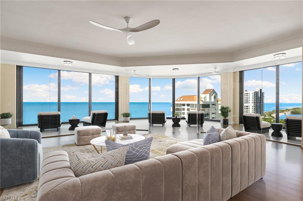 Ideally positioned on the 11th floor of the prestigious Seasons at Naples Cay, this three-bedroom plus den sky home showcases sweeping Gulf views and a spacious, residence-style layout. Step from your private elevator lobby into the expansive great room, where a dramatic wall of windows frames the coastline and 9+ ft ceilings combined with refined wood flooring create an inviting, airy ambiance ready for your personal design vision. The gourmet kitchen exudes coastal sophistication with white quartz countertops, a light tile backsplash, custom cabinetry, natural gas range, and abundant storage, all seamlessly flowing into the dining area and beyond. Designed for privacy, the split bedroom layout features a serene primary suite complete with dual walk-in closets, a generous spa-inspired bath, and unobstructed Gulf views. The separate guest wing includes two ensuite bedrooms and access to an eastern-facing terraceu2014perfect for sunrises. Additional highlights include newly replaced windows, two parking spaces, and two extra storage units. Behind the secure gates of Naples Cay, The Seasons offers world-class amenities: a resort-style pool with outdoor cooking and bar, a state-of-the-art fitness center, 24-hour security, and moreu2014delivering an exceptional coastal lifestyle.