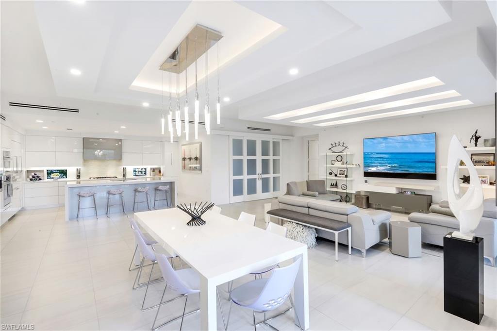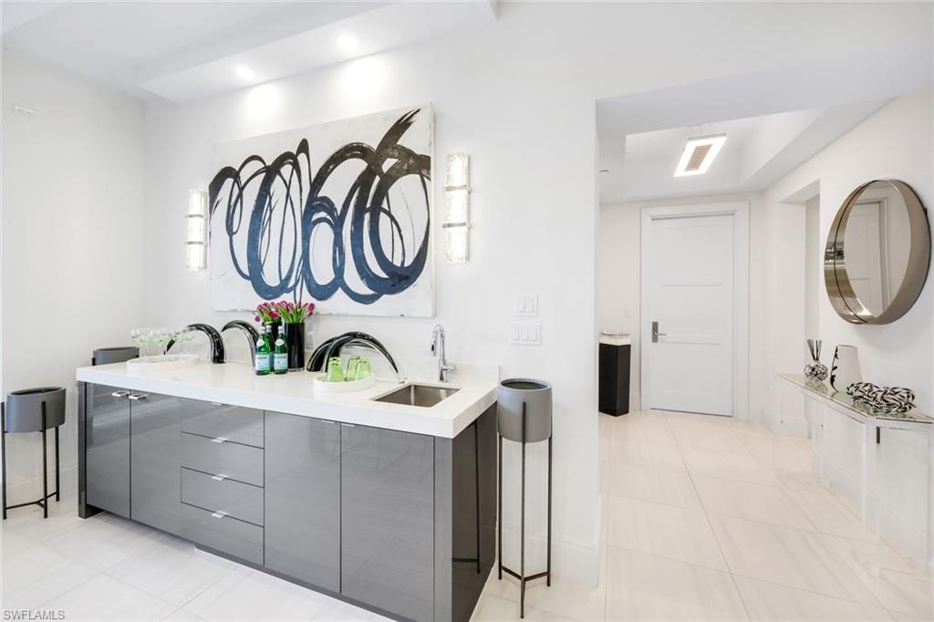 Rarely available southern-exposure, courtyard-level Emerson model featuring an extended lanai providing a total of 3,464 square feet of refined indoor-outdoor living. Thoughtfully designed with no detail overlooked, this residence welcomes you with an elegant foyer that makes a striking first impression, showcasing luxurious tile flooring, custom ceiling treatments, architectural return vents, and designer lighting that flow beautifully throughout the entire residence.The gourmet kitchen is a chefu2019s dream, appointed with premium appliances, including a gas cooktop, built-in wall ovens, and a dedicated Miele coffee station. Sleek white cabinetry is beautifully complemented by stunning quartz countertops, while a built-in wet bar with sink and wine refrigerator enhances both everyday living and entertaining.The same level of craftsmanship extends to the primary suite and two guest bedrooms, each offering a private ensuite bath and walk-in closet. A versatile den with custom frosted glass doors provides the perfect space for a home office or reading retreat.Additional highlights include two deeded garage parking spaces in the secured garage. Residents enjoy resort-style amenities, including a lush courtyard, pool and spa, fire pits, club room, and state-of-the-art fitness center. Ideally located in Naplesu2019 vibrant Design District, just steps from premier dining, shopping, cultural attractions, and the beautiful white sand of Naples.