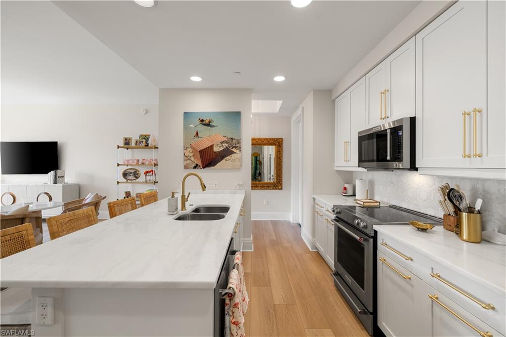 Unbeatable value in Naples Square! Presenting this aggressively priced gem in the highly acclaimed, amenity-rich Naples Square community, perfectly situated right in the heart of Downtown Olde Naples. This light-filled residence boasts a desirable Western exposure, providing breathtaking sunsets and a bright, inviting interior throughout the day. The thoughtfully designed split-bedroom floor plan is centered around an open-concept kitchen featuring ample storage, upgraded quartz countertops, custom backsplash, and newly enhanced cabinetry. Step onto the spacious patio for breathtaking sunset views, perfect for entertaining guests before strolling to the iconic 5th Avenue for an evening of fine dining and entertainment. Located just steps from the world-class amenities of Naples Square, this unit offers the ultimate in convenience and luxury. Schedule your private tour today and immerse yourself in the unmatched Downtown Naples lifestyle!