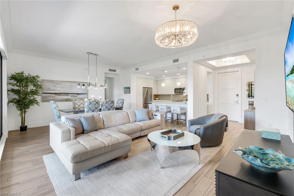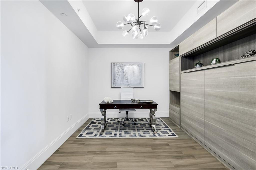PRICE IMPROVEMENT - Welcome to this beautifully maintained, turnkey-furnished condominium in the heart of the Naples Design District. Western exposure bathes the home in warm afternoon light, while lush palm trees surrounding the lanai create a private, tropical oasis. Inside, the spacious great room provides the perfect place to relax on the sofa or enjoy delicious meals with family & friends. A custom den is accessed through striking metal and frosted glass doors, offering an elegant space for a home office or relaxation. A thoughtfully designed California Closets built-in wall features a queen-size Murphy bed and integrated dresser, allowing the den to easily convert into an additional guest bedroom. The bathrooms have been tastefully upgraded with custom tile finishes and glass door enclosures, enhancing both style and functionality. Naples Square residents enjoy an exceptional array of amenities, including a resort-style pool and spa, a fully equipped fitness room, and secured underground parking for two vehicles. Ideally located and surrounded by Naplesu2019 finest restaurants, shops, parks, and cultural attractions, this residence offers a vibrant lifestyle with unparalleled convenience. This exquisite condo presents a rare opportunity to enjoy upscale living in one of Naplesu2019 most desirable neighborhoods.