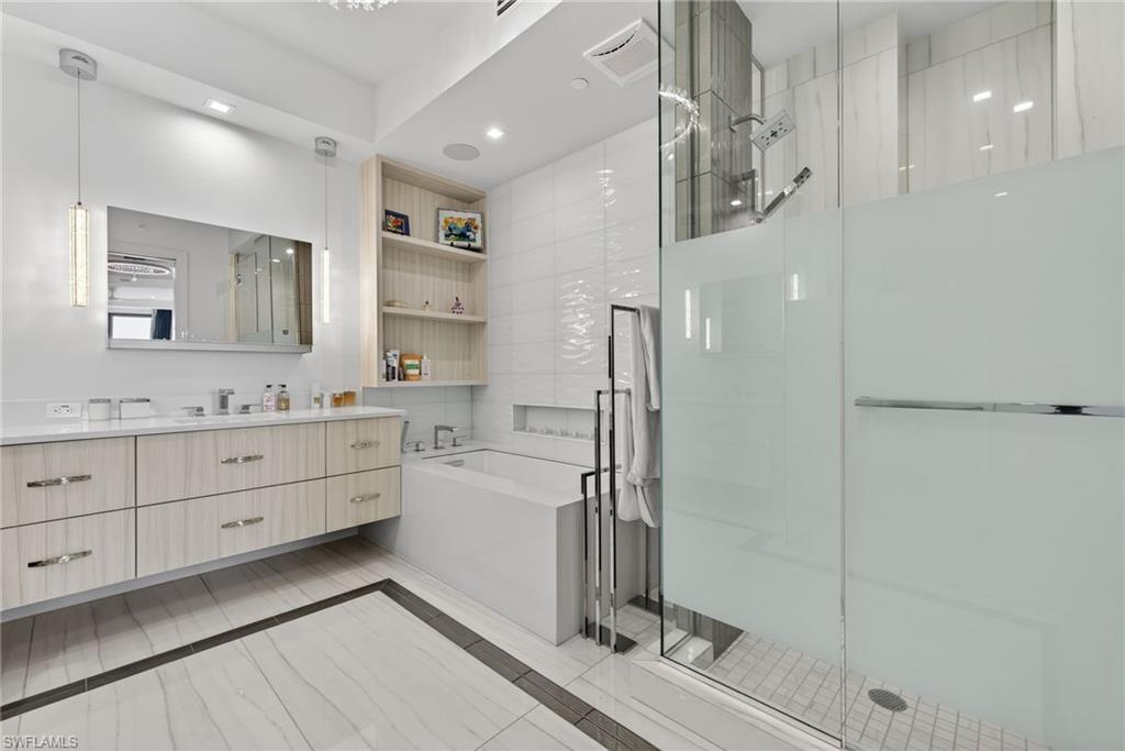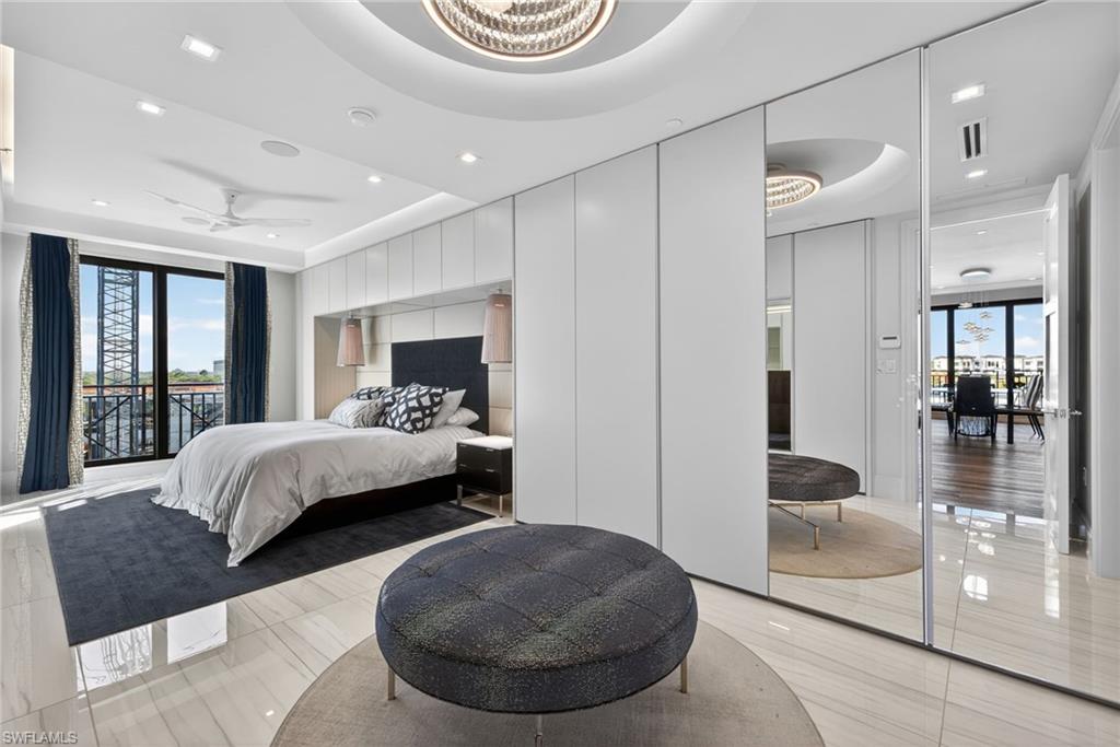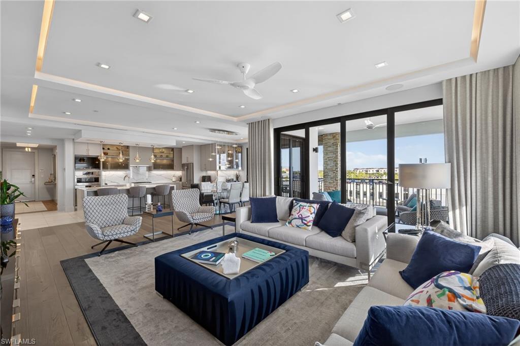 A rare northeast corner Penthouse featuring the Dover floor plan, set atop the 5th floor of Naples Square, delivers light-filled luxury, exceptional privacy, and the comfort and scale of a single-family home without the maintenanceu2014all within a premier downtown lifestyle in Olde Naples. Acclaimed dining, coffee shops, cultural venues, and the white-sand shores of the Gulf of Mexico are within effortless reach. Adding to the exclusivity is a private, enclosed two-car garage, fully tiled and equipped with a refrigerator and rack storage. Inside, every detail has been thoughtfully curated. Extensive designer and engineering upgrades create a residence that is as technically sophisticated as it is visually striking. Italian Poliform cabinetry, furnishings, and closet systems are found in the bedrooms and den, offering cultured contemporary elegance and timeless craftsmanship, including his-and-her safes integrated into the custom primary closet system. Custom-designed ceilings with dramatic low-voltage LED cove lighting and linear slot diffusers add architectural distinction, while Control4 home automation seamlessly integrates lighting, audiovisual, and Ruckus WAPs systems. Surround sound enhances the living room, with additional built-in speakers in the primary bedroom, primary bathroom, kitchen, and lanai, creating a seamless audio experience throughout the home. A full alarm system provides added security and peace of mind. Premium features continue throughout, including Haiku ceiling fans, Somfy blackout electronic blinds, a whole-home Halo water filtration system and hot water recirculation pump, integrated dehumidifier, recessed Robern medicine cabinets, wine refrigeration, additional custom cabinetry, and Schlage electronic entry. The chefu2019s kitchen is outfitted with Bosch appliances, blending sleek modern design with exceptional performance, and features a statement island with pop-up 110V electrical receptacles and integrated USB ports. Resort-style amenities include a pool with ledge loungers, spa, an expansive pavilion with shaded communal dining and grilling areas, state-of-the-art fitness center, a well-appointed social room featuring a catering kitchen, and more. Low quarterly condo fees further enhance the appeal of this exceptional offering. Offered fully furnished, this penthouse sanctuary represents a rare convergence of luxury, location, and lifestyle at the very top of Olde Naples.