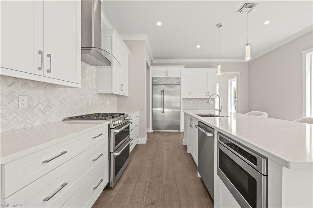 LAST CHANCE PROPERTY! Neighboring sister house 1136 is now SOLD! Stunning New Construction Home, nestled just a mile from the pristine beaches of Naples along the Gulf of Mexico, offering exceptional coastal living. Built into X-500 zone, over 14 feet above sea level! Two beautiful brand-new properties offered side by side 1134 & 1136 Trail Terrace! Conveniently between US-41 & Goodlett-Frank. This nearly 2500 sq. ft. residence is thoughtfully designed with an open-concept floor plan, featuring 3 spacious bedrooms, an office/den, 3.5 baths, high ceilings, pool, summer kitchen and a large two-car garage. High end finishes include beautiful hardwood floorings, shiplap finishes, chefu2019s kitchen showcases a quartz countertop island, pendant lighting, GE Cafu00e9 stainless steel appliances, gas cooktop, a Zephyr exhaust hood, soft-close custom cabinetry, a spacious pantry and a tasteful chevron marble tile backsplash, tankless water heater, security system and more. City water and sewer. Situated in the vibrant and growing Naples area, this property is only 3 miles from the renowned 5th Avenue and even closer to the upscale Waterside Shops, known for its fine dining and luxury shopping. The first-floor master suite serves as the perfect retreat, with access to a covered lanai and a beautiful, oversized pool designed by Nassau Pools, ideal for relaxing or entertaining with southern rear exposure for maximum sunshine. The adjoining master bath boasts a freestanding soaking tub, a multi-head shower, dual vanities, and an expansive walk-in closet. On the second floor, two guest suites provide privacy and comfort, each with its own ensuite bathroom and walk-in closet, ensuring ample space for family or visitors. This home is built by Trademark Development Group, renowned for its attention to detail and high-quality craftsmanship. Itu2019s equipped with PGT impact windows and doors, prewiring for advanced technology options, and a monitored central station alarm system for added security. Other notable features include a tankless hot water system, irrigation system, propane gas, fully fenced backyard. No HOA fees or restrictions. Whether you're looking for a full-time residence or a luxurious vacation home or high-income vacation rental this property offers a blend of sophistication, comfort, and convenience in one of Naples' most sought-after locations.
