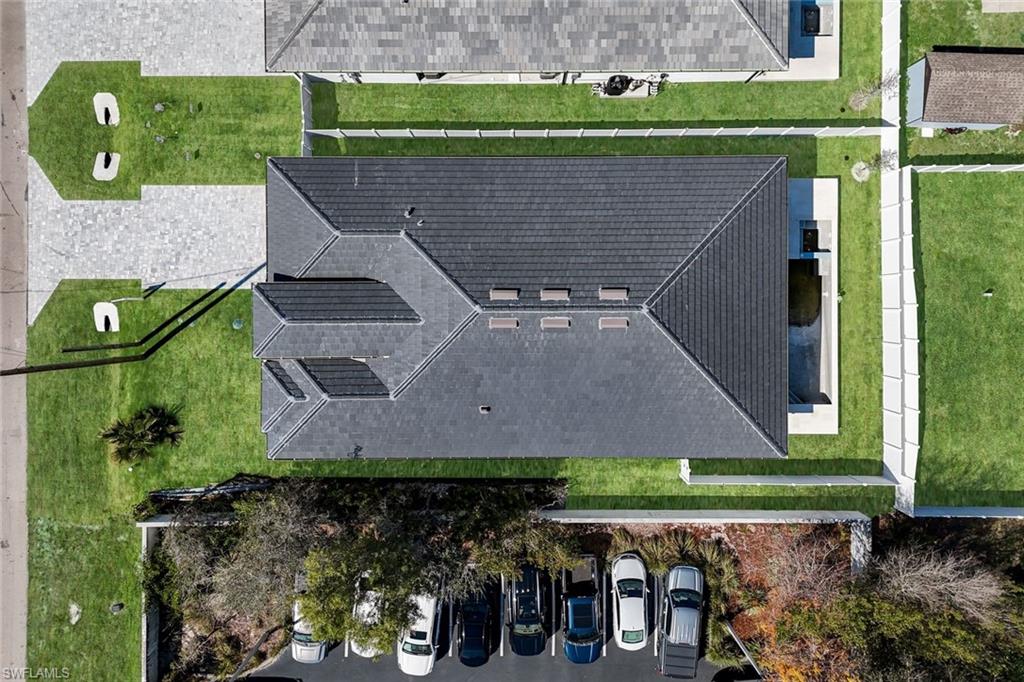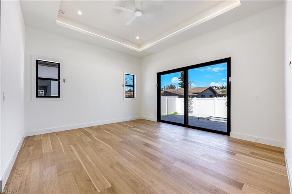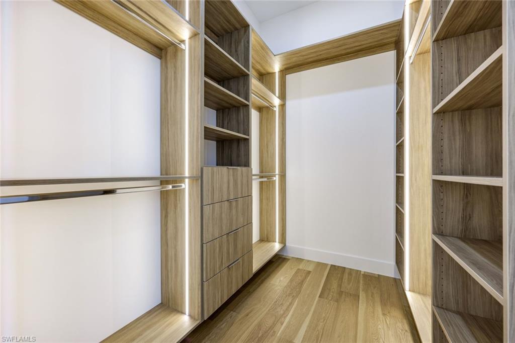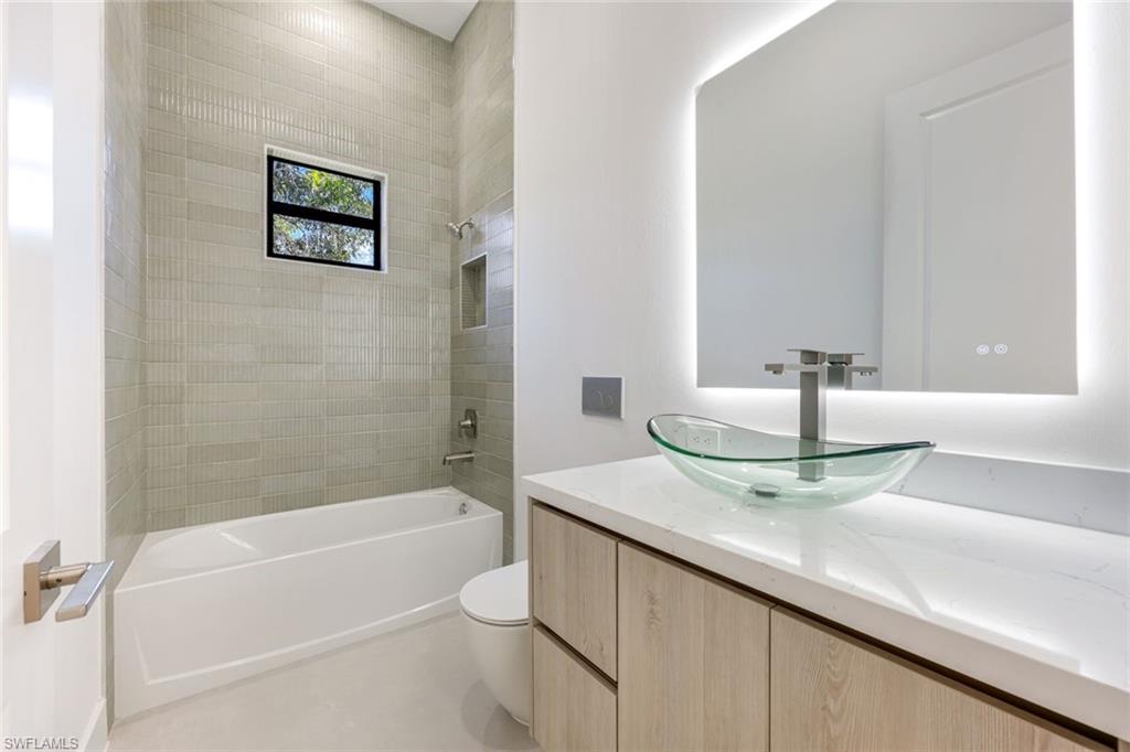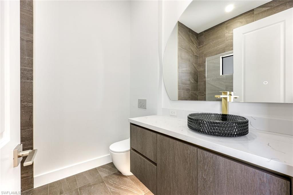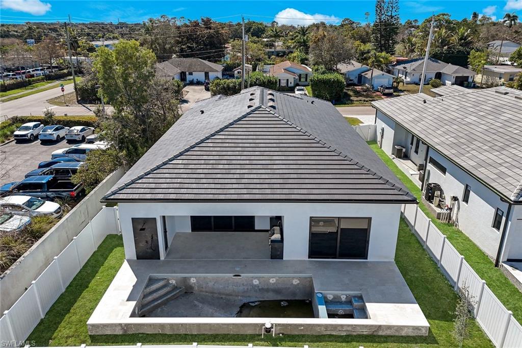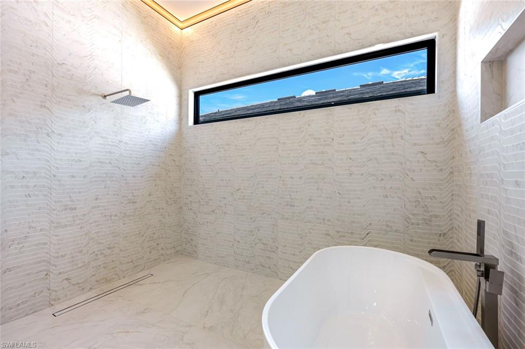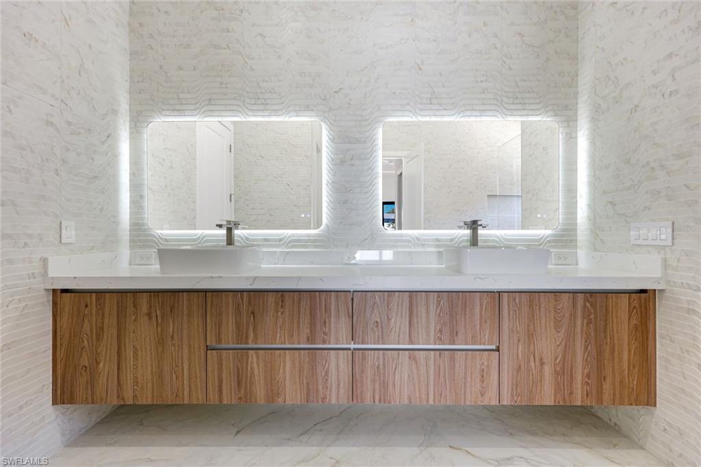 Experience refined modern living in this exceptional new construction residence, thoughtfully designed with high-end finishes and sophisticated architectural details throughout. Featuring clean contemporary lines and a striking elevation, this home makes a bold first impression with its flat tile roof, oversized impact windows and doors, and sleek two-car garage. Inside, an open-concept floor plan is complemented by soaring ceilings, wide-plank wood flooring, and designer lighting. The gourmet chefu2019s kitchen is a true showpiece, boasting custom full-height cabinetry in a rich designer hue, quartz countertops with waterfall-edge island, Bosch stainless steel appliances, pot filler, and elegant gold hardware. The expansive island with wood accent paneling and under-cabinet lighting creates the perfect setting for entertaining. The luxurious primary suite offers a spa-inspired experience, complete with a custom walk-in closet featuring built-in shelving and ambient LED lighting. Bathrooms are appointed with modern floating vanities, textured wall finishes, and sleek contemporary fixtures. Seamless indoor-outdoor living is achieved through wide pocketing sliding glass doors that open to a covered lanai with a full outdoor kitchen, built-in grill, sink, and beverage refrigerator. The private fenced backyard includes a custom pool and spa, creating your own resort-style retreat. Designed with comfort and efficiency in mind, this home offers impact-resistant windows and doors, premium finishes, and meticulous craftsmanship throughout. Ideally located in Naples, this property combines modern elegance, quality construction, and Florida lifestyle living at its finest.