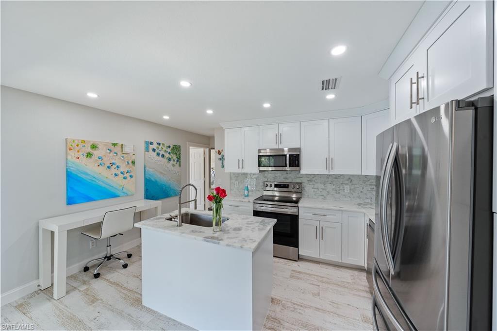 Beautifully renovated and turnkey furnished, this Westlake gem offers the perfect blend of style, comfort, and location. Featuring a saltwater heated, caged pool, this 3-bedroom, 3-bath home has been thoughtfully updated with an open-concept floor plan, new kitchen with center island, and plank tile flooring throughout. The primary suite features a king bed, with queen beds in both guest rooms, and all three bathrooms have been fully renovated with a spa-inspired feel. Designer furnishings from Ethan Allen, Arhaus, Clive Daniel, and Restoration Hardware complete the space. Enjoy morning coffee on the lanai, afternoons by the pool, and Naples sunsets in your private oasis. Ideally located just 1.5 miles to the beach and close to Clam Pass, Venetian Village, Waterside Shops, and 5th Avenue South. A two-car garage with epoxy flooring adds convenience, along with nearby dining, shopping, golf, tennis, and biking. A perfect full-time residence, seasonal retreat, or ideal property to enjoy while building or renovating nearby. Come Live Your Dream Naples!