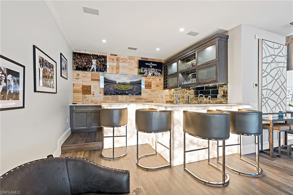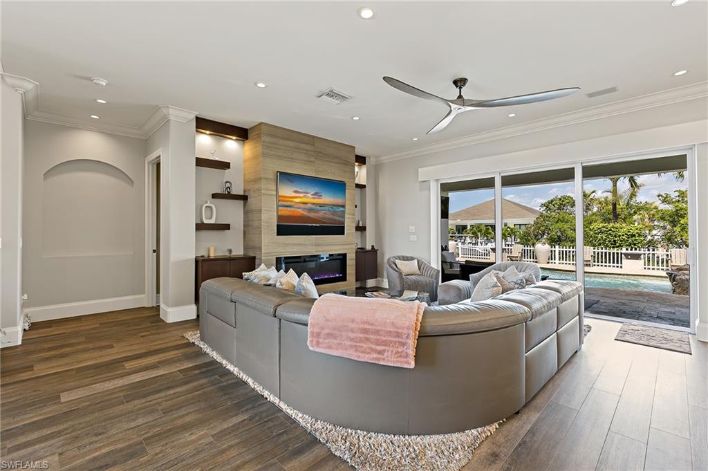Located in the prestigious waterfront community of Golden Shores in Naples, this exquisite 4 bedroom plus den, 4 bath home is the perfect annual rental for those seeking luxury and comfort. The open concept living area is flooded with natural light, featuring a cozy wall fireplace, elegant LVF floors, and a spacious sectional ideal for relaxing or entertaining. The gourmet kitchen is a chefu2019s dream, complete with Sub-Zero refrigerator, GE Monogram induction cooktop, dual islands, quartz countertops, double wall ovens, a built-in coffee machine, and counter-height seating. A separate dining area boasts a 250-bottle wine cooler, perfect for hosting dinners with family and friends. Entertain in style at the stunning wet bar with designer lighting and chic bar stools. The primary suite offers a king-sized bed, dramatic coffered ceilings, and an oversized custom walk-in closet. The spa-like primary bath features a double vanity, vanity desk, soaking tub, and walk-in shower, creating the ultimate retreat. Upstairs, guests enjoy spacious accommodations, two rooms with full-sized beds and one with a queen bed, along with a family room featuring a large leather sectional, poker table, and big-screen TV. A dedicated media room with multi-level oversized seating provides the perfect space for movie nights or relaxation. Just outside is an unparalleled outdoor living space with a resort-style pool complete with a slide and spa, plus a full outdoor kitchen and bar overlooking the canal with direct Gulf access. The home also includes a boat dock and a 30K boat lift, ideal for boating enthusiasts. Residents of Golden Shores enjoy a lifestyle of convenience and charm, with nearby access to pristine white sandy beaches, local events, scenic trails, and the shops and restaurants of 5th Avenue or 3rd Street. Live exceptionally in Golden Shores!