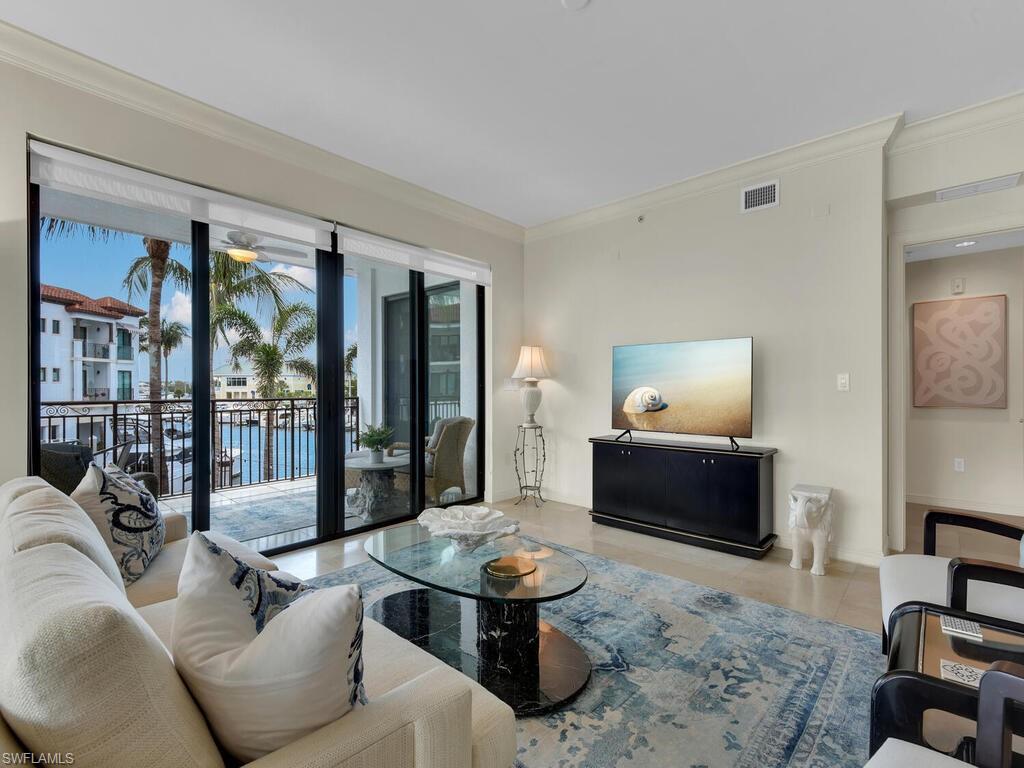 Live in ultimate waterfront luxury with fabulous resort amenities in the heart of downtown Naples! This condo is ideally located within the Naples Bay Resort Residences waterfront complex offering spectacular water views from walls of windows on both sides. An open floor plan features a gourmet eat-in kitchen with Wolf appliances and high top kitchen table that opens to the living room and sitting area, ideal for taking in all the water views! The spacious balcony terrace has both a two top cafe table for outdoor dining and comfortable club chairs for lounging. As to amenities, the Naples Bay Residences II condo building has its own private pool right downstairs, or you can enjoy the three resort style pools at the Naples Bay Club, which in addition to the pool complex (which has a zero entry free form pool with waterfall, hot tub, lap pool, lazy river, and separate adults only pool and hot tub) offers cabana rentals, poolside bar and dining, a state of the art fitness center, full service spa, beach shuttle, and 6 Har-Tru tennis courts. Just downstairs, you will also find the Naples Bay Resort marina offering boat rentals and additional on-property dining at restaurants.