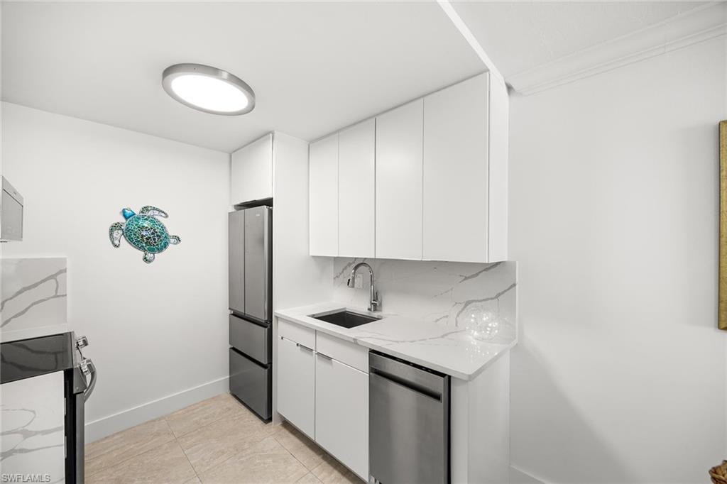 Enjoy serene Royal Harbor waterfront living where sparkling canal views, passing boats, and modern design create an exceptional Naples coastal retreat just minutes from Old Naples world-class beaches, shopping and dining. Set along a scenic canal in prestigious Royal Harbor, this beautifully reimagined residence delivers refined waterfront living with tranquil views and exceptional upgrades. Extensively remodeled, the light-filled interior showcases impact glass windows, fresh paint, and a stunning new kitchen featuring quality cabinetry, stainless appliances and quartz countertops. Porcelain tile flows seamlessly through the residence, complemented by designer light fixtures that enhance the homeu2019s clean, contemporary aesthetic. Renovated baths and thoughtfully curated finishes create a sophisticated, low-maintenance environment for a move-in ready experience. Ideally in a desired corner location closest to the canal, the residence enjoys additional end-unit windows that fill the home with natural light and enhance its bright, airy atmosphere. The thoughtfully designed floor plan includes two spacious bedrooms and two fully renovated baths, with quartz surfaces carried throughout for a cohesive and refined finish. A designated parking space and private storage room provide added convenience, offering ideal space for beach equipment, bicycles and recreational gear. Exterior updates have recently been completed to enhance the propertyu2019s appeal as the ultimate coastal retreat. Outdoors, Chesapeake Manor enjoys a tranquil waterfront setting where an angled canal view creates an ever-changing backdrop of sparkling water and passing boats. The screened, under-roof lanai overlooks the pool and canal, creating a setting for sparkling, sunny afternoons. Residents can watch the boats glide by, fish from the seawall, or relax beside the beautiful sunny pool and lounging deck with umbrellas. The outdoor living space is enhanced by a private courtyard atmosphere and lush landscaping, creating a serene setting for quiet enjoyment and effortless entertaining. Chesapeake Manor is a private, low-density waterfront enclave with just 16 residences, offering an intimate coastal lifestyle in one of Naples desirable locations. Royal Harbor is one of Naples desirable waterfront neighborhoods, ideally just minutes from downtownu2019s renowned 5th Avenue South and 3rd Street South districts, offering world-class dining, shopping and white sand Gulf beaches. Residents enjoy a relaxed coastal lifestyle with boating access, quiet residential streets, and exceptional proximity to Naplesu2019 cultural and social amenities. Whether for a weekend retreat for Naples residents or travelers from afar, or an exceptional opportunity to enjoy full-time waterfront living, this residence presents a rare opportunity to experience Naples lifestyle with the ease, beauty and peace of mind of extensive modern updates.