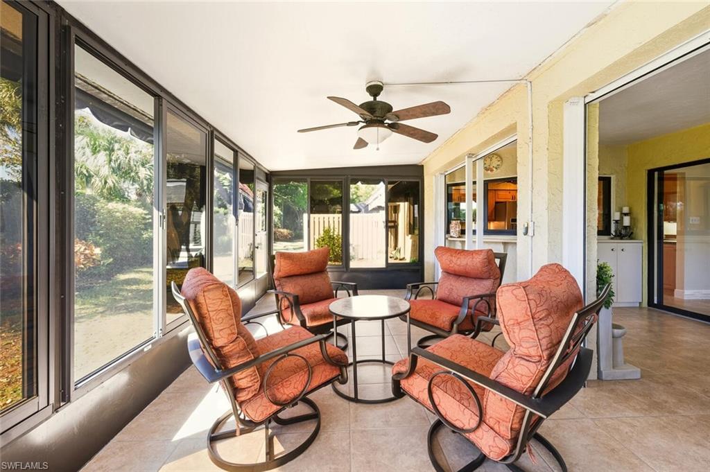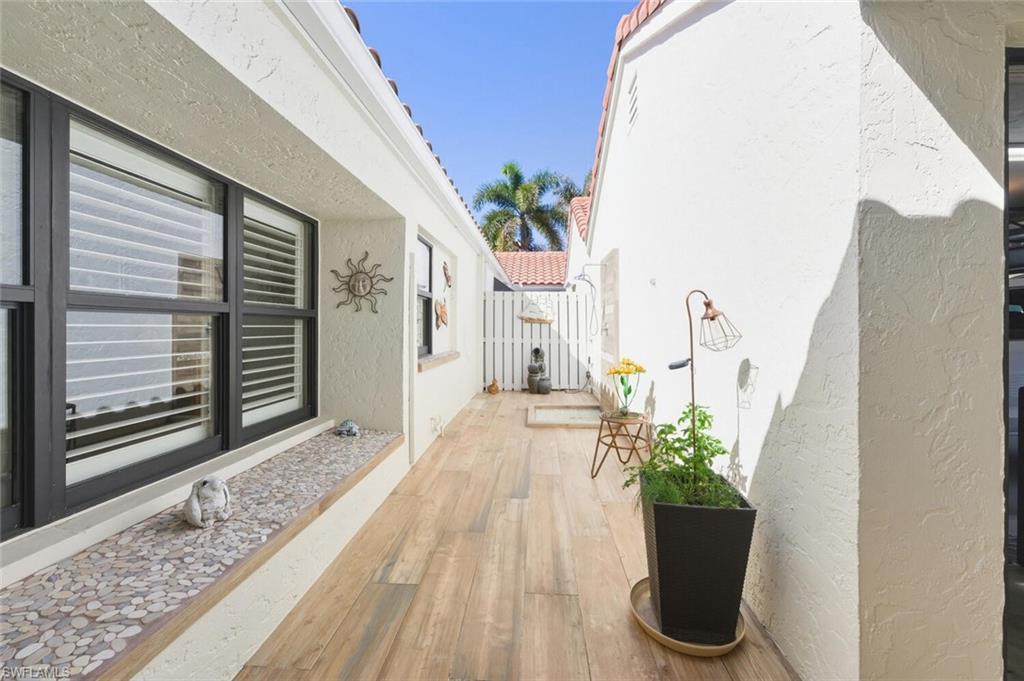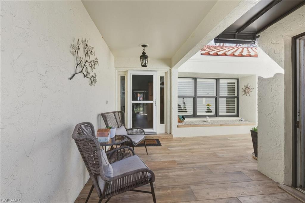 This home has been thoughtfully upgraded from top to bottom, blending long term durability with timeless style and comfort. From the moment you walk in it is easy to see the level of care that has gone into every improvement. The exterior enhancements, structural updates and interior finishes all work together to create a property that feels polished, practical and move-in ready and is being sold furnished. Every major system has been addressed and every detail contributes to a home that is both beautiful and functional for everyday living or seasonal enjoyment. Updates include: polybutylene piping replaced, electric up to code, hot water moved to garage, a beautiful outdoor shower finished with porcelain tile imported from Italy, nonslip tile in courtyard, new gutters and gutter guards, extended lanai with raised floor and removable windows, hurricane windows and door, remodeled primary bathroom with newly remodeled no glass walk in shower, electric hurricane shutters, remodeled kitchen with all wood cabinets, enclosed closet in guest bedroom, plantation shutters, new baseboards and paint and more. Furniture in both bedrooms is from Rob & Stuckey, dining room table & chairs are from Tommy Bahamas and the lanai is from Elegant Outdoor.