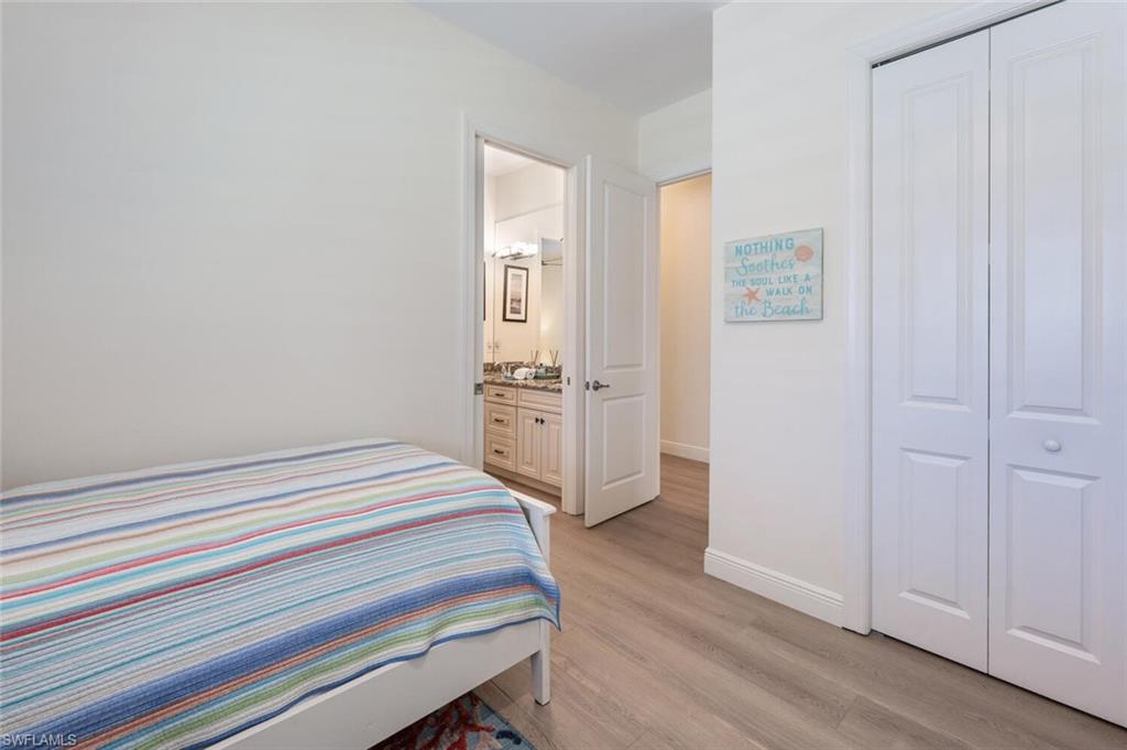 Unique courtyard home offering 3 bedrooms, 2 and a half baths, 2 car garage, pool & fully fenced yard. The open-concept layout features wood look flooring that flows effortlessly throughout with style and functionality. A gourmet kitchen takes center stage featuring an island with generous seating, stainless steel appliances, white shaker cabinets complimented by granite counters, is the perfect place to cook and entertain. Two spacious guest bedrooms adjoined by a jack and jill bath. The primary suite overlooks the pool, creating a tranquil retreat, featuring a large glass shower, dual sinks, his and hers closets. Features throughout the home include 10ft ceilings, crown molding, wood-look floors, plantation shutters, designer lighting & fans, impact doors & windows throughout. Back yard features a 36' X 28' deck perfect for relaxing and entertaining. Located less than 1 mile to Vanderbilt Beach and Wiggins Pass State Park as well as upscale shopping and dining at Mercato.