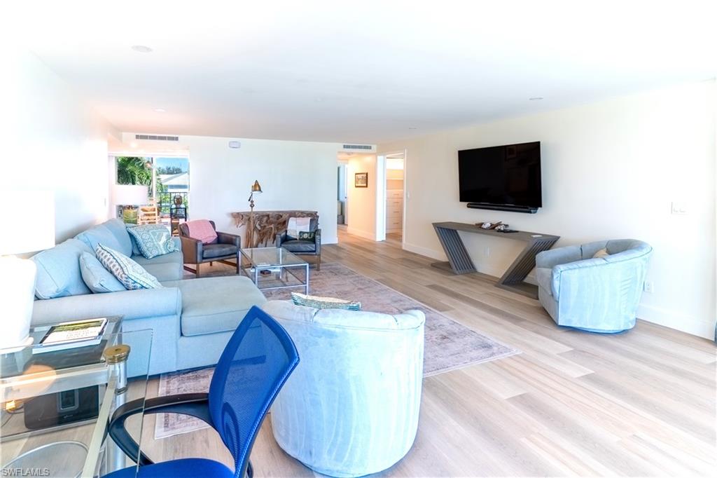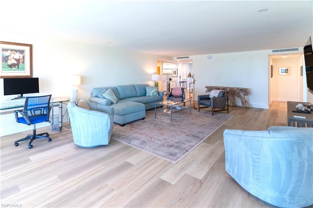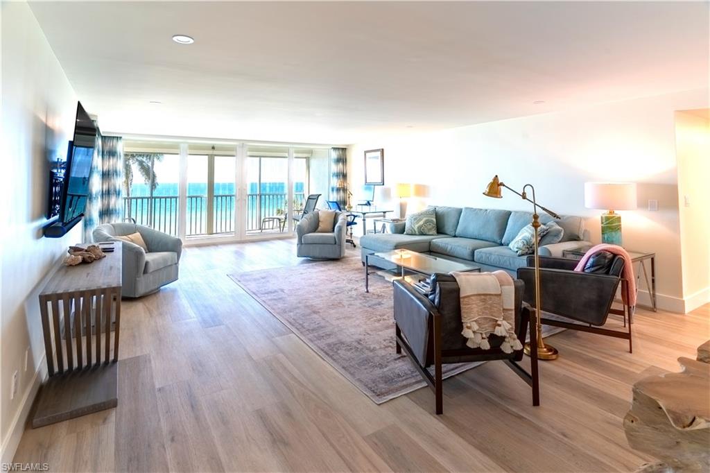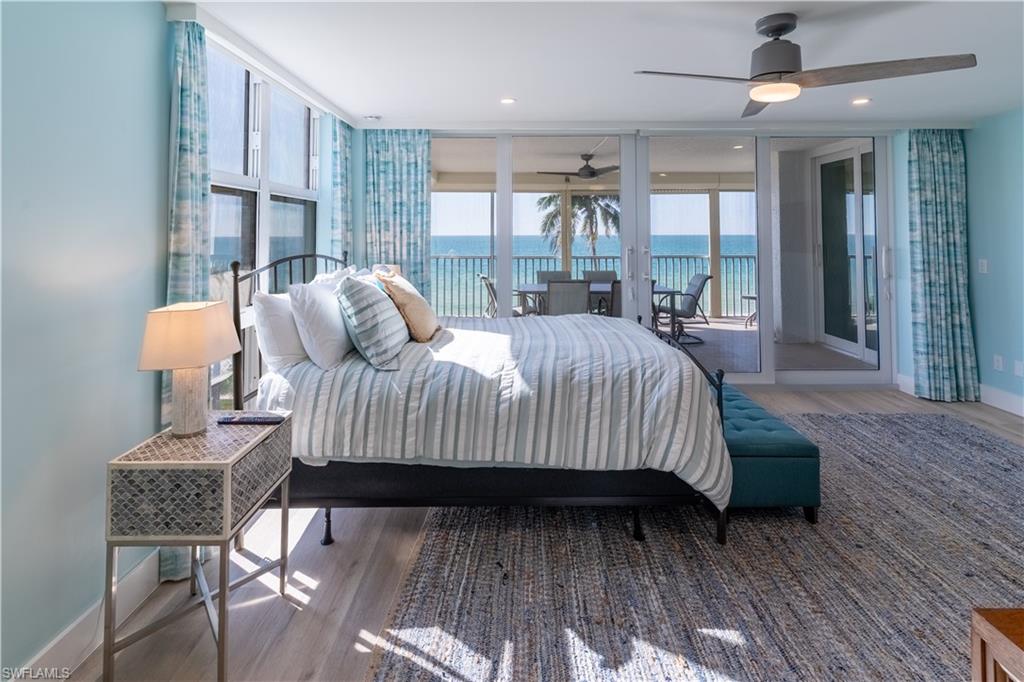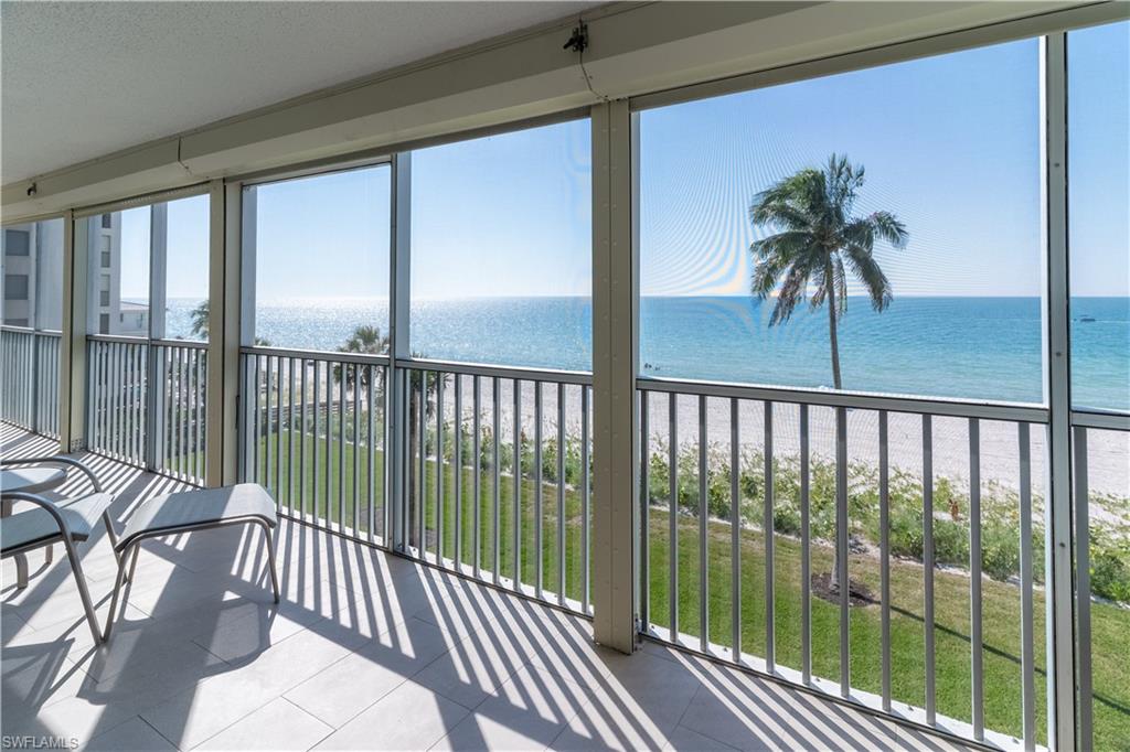Experience the rare privilege of direct beachfront living on Vanderbilt Beach in this expansive 3-bedroom, 2-bath corner residenceu2014perfectly positioned on one of the most tranquil and private stretches of shoreline. Oriented southwest to capture sweeping Gulf and Bay vistas, this nearly 2,500 sq. ft. residence brings the outdoors in with floor-to-ceiling impact glass (installed 2023) and multiple balconies designed for seamless indoor-outdoor living. Remodeled in 2021, this stunning coastal home captures the sunshine, sand, and sea with exceptional harmony. Sunset skies pour into the oversized great room and primary suiteu2014both facing the Gulfu2014with a wall of sliding glass that frames the horizon like art. From dawn to dusk, natural light fills the home, while additional eastern exposure offers a striking perspective over the Vanderbilt Channel. This open and airy layout is offered turnkey furnished, complete with a separate cabana with a Gulf view (an extremely rare feature), deeded with the property, and a designated storage unitu2014valuable conveniences for beachfront ownership. Vanderbilt Shores, a gated community, recently completed renovations to both the Barcelona and Seville lobbies, delivering an elevated transformation and a fresh, modern coastal luxury aesthetic. Located just one mile from LaPlaya Beach & Golf Resort, The Turtle Club, and The Ritz-Carlton, and minutes from Mercato where world-class dining and shopping await. A genuine one-of-a-kind Gulf-front offeringu2014where the sound of waves, endless sunsets, privacy, and sophistication come together to create a lifestyle that is truly paradise.